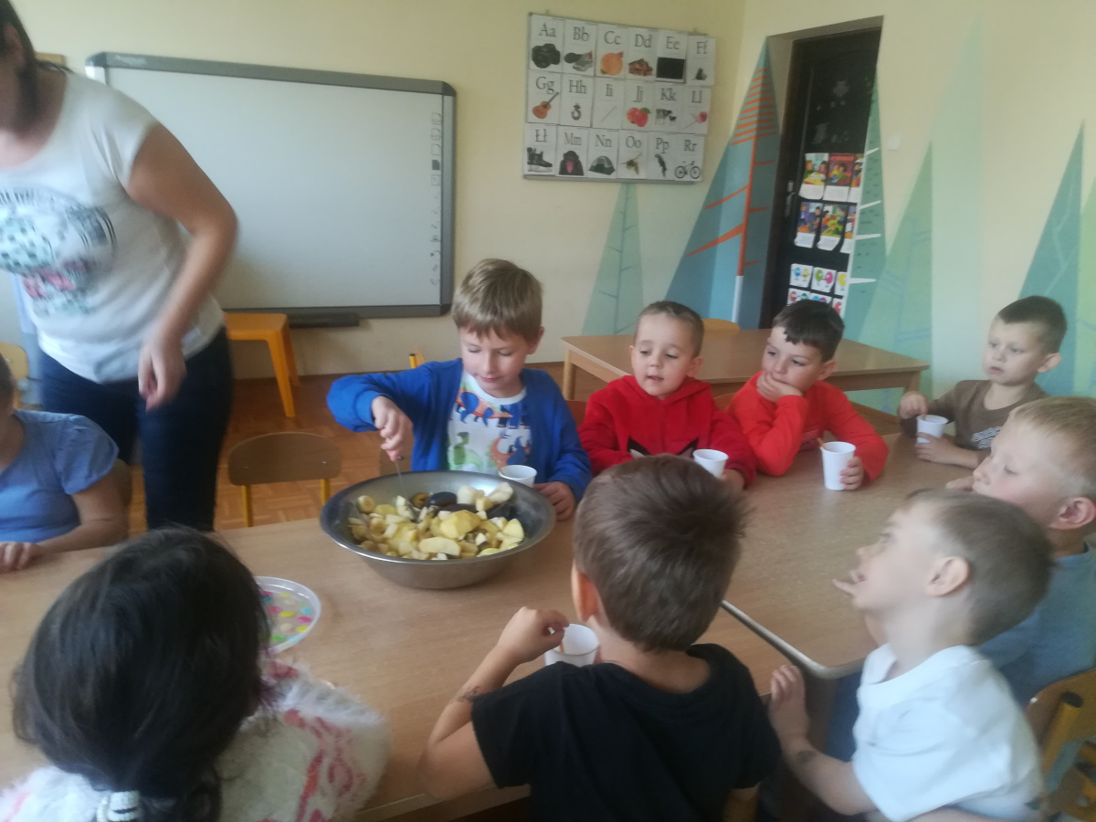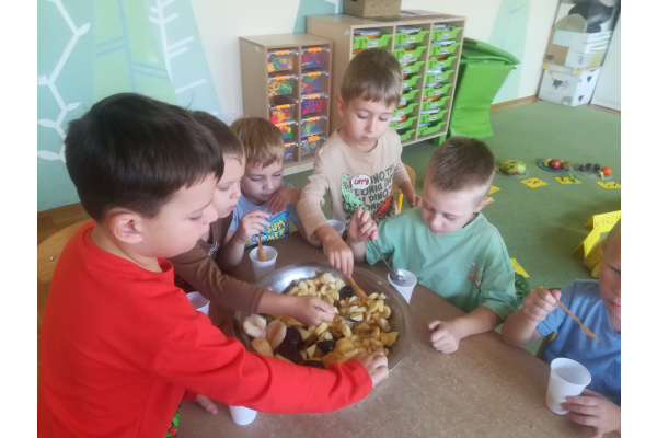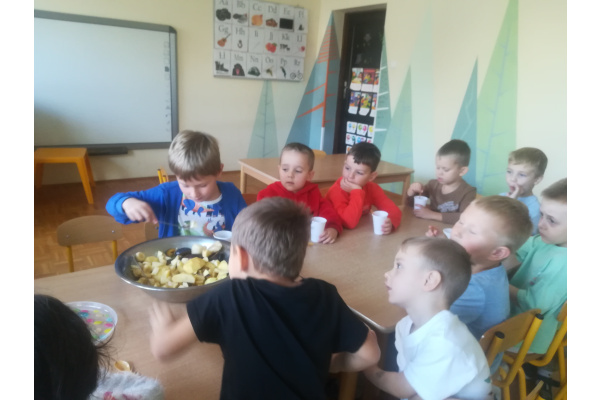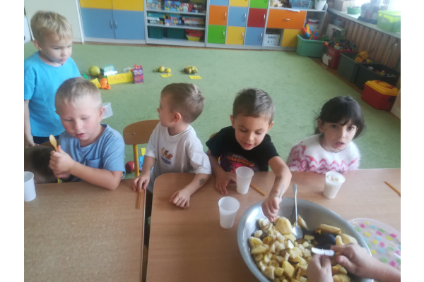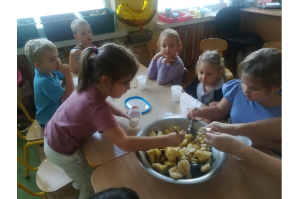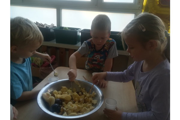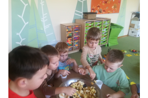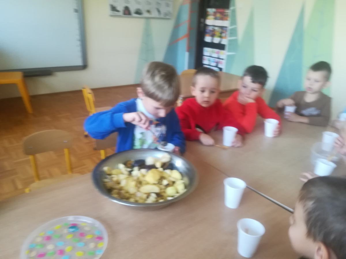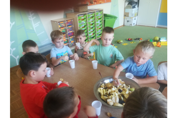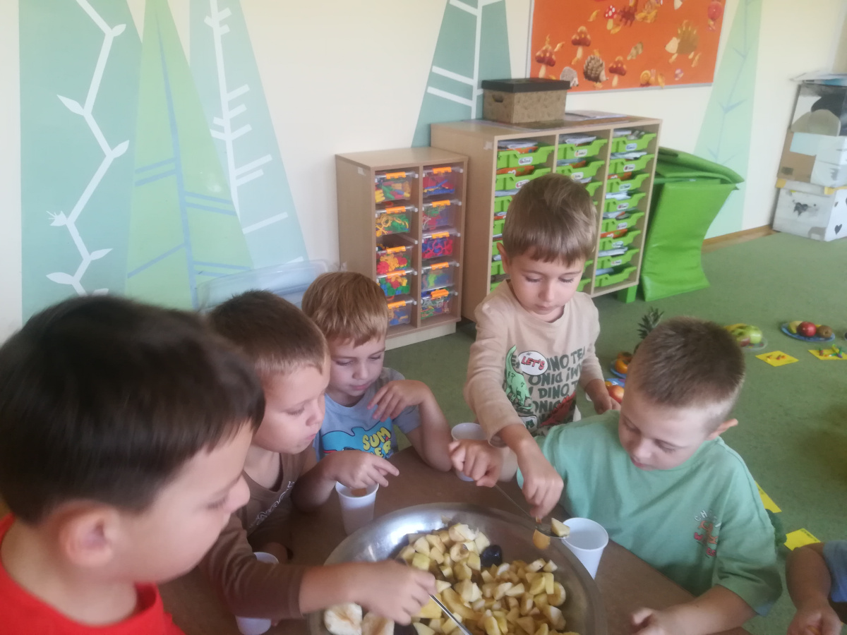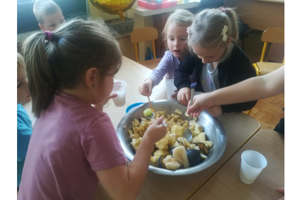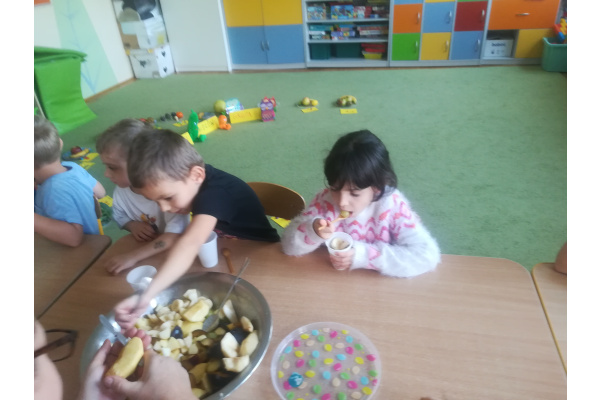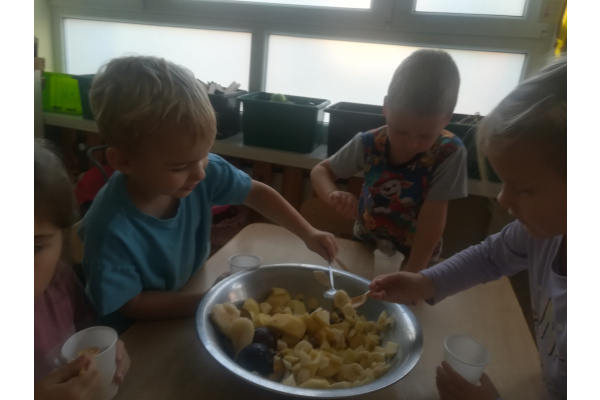 Dzieci z zaangażowaniem umyły a następnie pokroimy owoce. Podczas zajęć przedszkolaki uczyły się rozpoznawać owoce, rozwijały umiejętności współpracy i samodzielności. Na koniec wszyscy z apetytem zajadali przygotowane pyszności. Było kolorowo, zdrowo i bardzo smacznie!