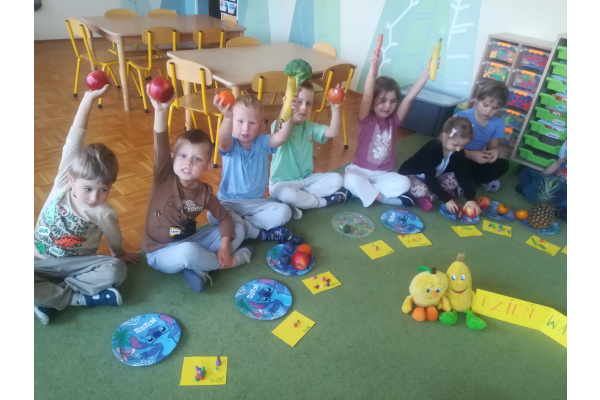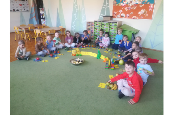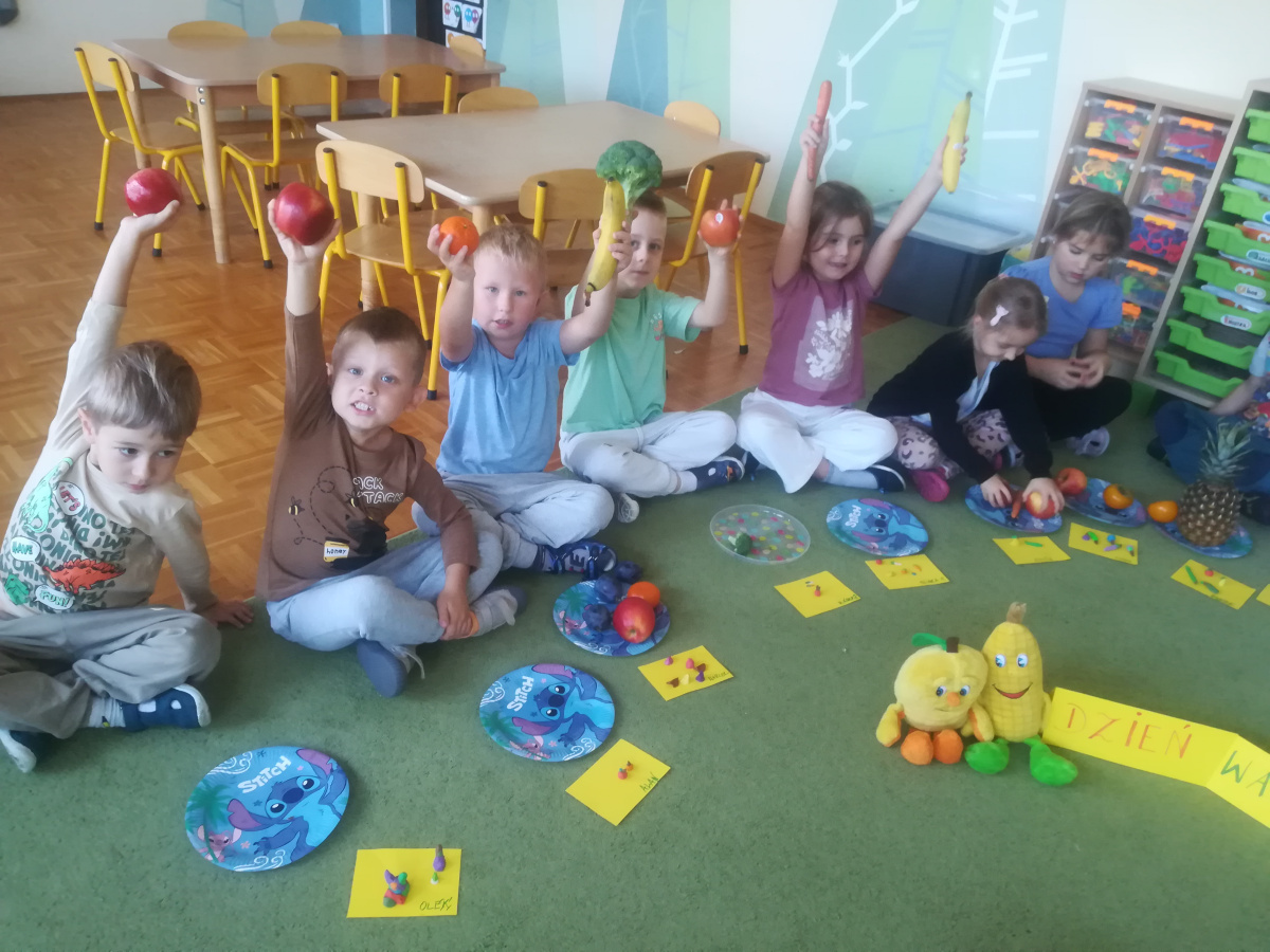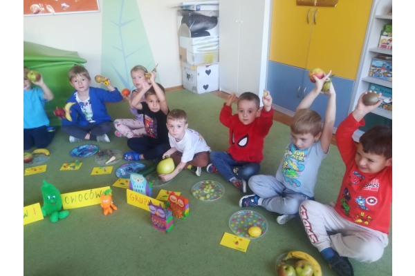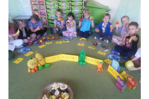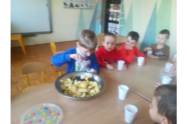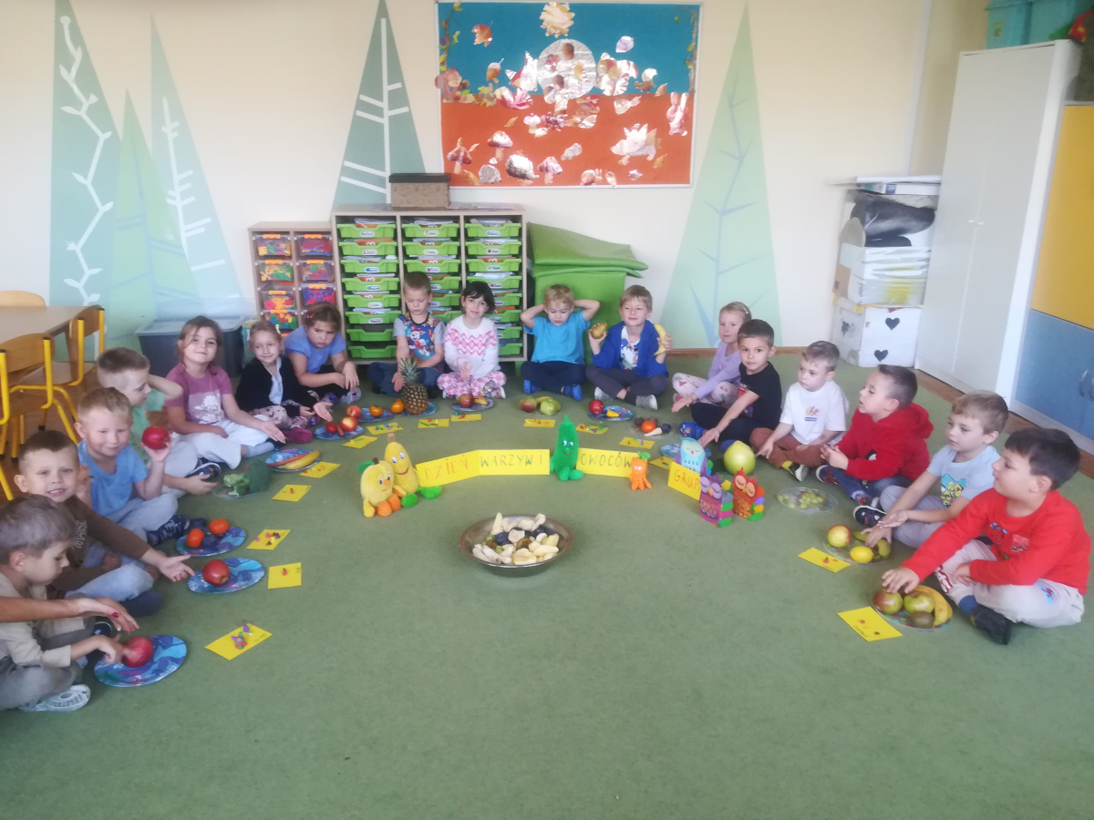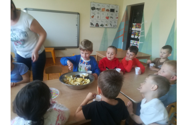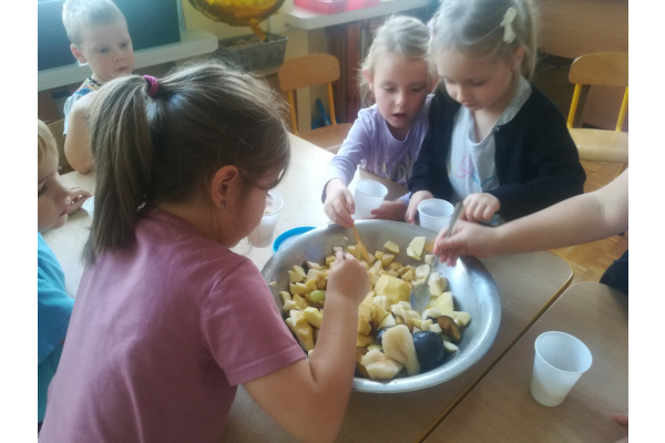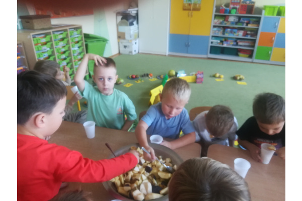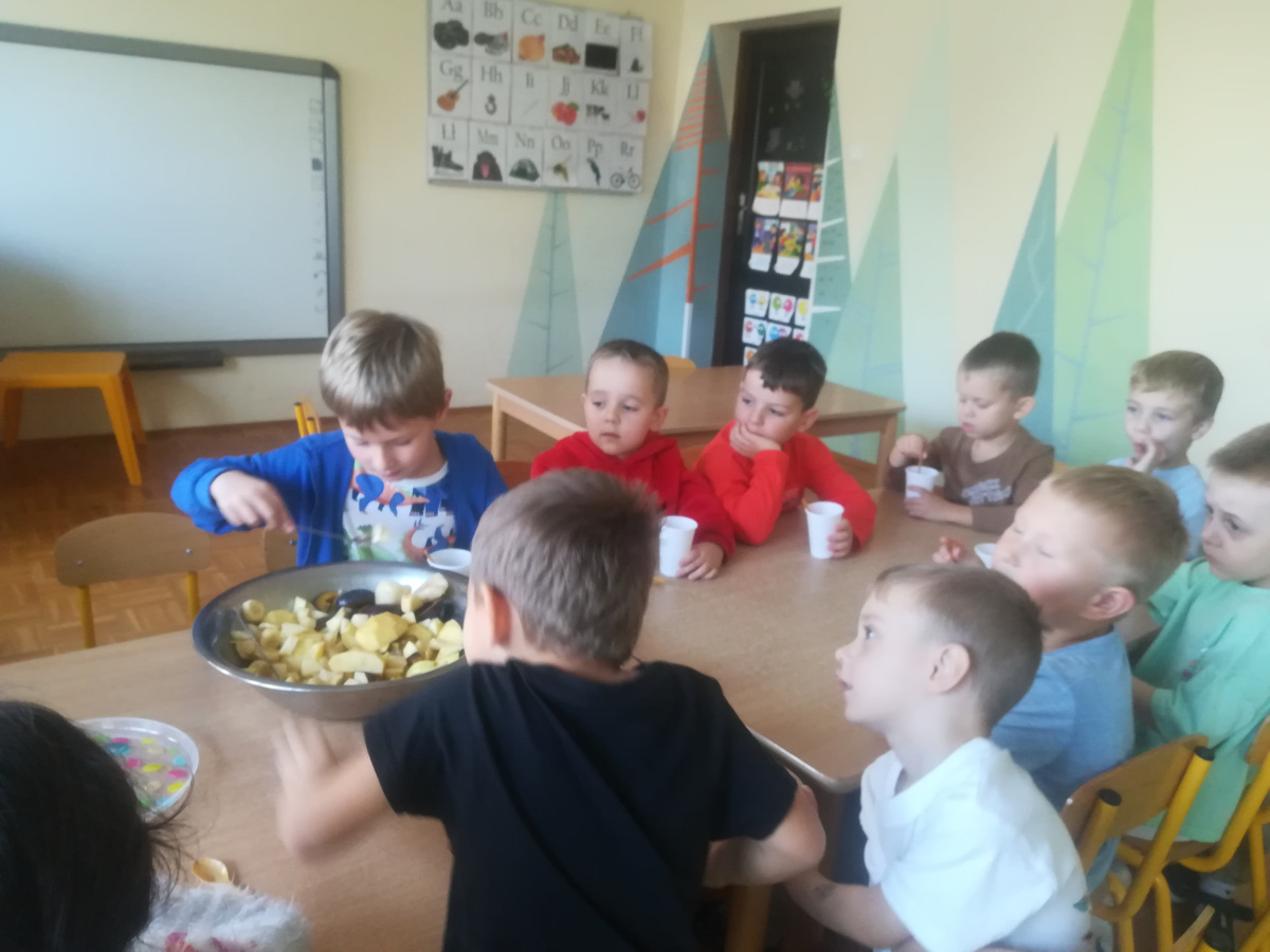 Dzieci z zaangażowaniem umyły a następnie pokroimy owoce. Podczas zajęć przedszkolaki uczyły się rozpoznawać owoce, rozwijały umiejętności współpracy i samodzielności. Na koniec wszyscy z apetytem zajadali przygotowane pyszności. Było kolorowo, zdrowo i bardzo smacznie!