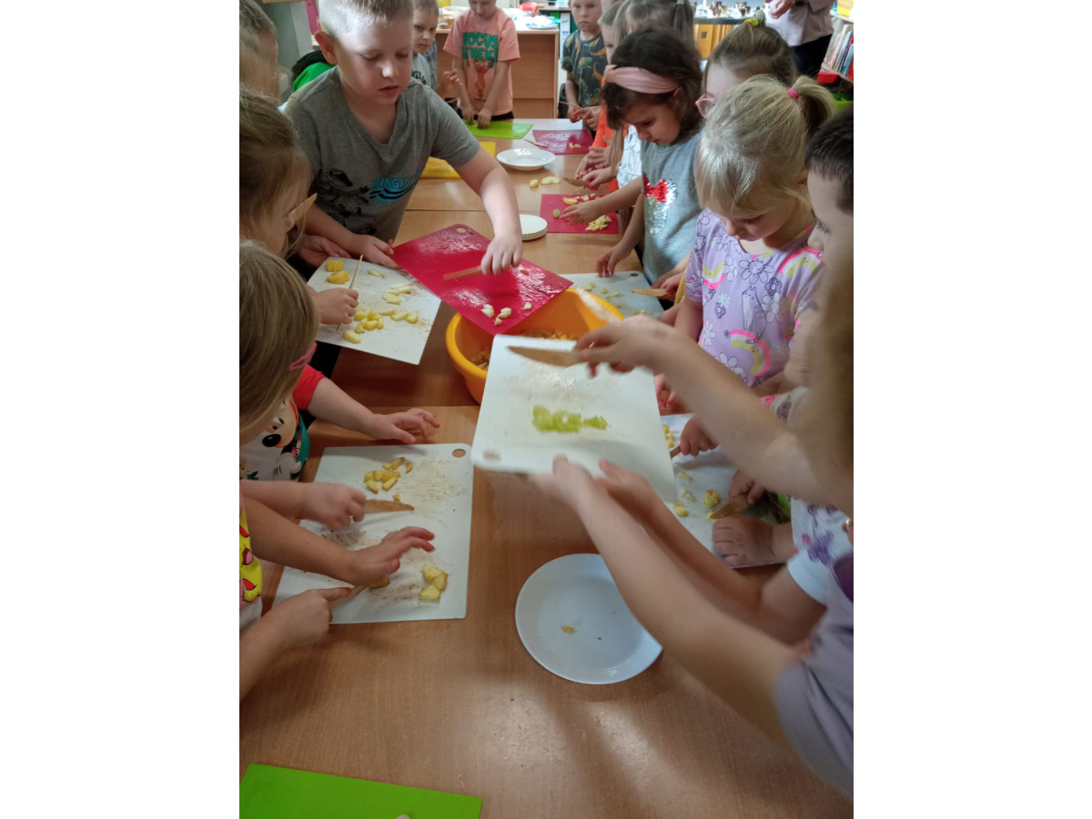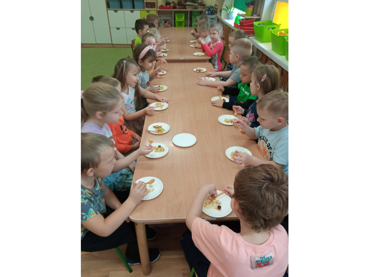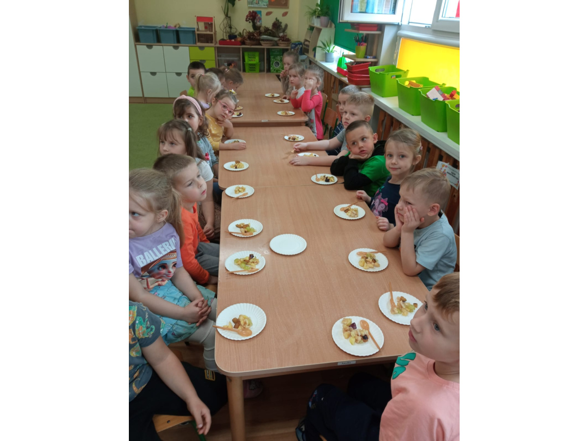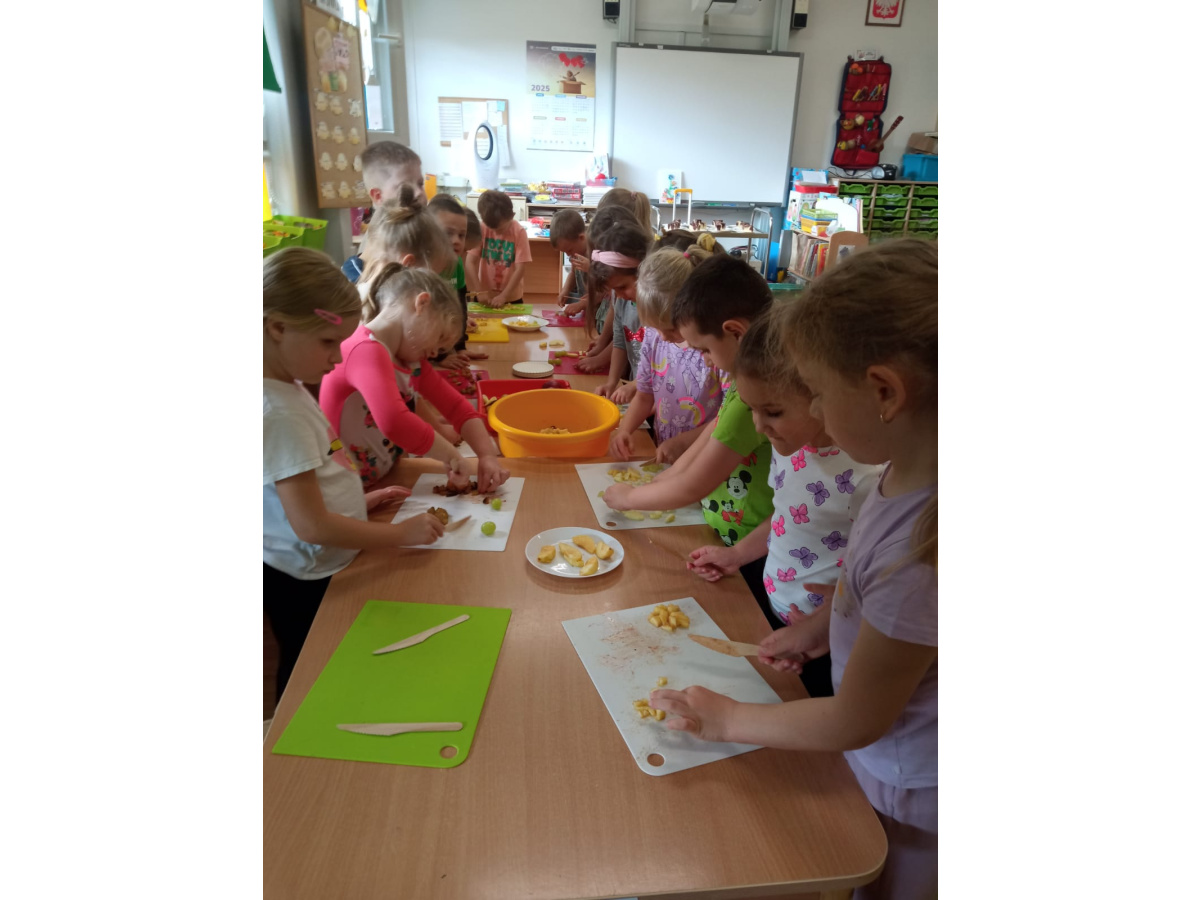 Dzieci z zaangażowaniem umyły a następnie pokroimy owoce. Podczas zajęć przedszkolaki uczyły się rozpoznawać owoce, rozwijały umiejętności współpracy i samodzielności. Na koniec wszyscy z apetytem zajadali przygotowane pyszności. Było kolorowo, zdrowo i bardzo smacznie!