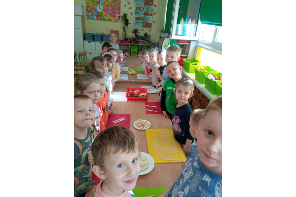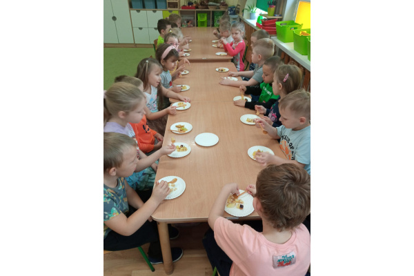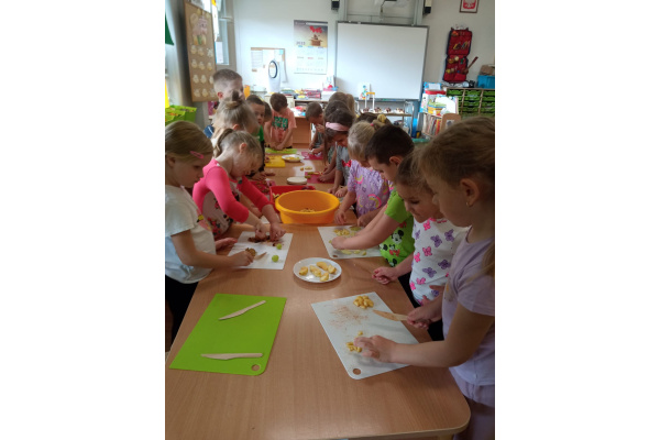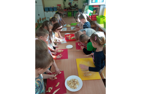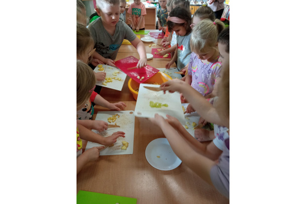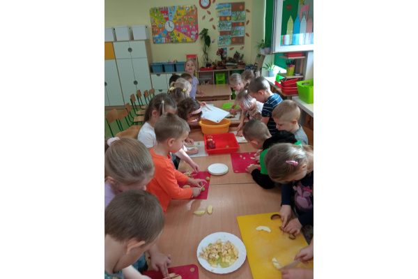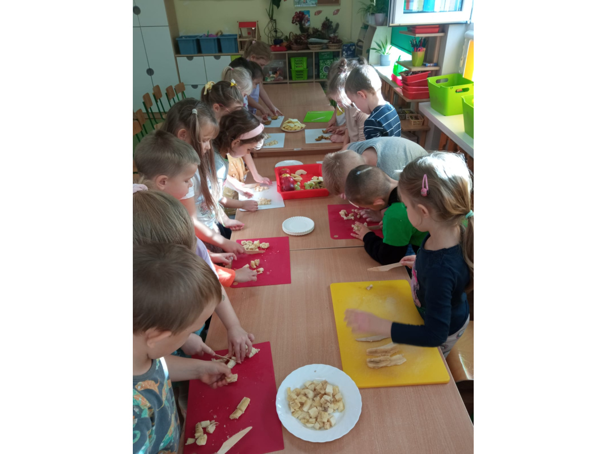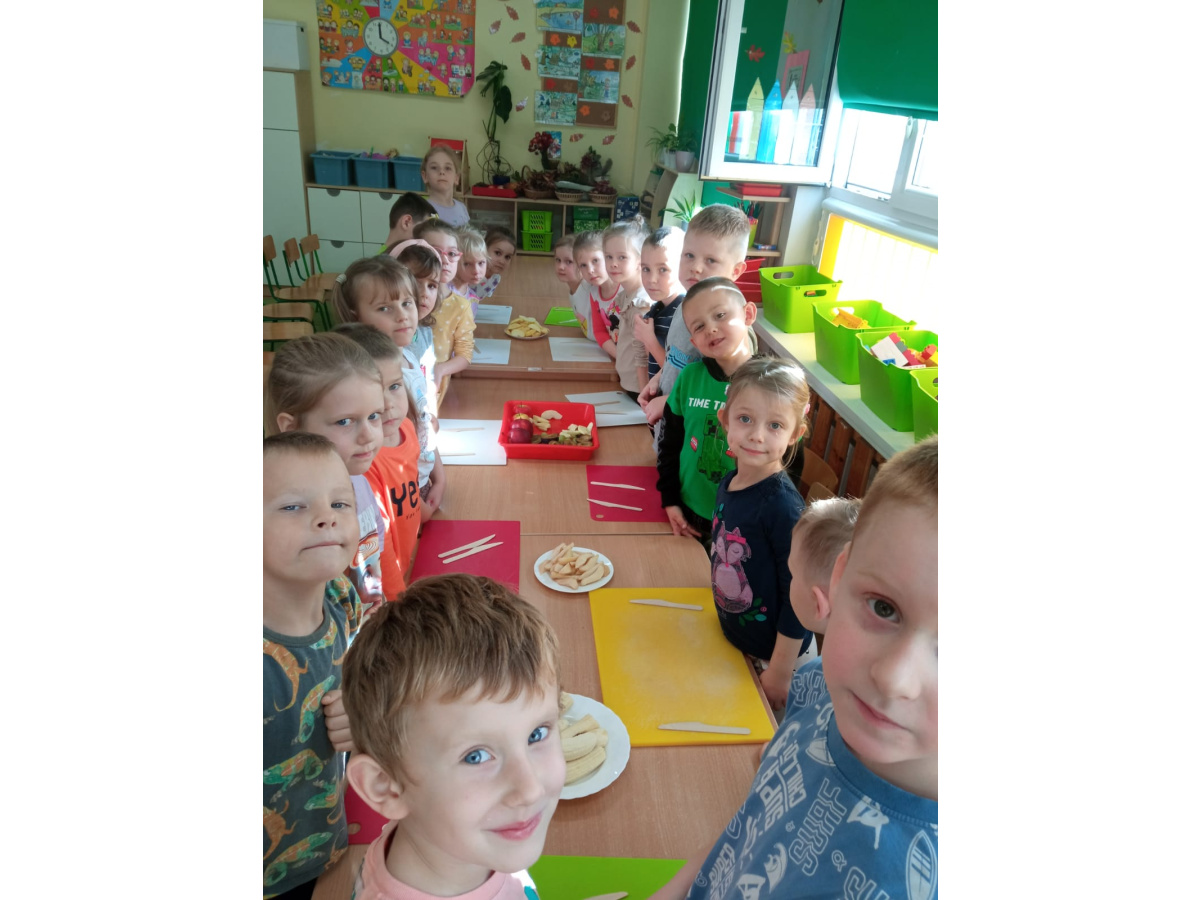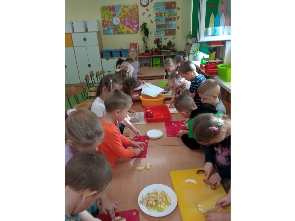 Dzieci z zaangażowaniem umyły a następnie pokroimy owoce. Podczas zajęć przedszkolaki uczyły się rozpoznawać owoce, rozwijały umiejętności współpracy i samodzielności. Na koniec wszyscy z apetytem zajadali przygotowane pyszności. Było kolorowo, zdrowo i bardzo smacznie!