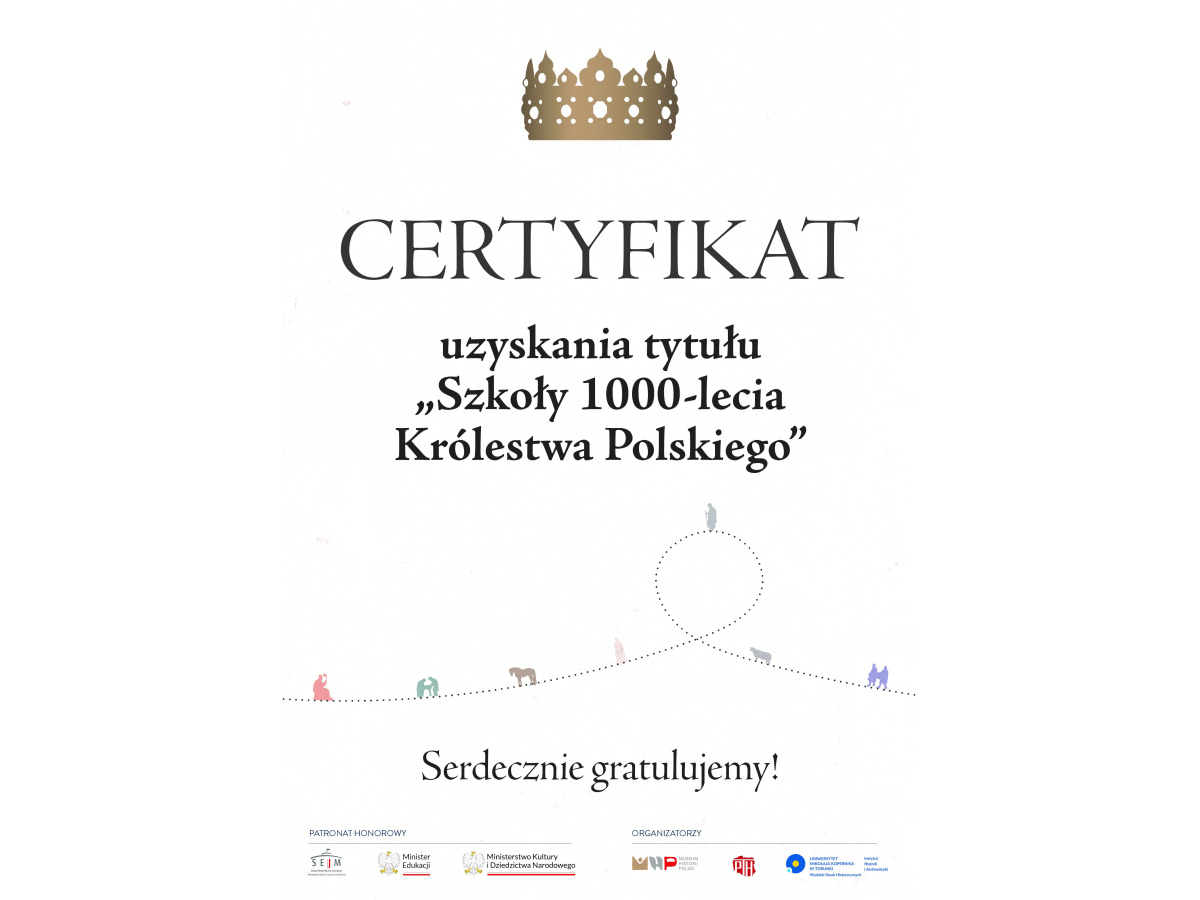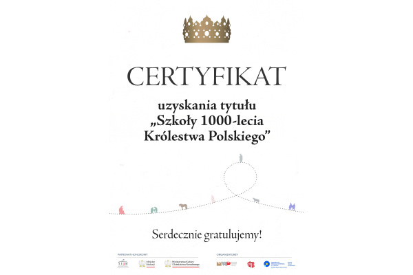 Otrzymalismy certyfikat "SZKOŁA 1000- lecia KRÓLESTWA POLSKIEGO". Wszystkim zaangażowanym uczniom i nauczycielom serdecznie gratulujemy :)