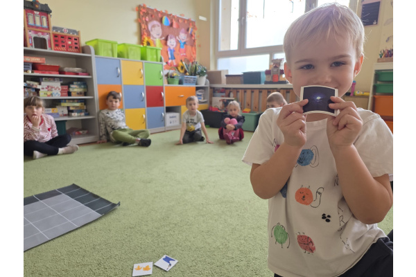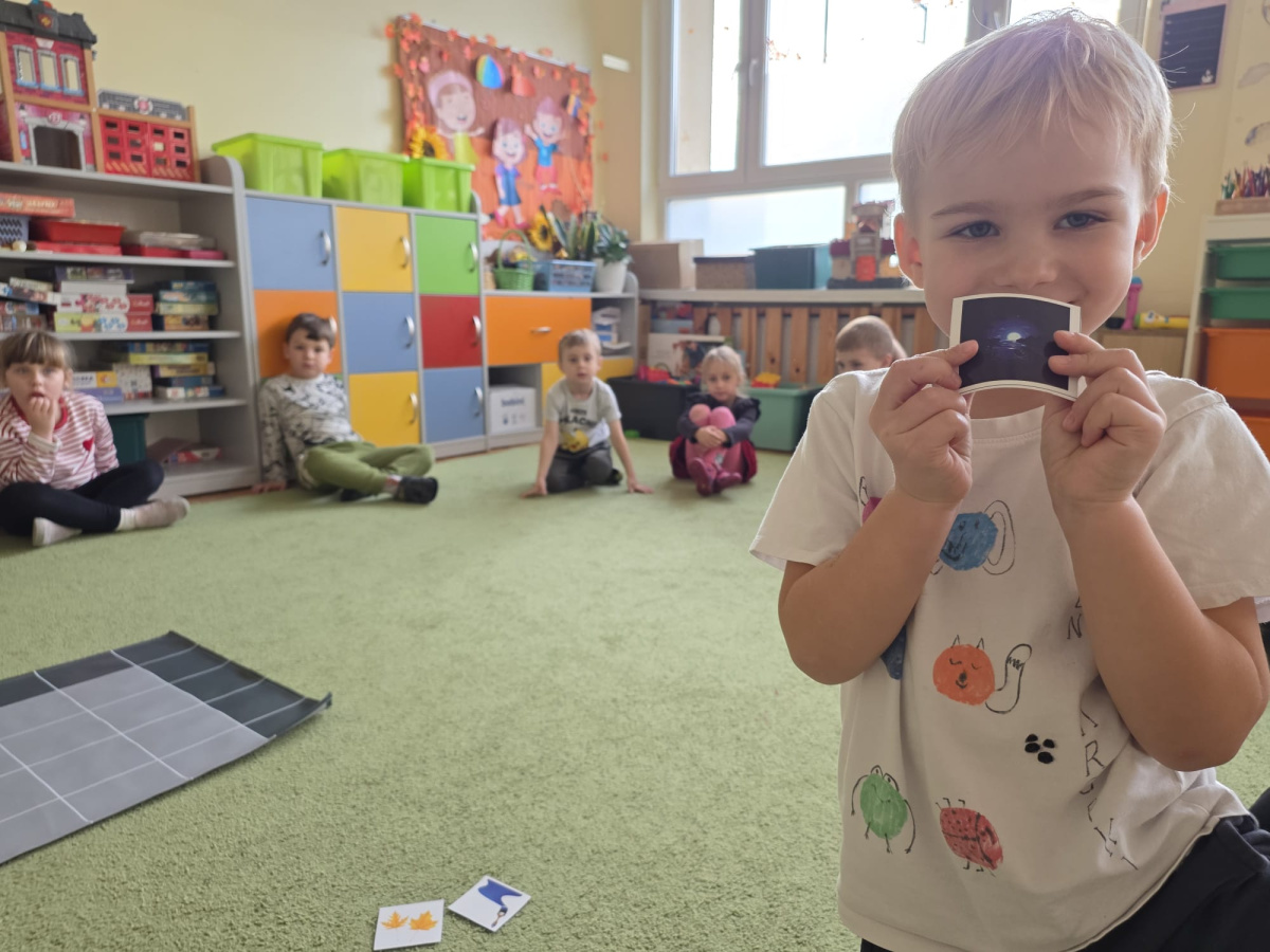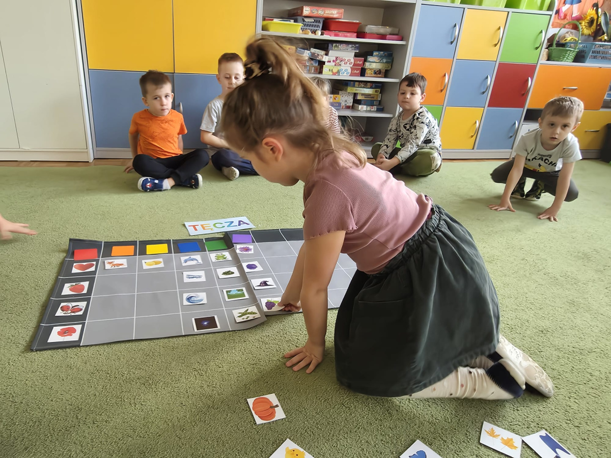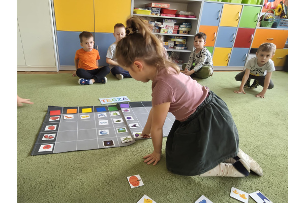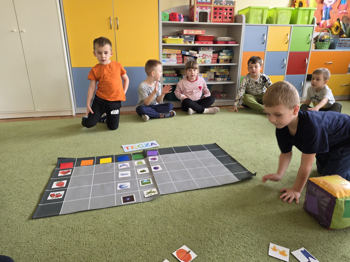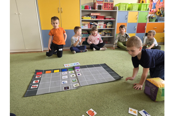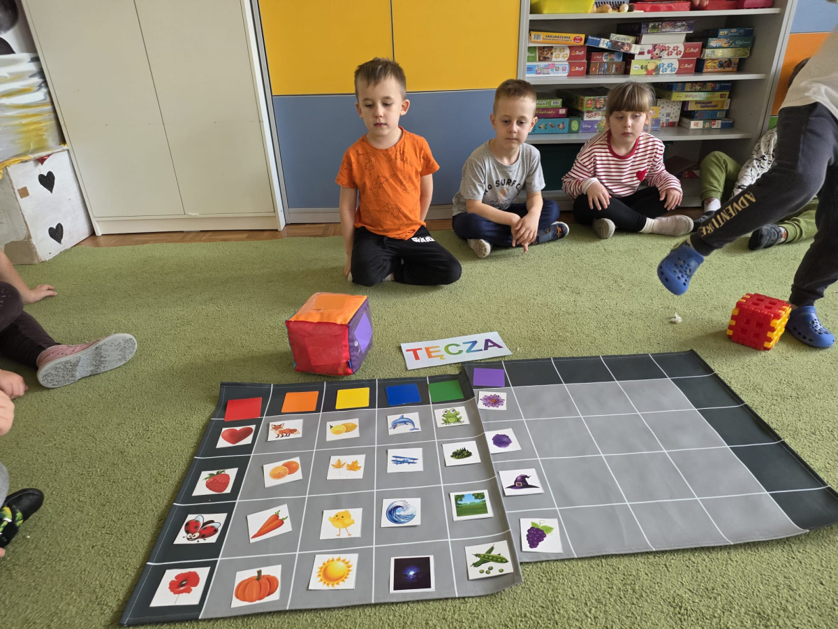 Zadaniem dzieci było utrwalenie kolorów tęczy oraz typowanie obrazków za pomocą kostki. Przedszkolaki ćwiczyły również głosowanie.