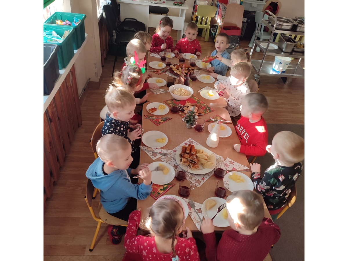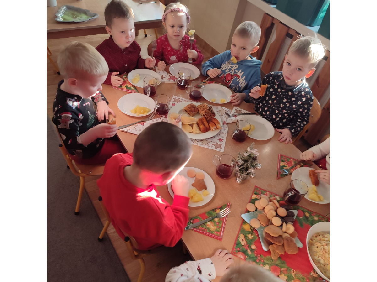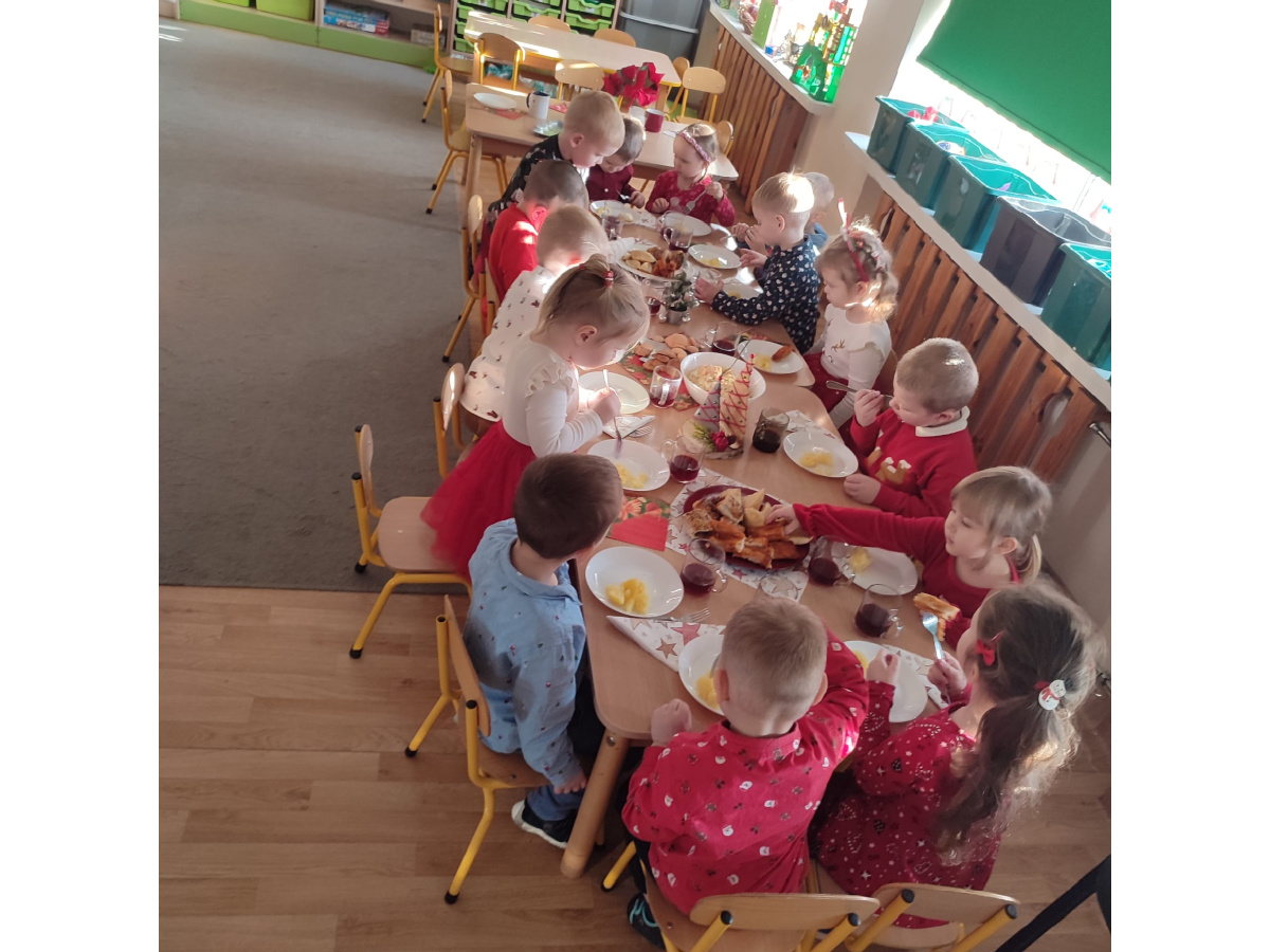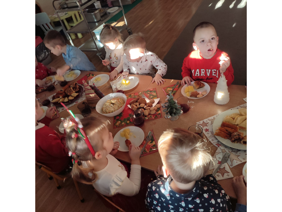 Po wizycie Gwiazdora odbyła się uroczysta Wigilia. Dzieci wspólnie zasiadły do świątecznego stołu, składały sobie życzenia i dzieliły się opłatkiem. Był to czas pełen ciepła i radości, który na długo pozostanie w naszej pamięci.