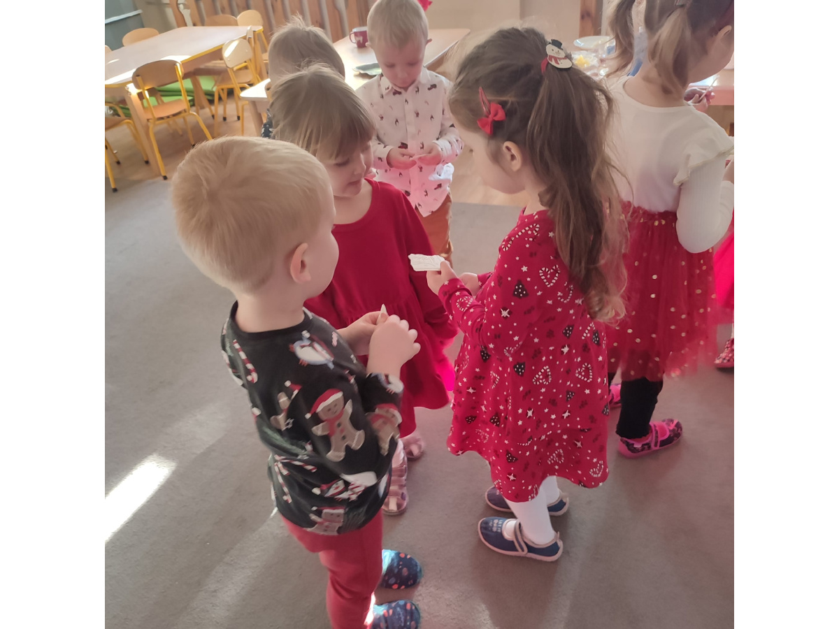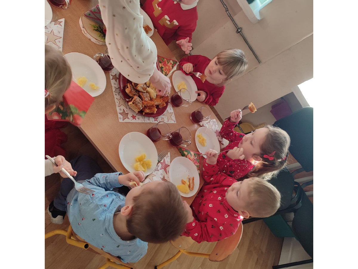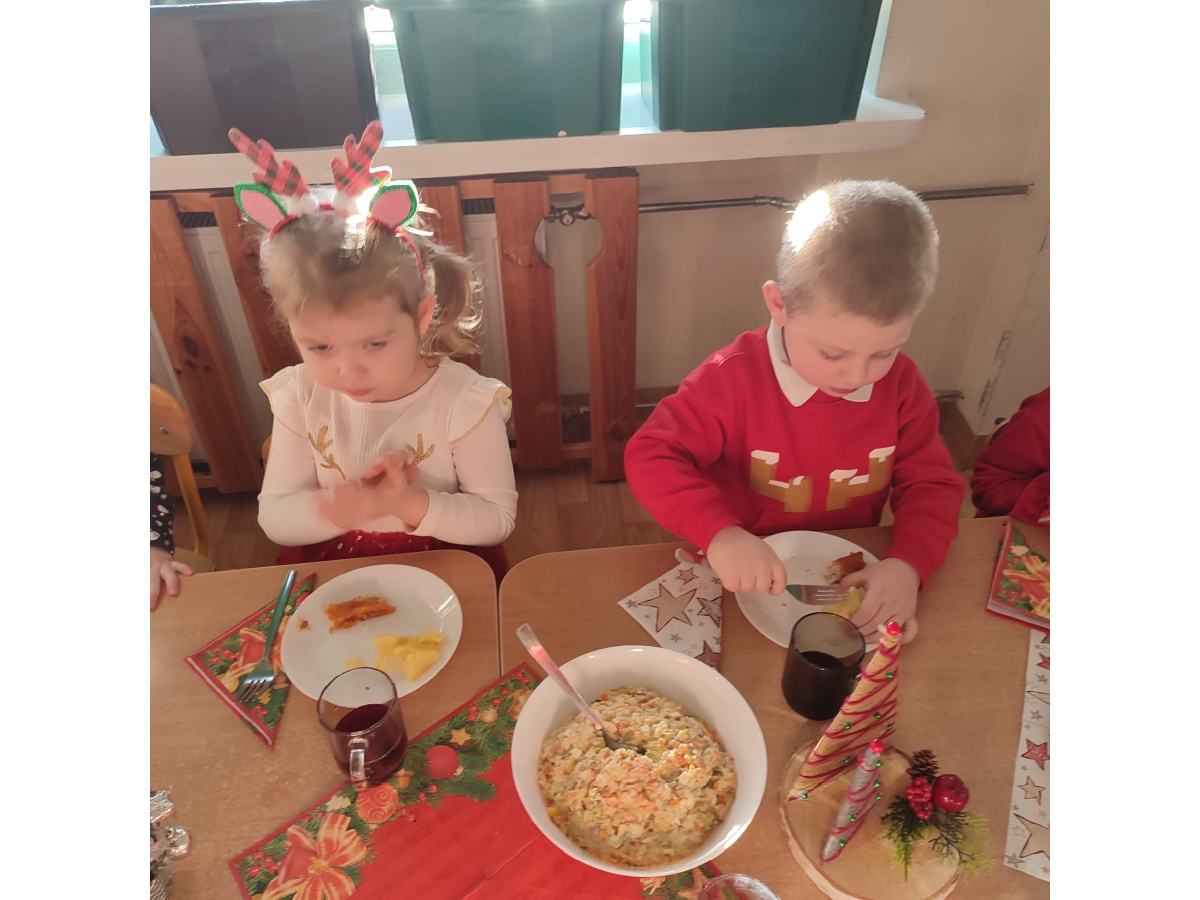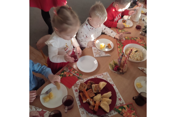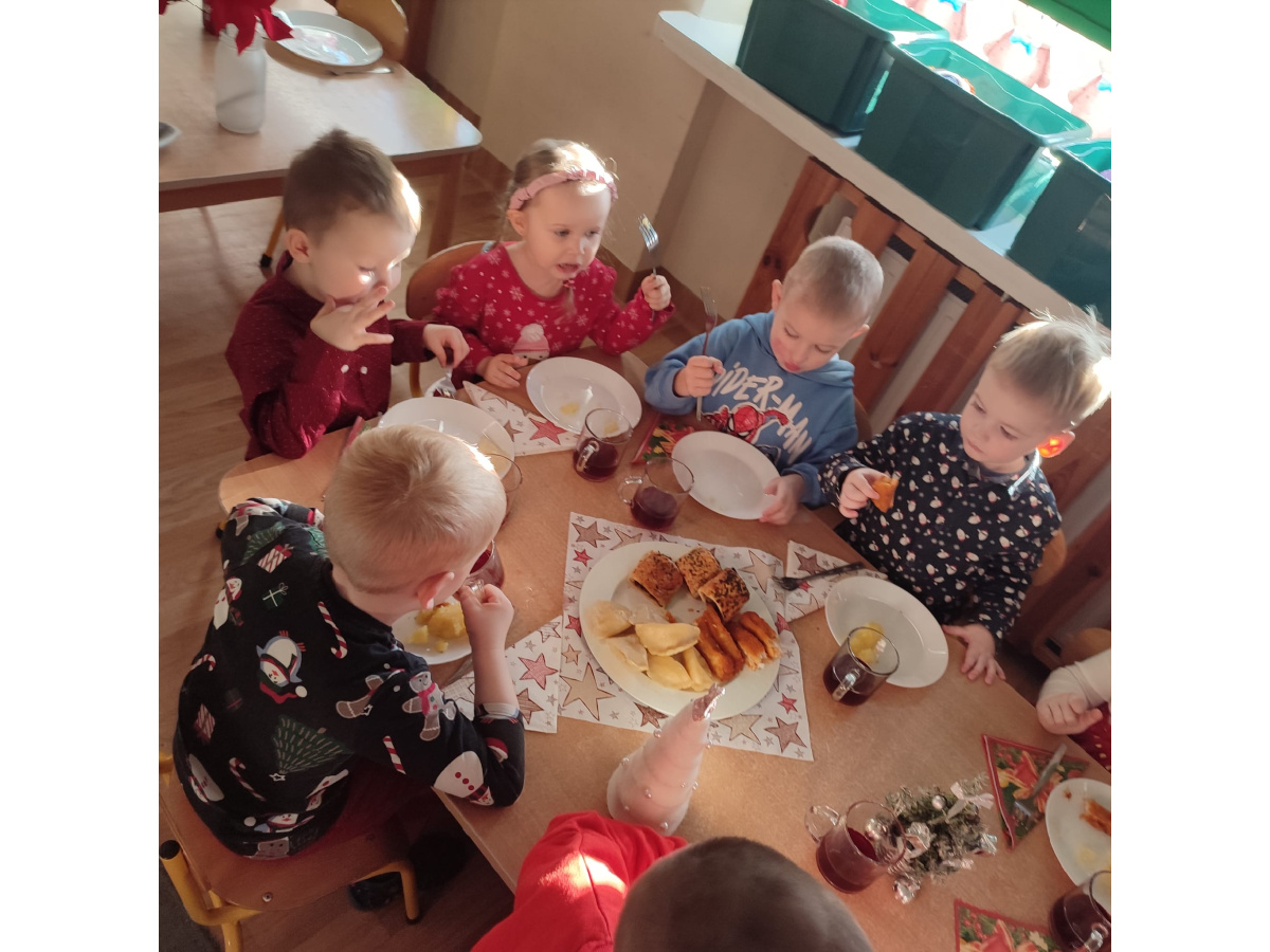 Po wizycie Gwiazdora odbyła się uroczysta Wigilia. Dzieci wspólnie zasiadły do świątecznego stołu, składały sobie życzenia i dzieliły się opłatkiem. Był to czas pełen ciepła i radości, który na długo pozostanie w naszej pamięci.