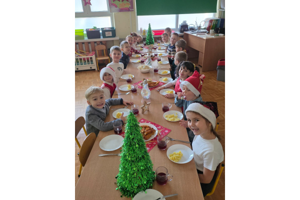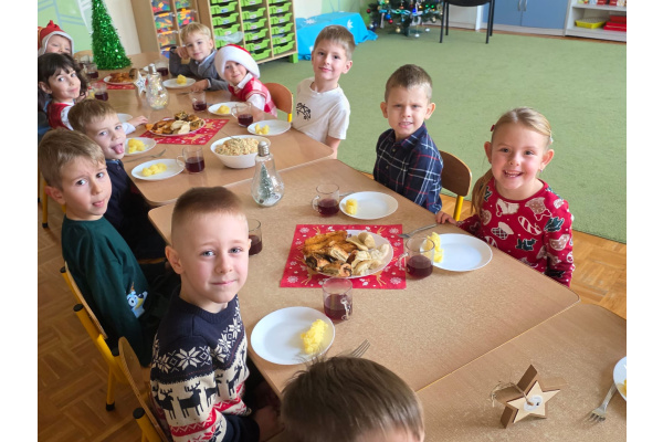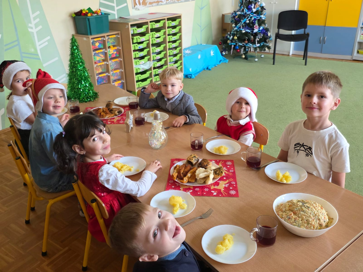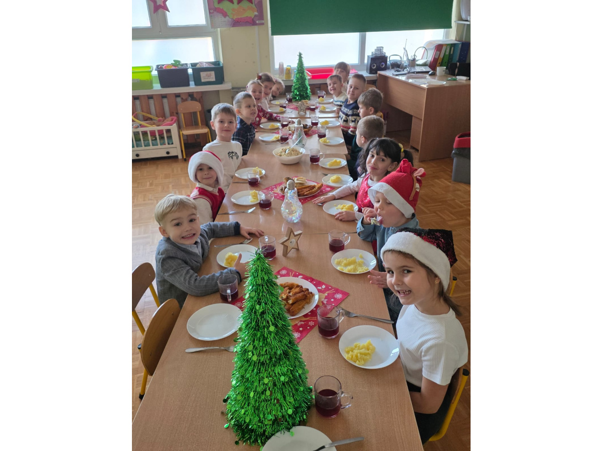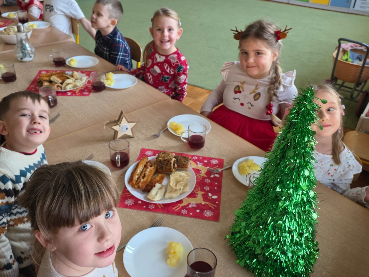 Po wizycie Gwiazdora odbyła się uroczysta Wigilia. Dzieci wspólnie zasiadły do świątecznego stołu, składały sobie życzenia i dzieliły się opłatkiem. Był to czas pełen ciepła i radości, który na długo pozostanie w naszej pamięci.