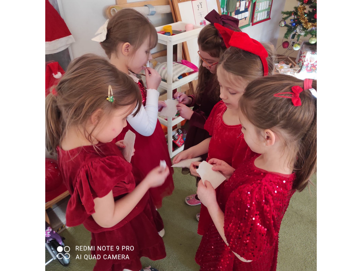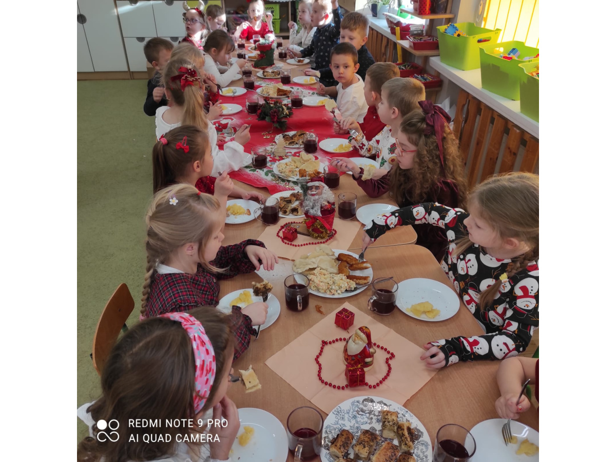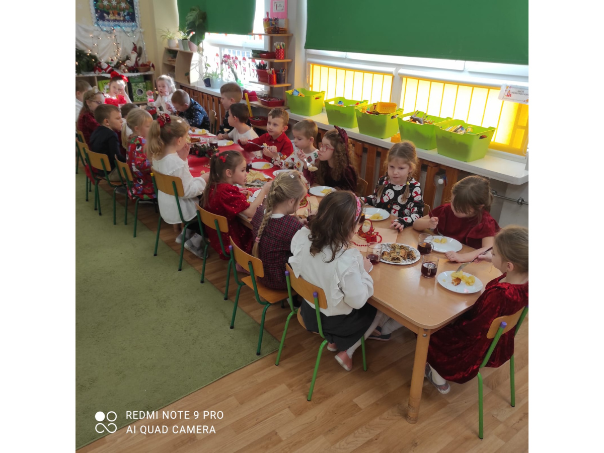 Po wizycie Gwiazdora odbyła się uroczysta Wigilia. Dzieci wspólnie zasiadły do świątecznego stołu, składały sobie życzenia i dzieliły się opłatkiem. Był to czas pełen ciepła i radości, który na długo pozostanie w naszej pamięci.