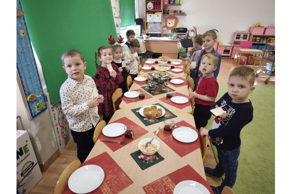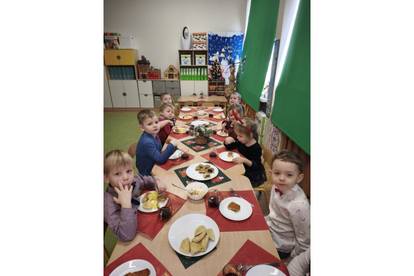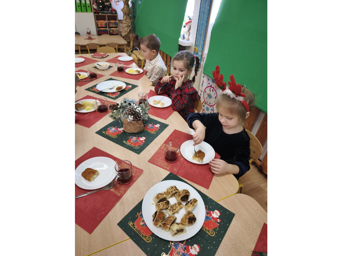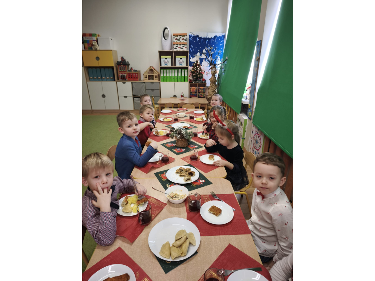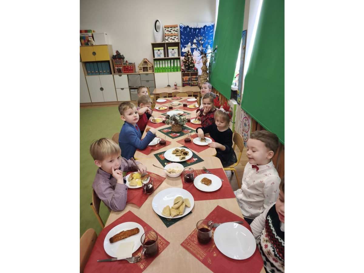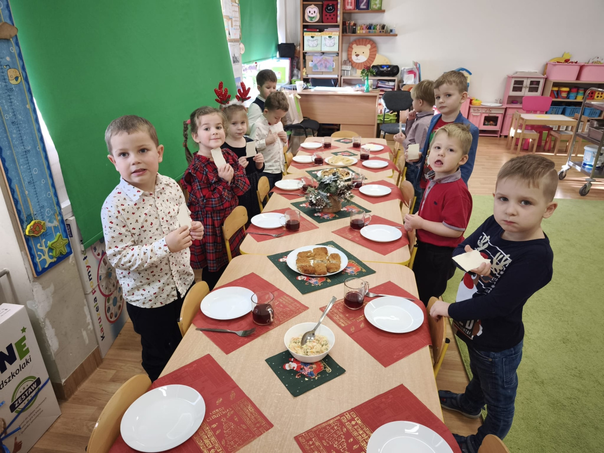Po wizycie Gwiazdora odbyła się uroczysta Wigilia. Dzieci wspólnie zasiadły do świątecznego stołu, składały sobie życzenia i dzieliły się opłatkiem. Był to czas pełen ciepła i radości, który na długo pozostanie w naszej pamięci.