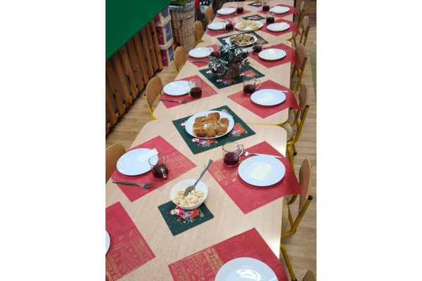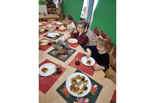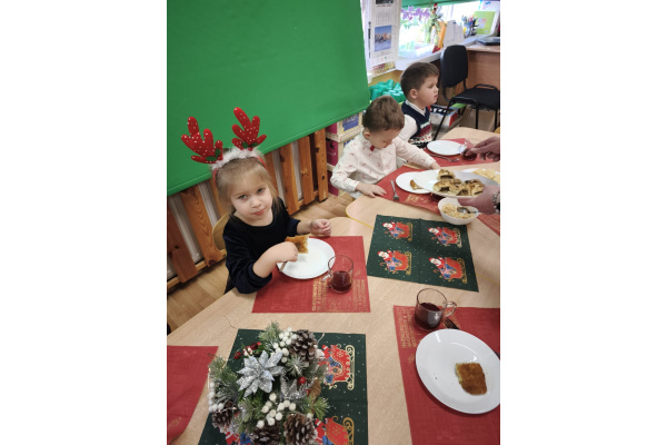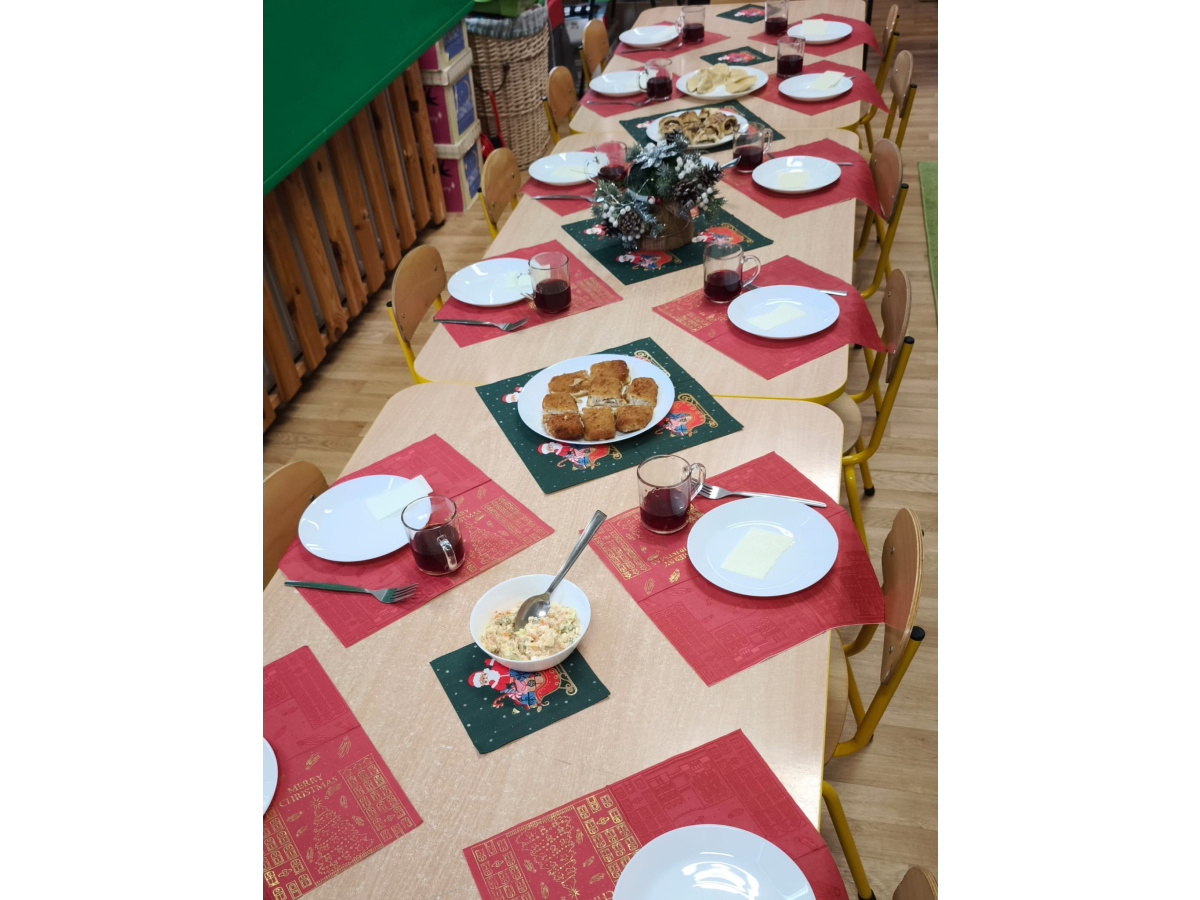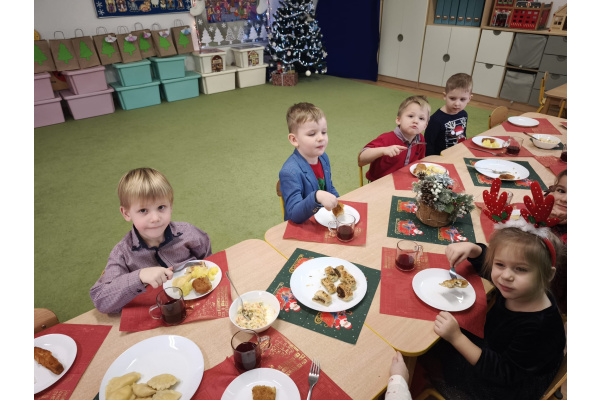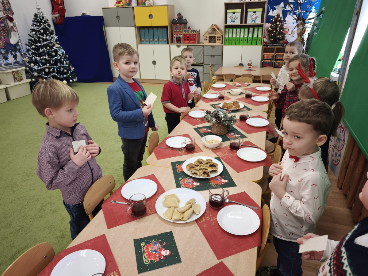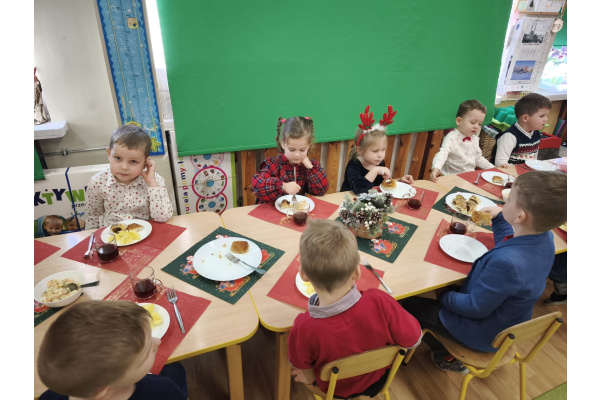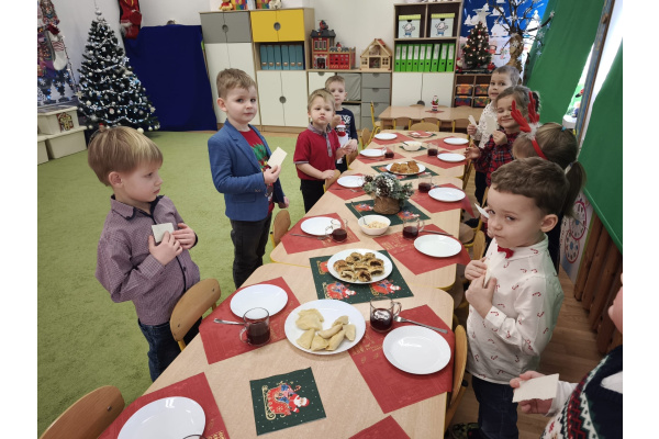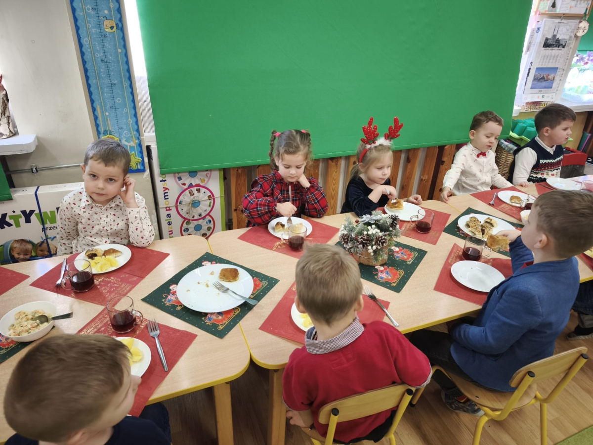 Po wizycie Gwiazdora odbyła się uroczysta Wigilia. Dzieci wspólnie zasiadły do świątecznego stołu, składały sobie życzenia i dzieliły się opłatkiem. Był to czas pełen ciepła i radości, który na długo pozostanie w naszej pamięci.