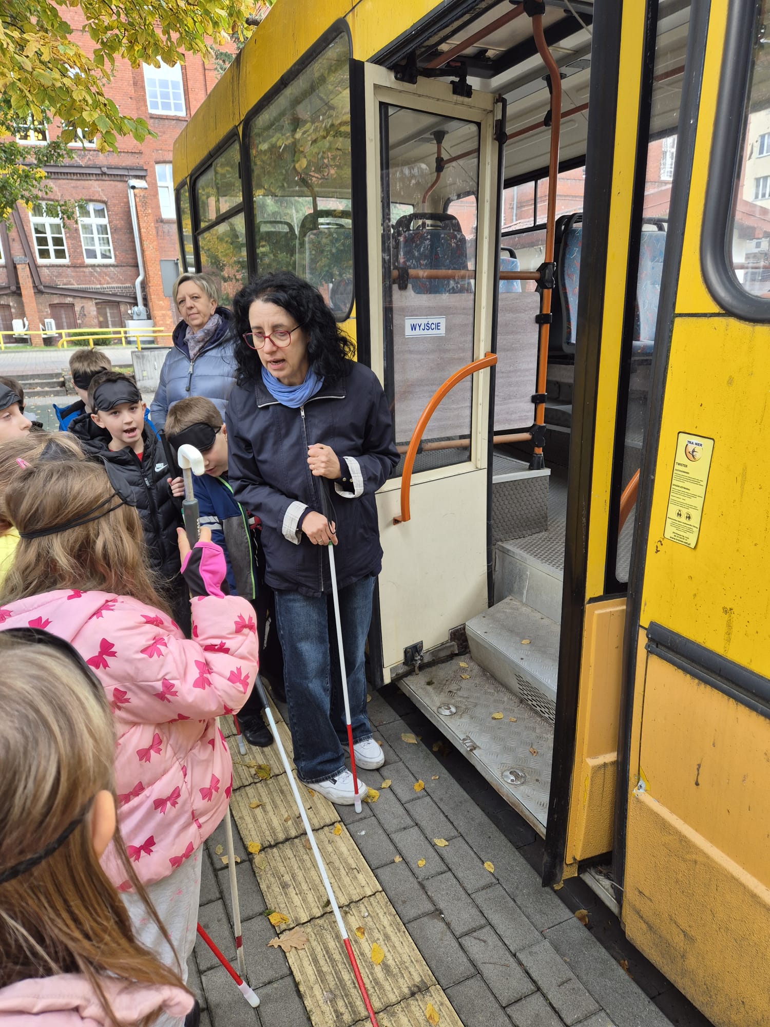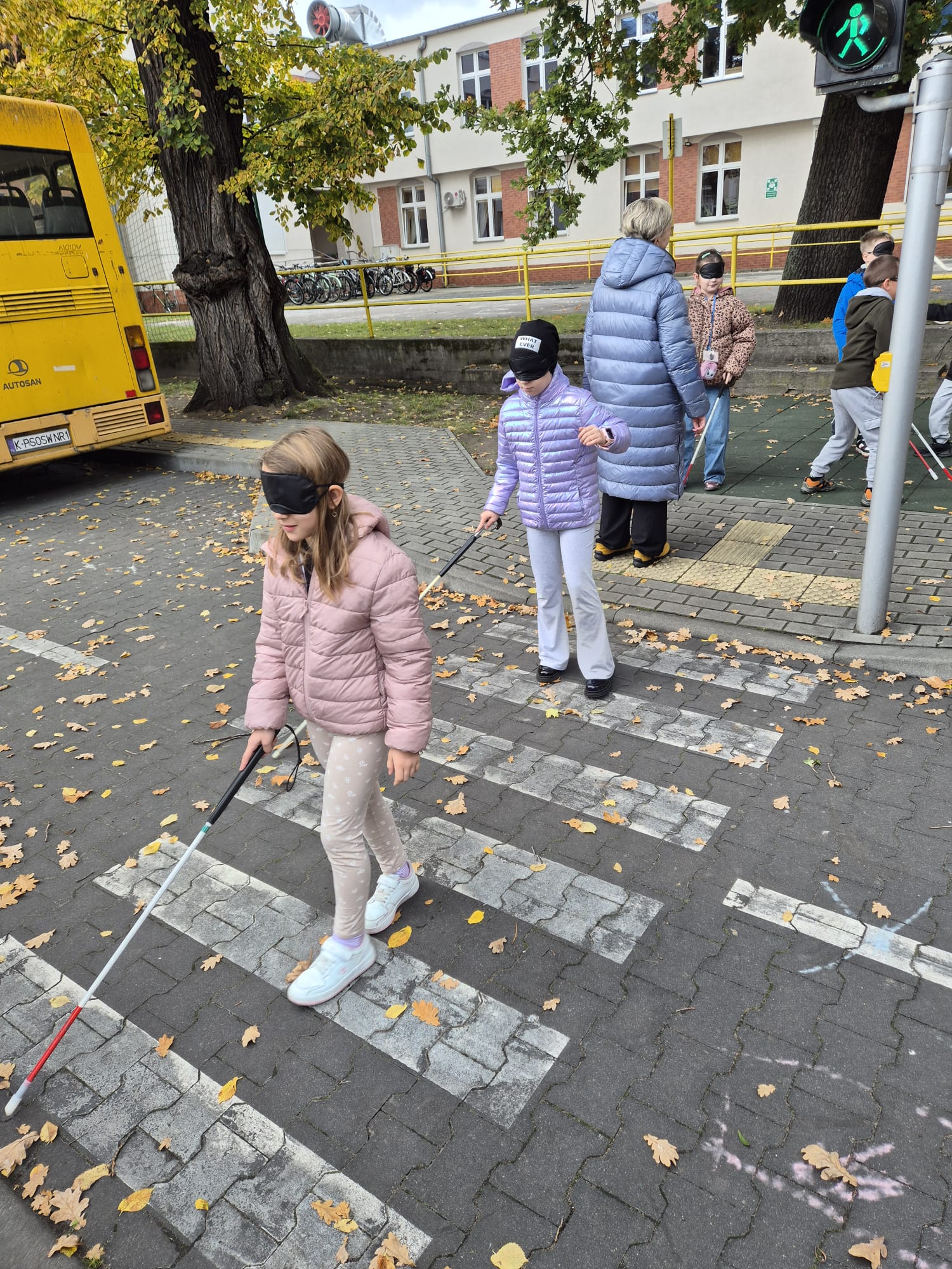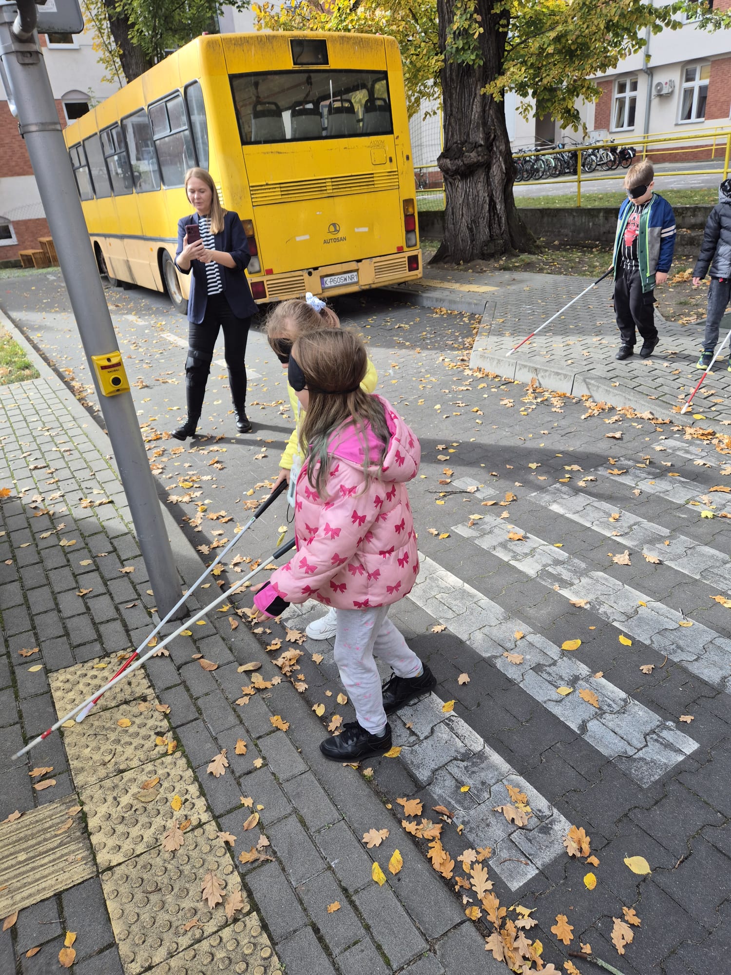 Jednym z najciekawszych elementów wizyty były zajęcia terenowe. Uczniowie wyszli na ulicę, gdzie pod okiem instruktorów ćwiczyli bezpieczne przechodzenie przez jezdnię oraz wchodzenie do autobusu. Dzięki tym ćwiczeniom dzieci mogły zrozumieć, jak ważna jest dostępność przestrzeni publicznej i jak wiele wysiłku wymaga samodzielne poruszanie się dla osób z niepełnosprawnością wzroku.