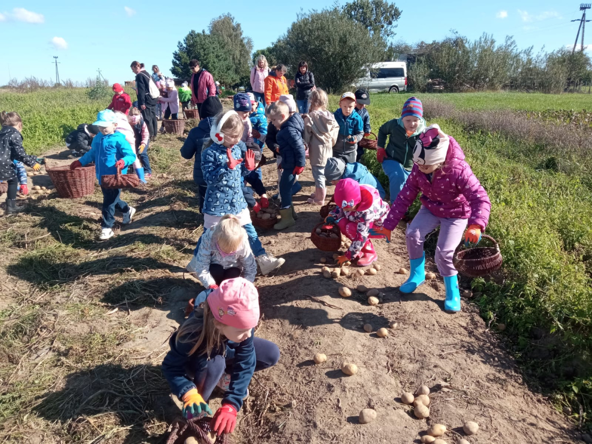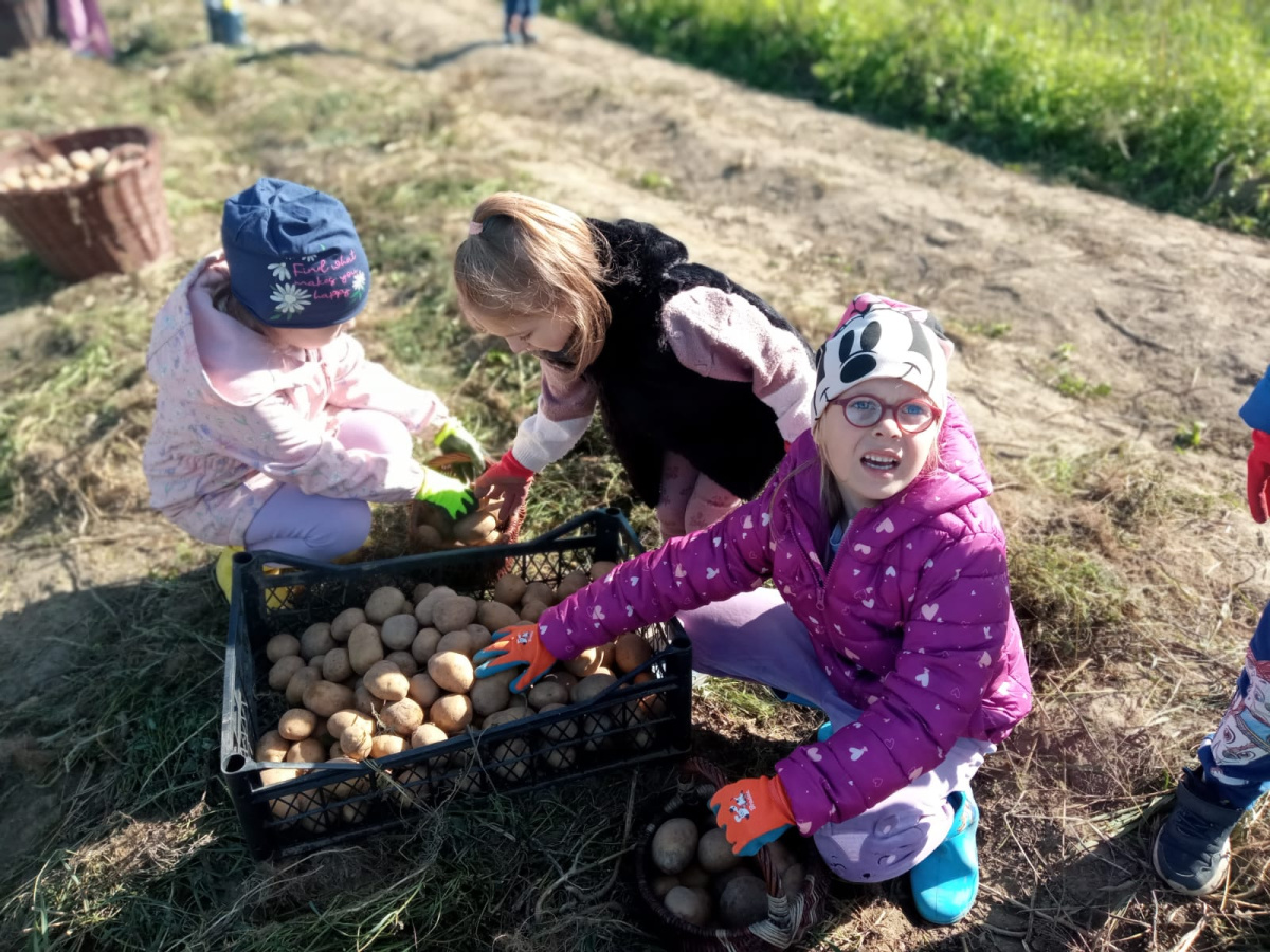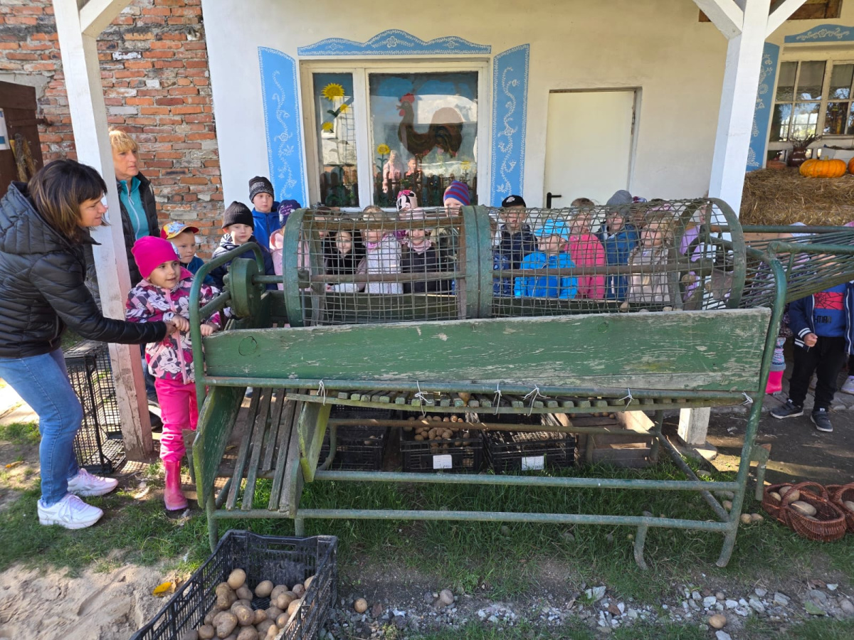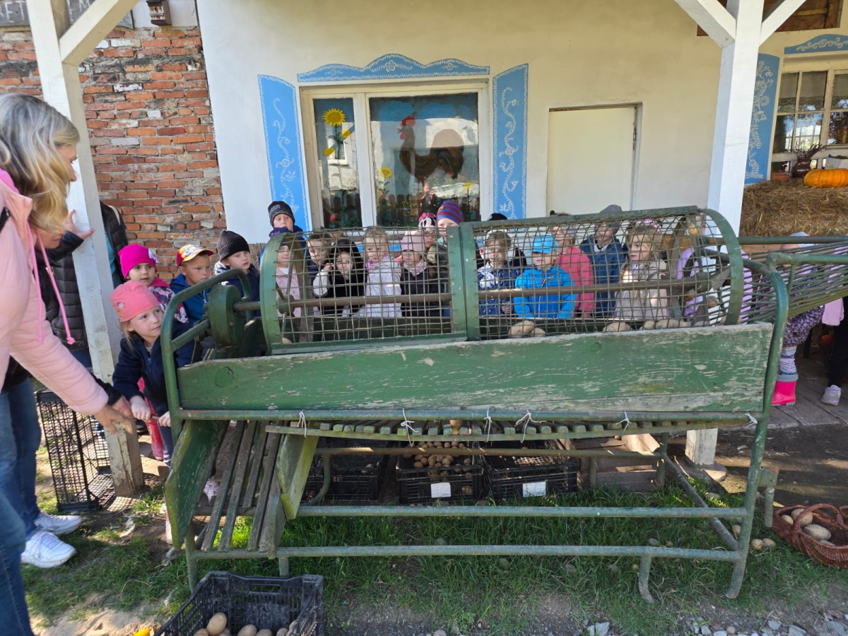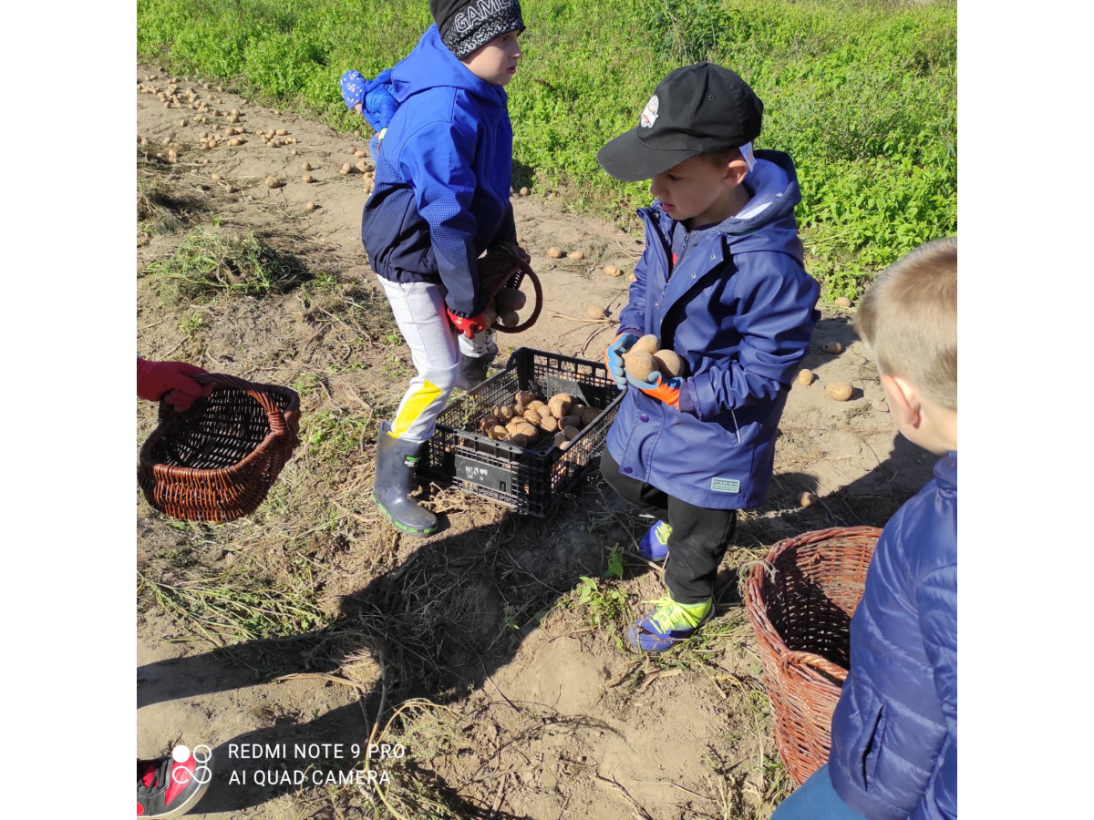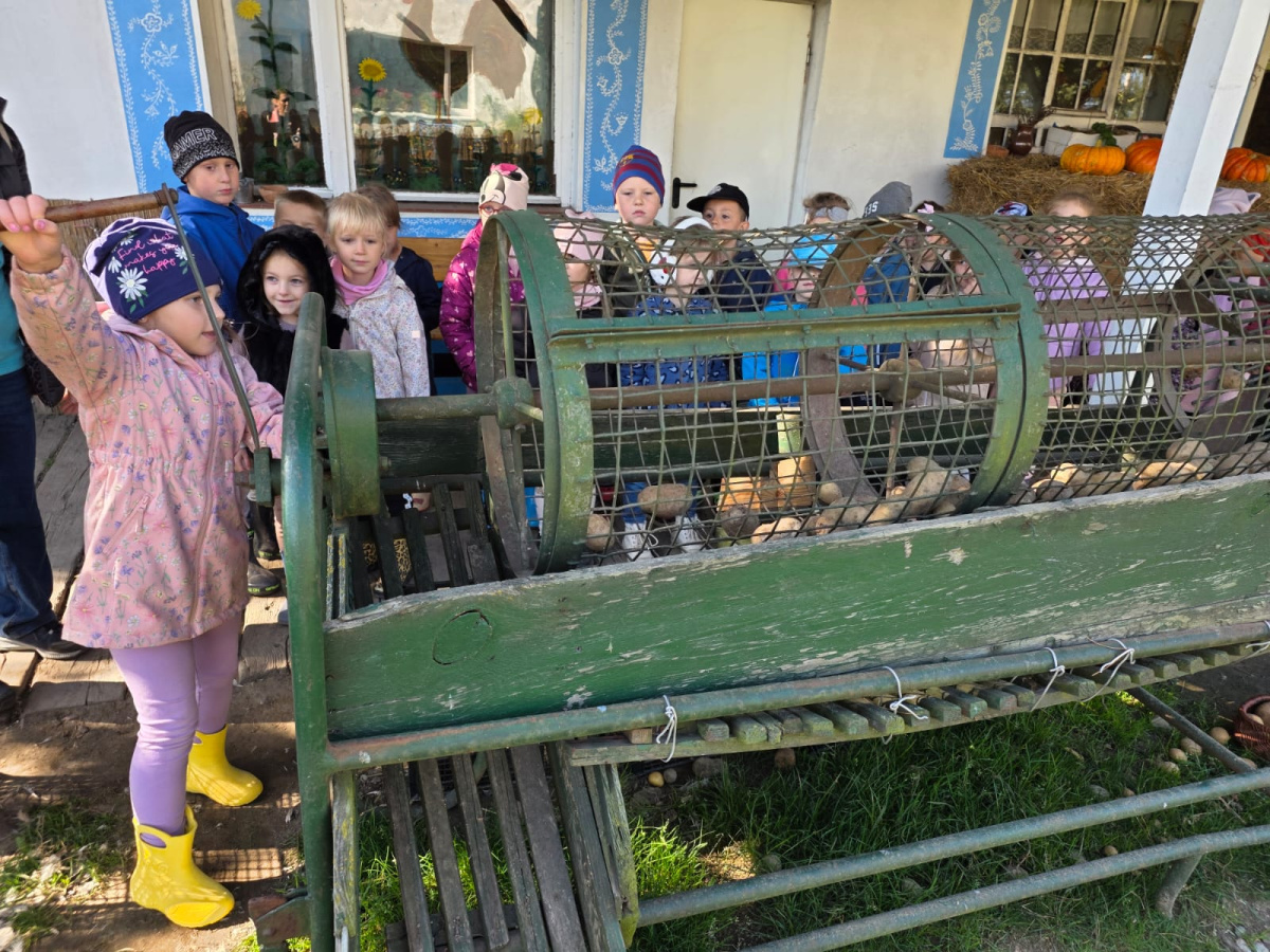 Na sam początek dnia wyruszyliśmy wozem po polach, podziwialiśmy otoczenie i klucze żurawi. Następnie rozgrzaliśmy sie przy pysznej malinowej herbatce,tworząc ziemniaczane cudaki-każdy z nas wykazał się kreatywnością. Próbowaliśmy tez smacznych ,polskich ziemniaków z pieca. Zwiedziliśmy wystawę starych przedmiotów, nakarmiliśmy głodne zwierzątka- to zadanie sprawiło nam dużo frajdy. Pobawiliśmy sie na ogromnym placu, a na koniec udaliśmy się na wykopki. To było zadanie stworzone dla wszystkich dzieci, nikt tak szybko jak Sówki i Biedronki nie potrafi zbierać na polu ziemniaków. Zmęczeni i zadowoleni wróciliśmy do przedszkola na pyszny obiadek.