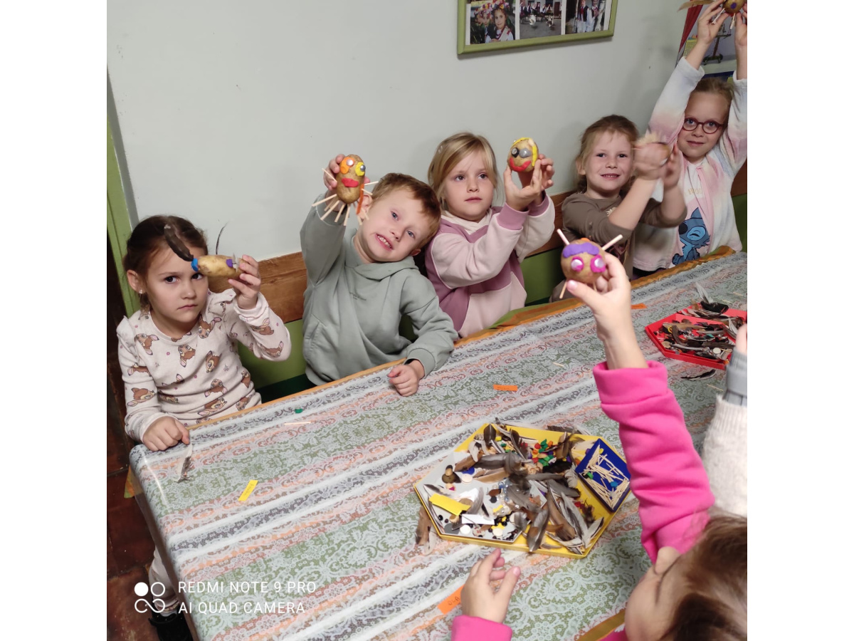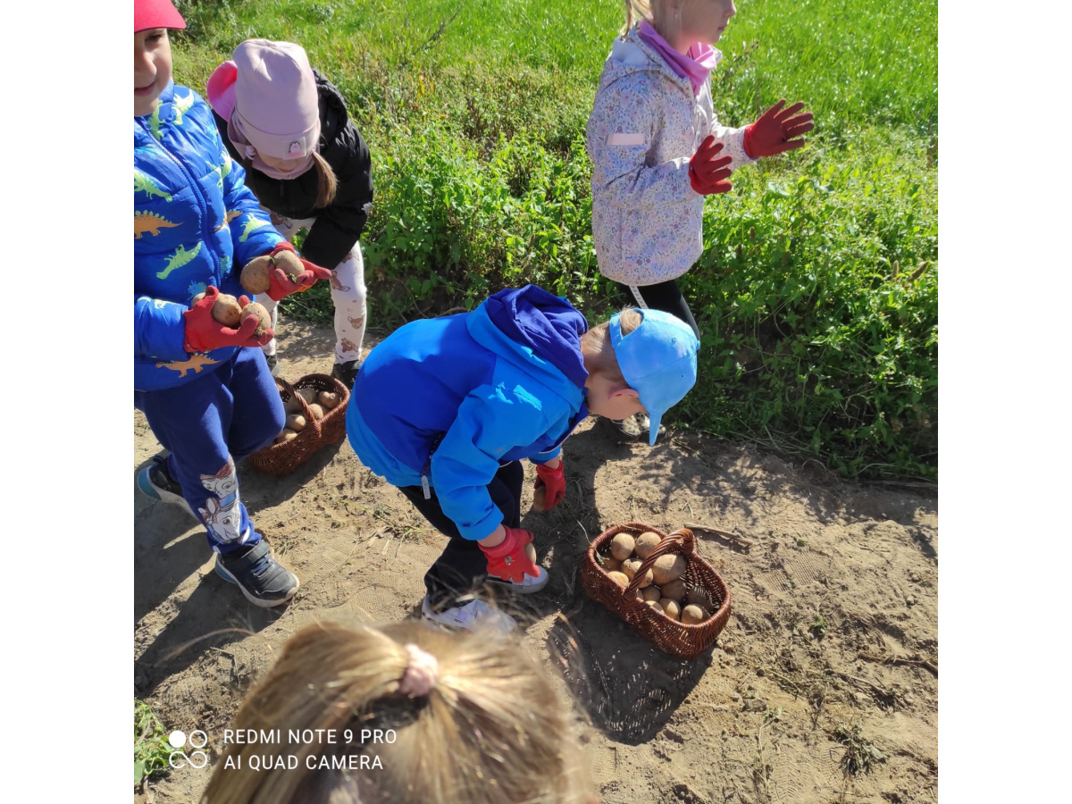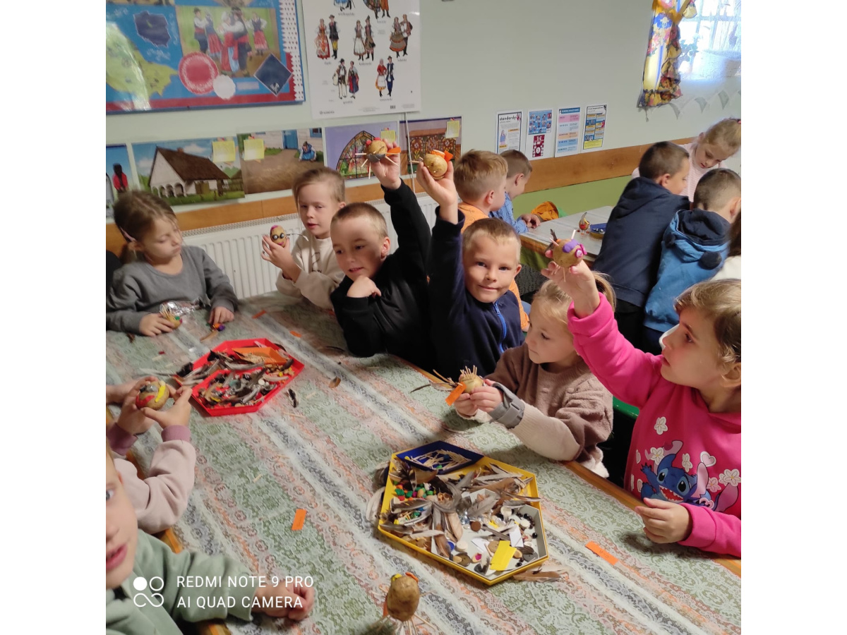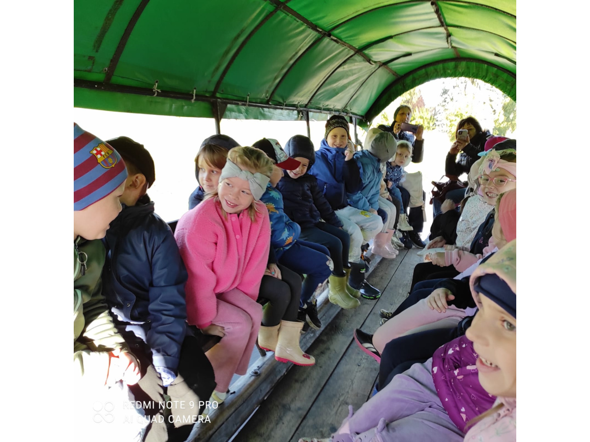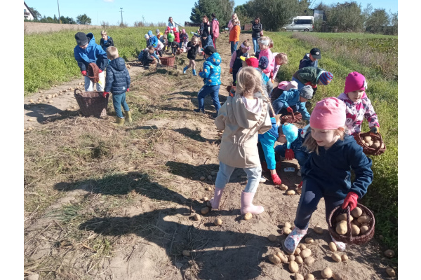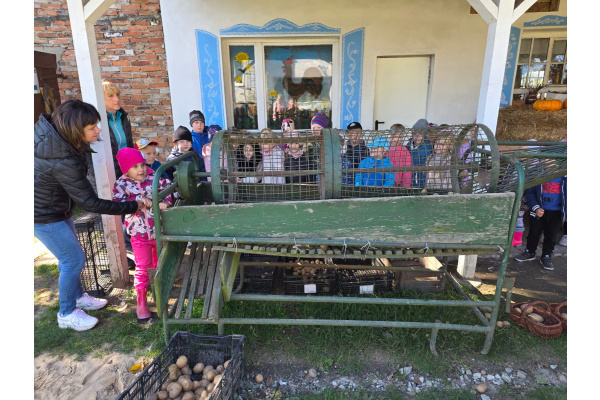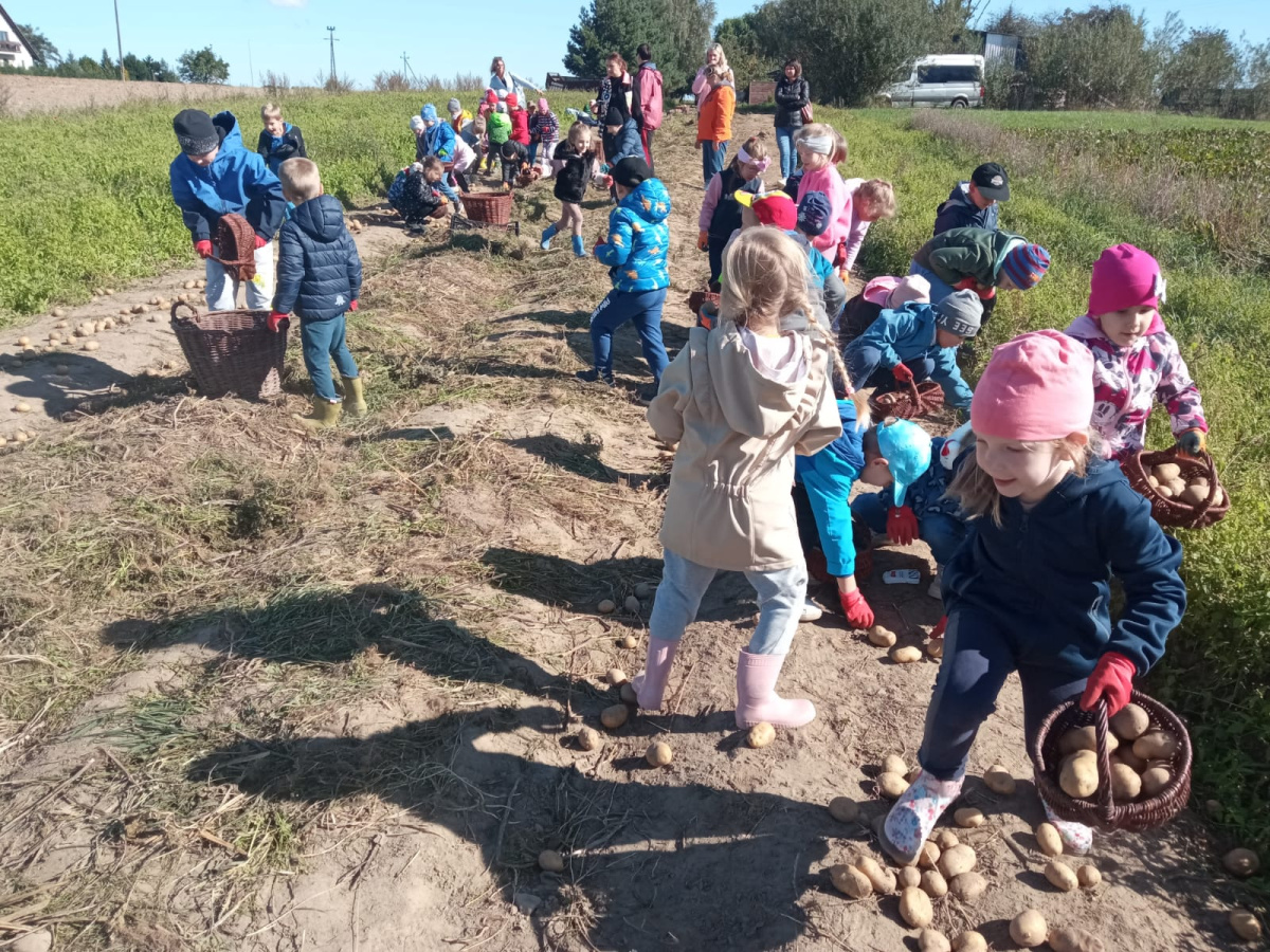 Na sam początek dnia wyruszyliśmy wozem po polach, podziwialiśmy otoczenie i klucze żurawi. Następnie rozgrzaliśmy sie przy pysznej malinowej herbatce,tworząc ziemniaczane cudaki-każdy z nas wykazał się kreatywnością. Próbowaliśmy tez smacznych ,polskich ziemniaków z pieca. Zwiedziliśmy wystawę starych przedmiotów, nakarmiliśmy głodne zwierzątka- to zadanie sprawiło nam dużo frajdy. Pobawiliśmy sie na ogromnym placu, a na koniec udaliśmy się na wykopki. To było zadanie stworzone dla wszystkich dzieci, nikt tak szybko jak Sówki i Biedronki nie potrafi zbierać na polu ziemniaków. Zmęczeni i zadowoleni wróciliśmy do przedszkola na pyszny obiadek.