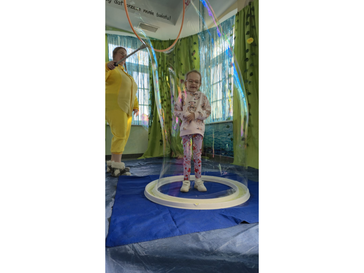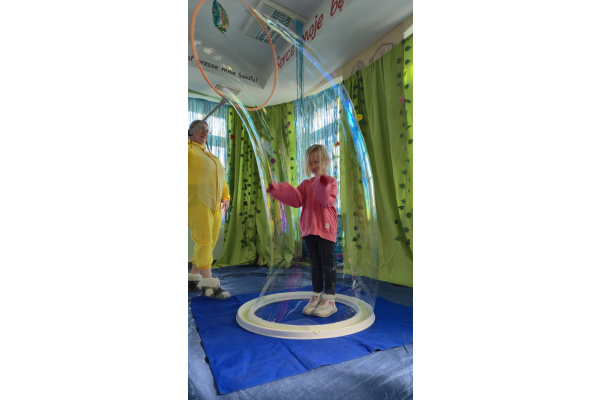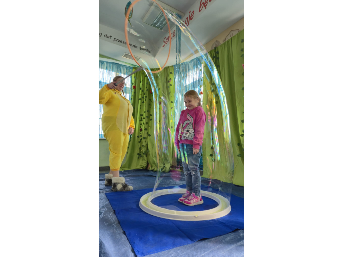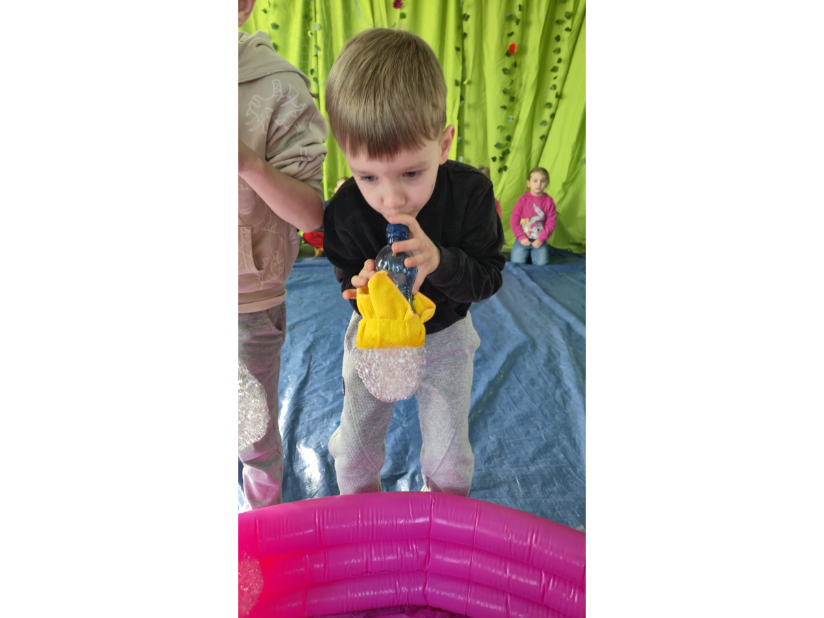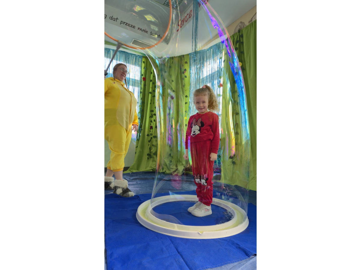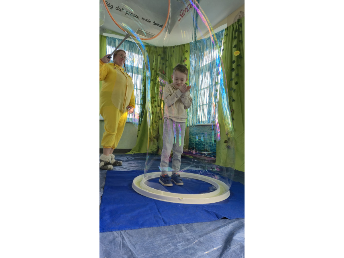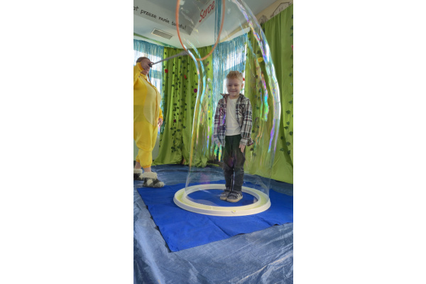 Następnie grupa udała się z wizytą do nory króliczka, gdzie mogła zajrzeć do zaczarowanego świata małych leśnych stworzeń. Dużo radości sprawiła również wizyta w bańkowym kurniku, który zachwycił dzieci kolorowymi bańkami, lekkimi jak piórko i unoszącymi się w rytmie wiosennego wiatru.