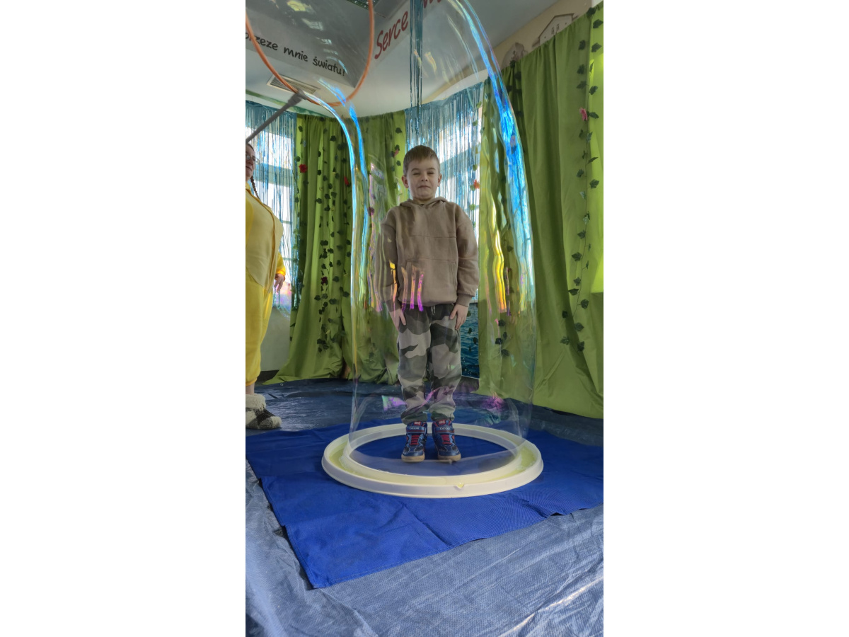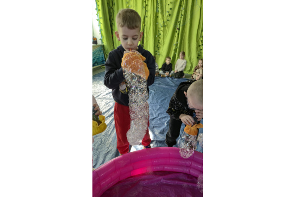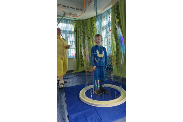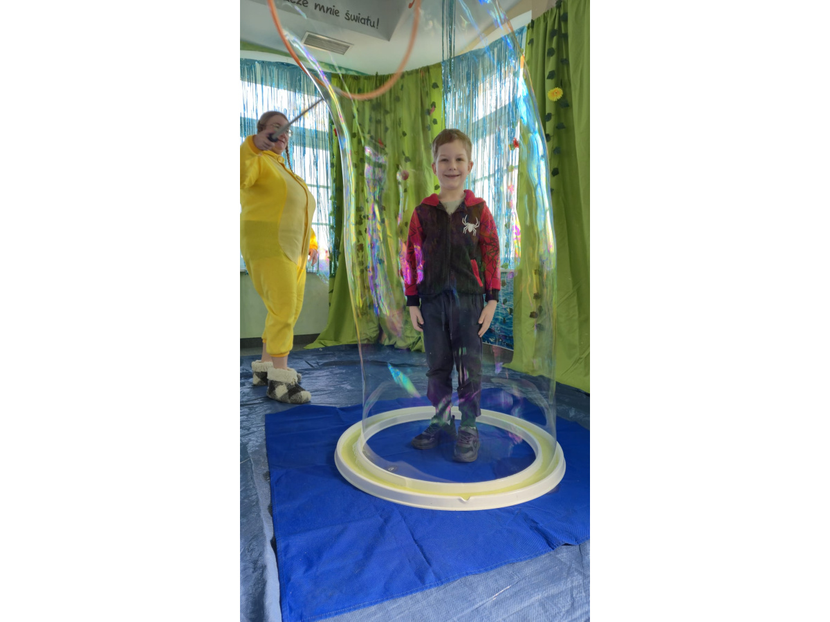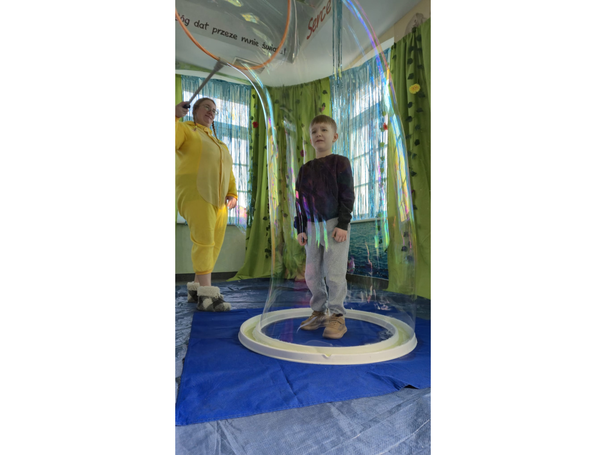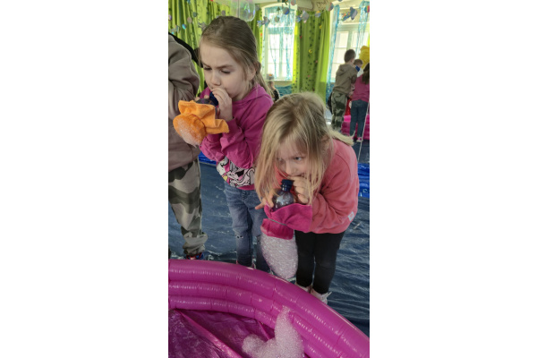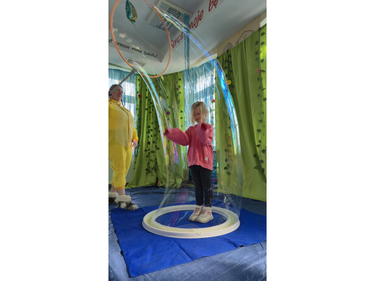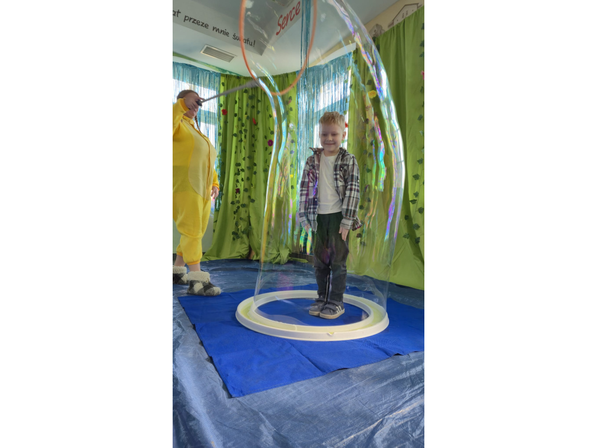 Następnie grupa udała się z wizytą do nory króliczka, gdzie mogła zajrzeć do zaczarowanego świata małych leśnych stworzeń. Dużo radości sprawiła również wizyta w bańkowym kurniku, który zachwycił dzieci kolorowymi bańkami, lekkimi jak piórko i unoszącymi się w rytmie wiosennego wiatru.