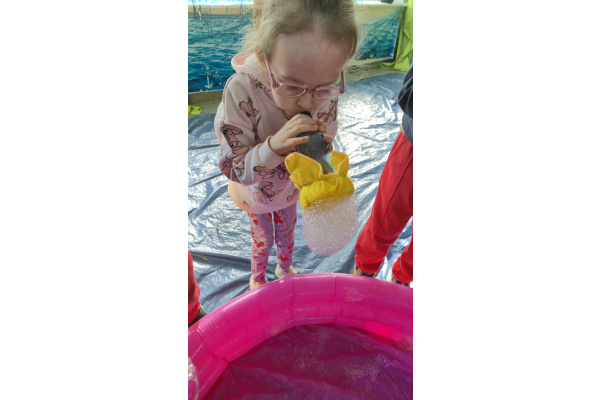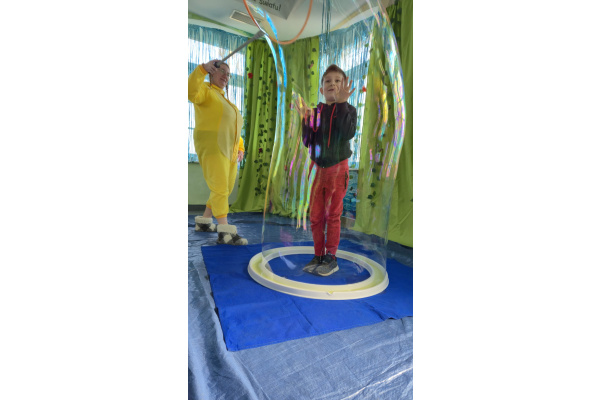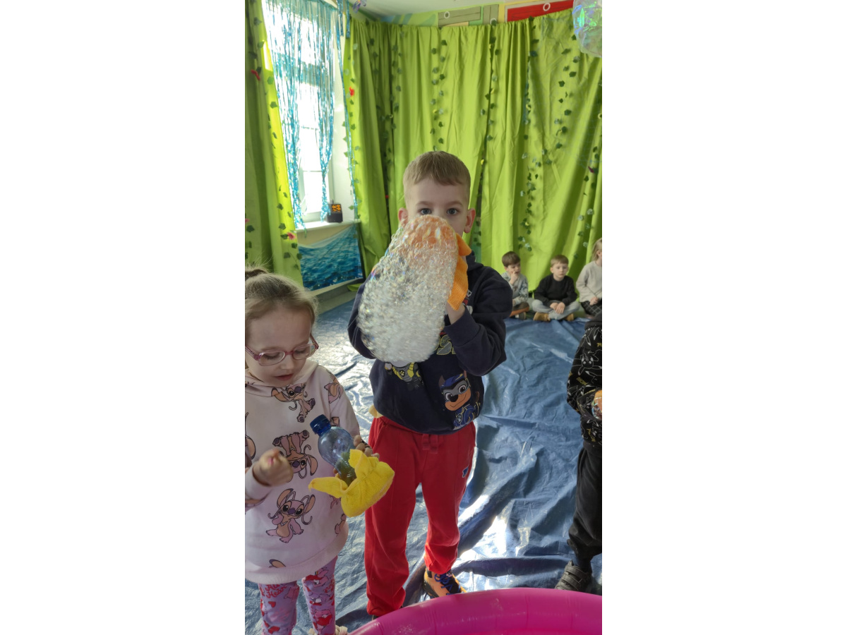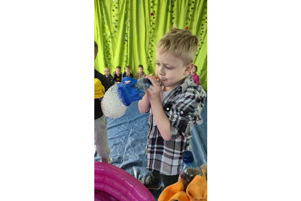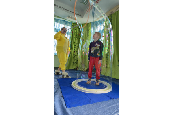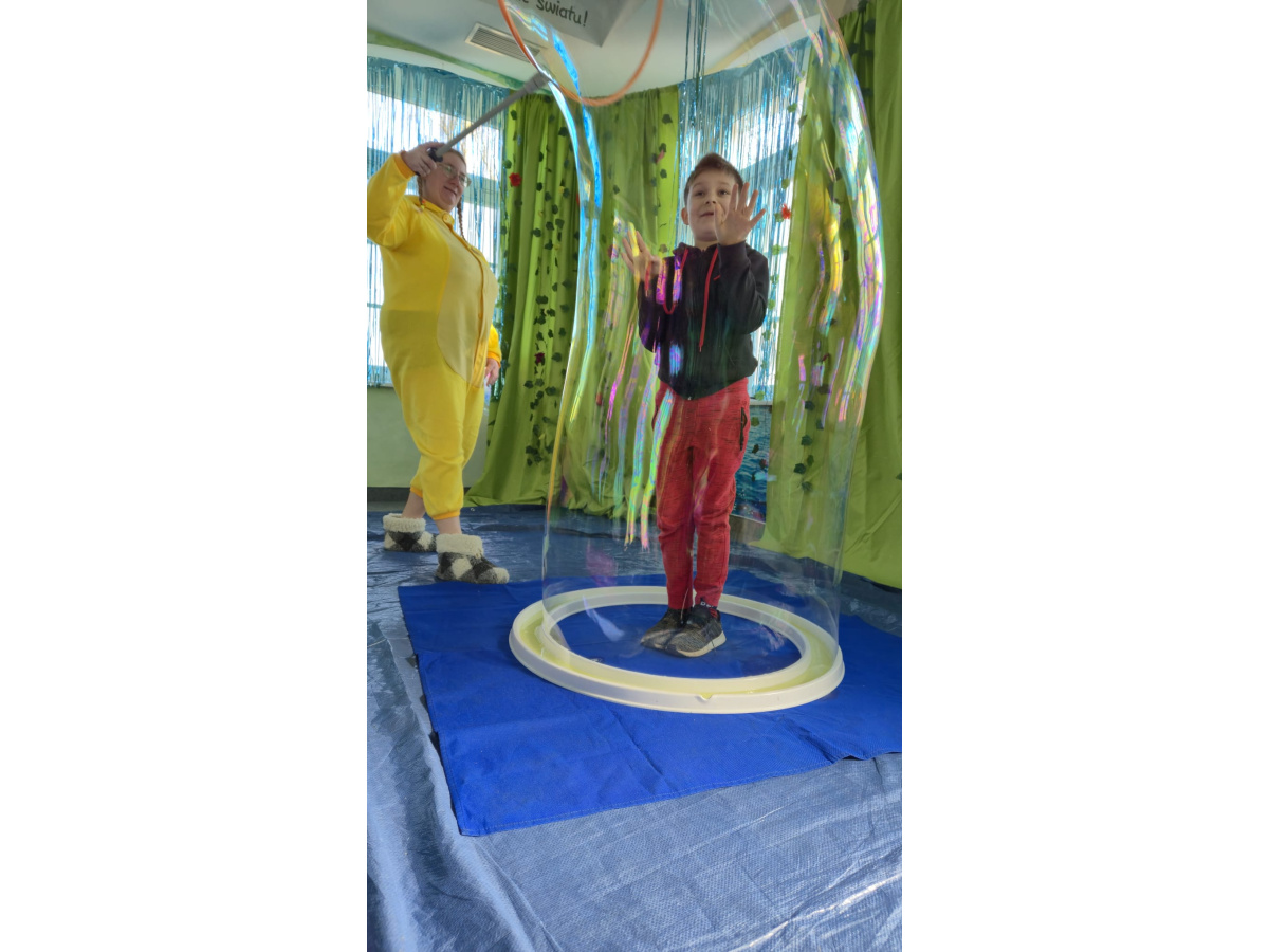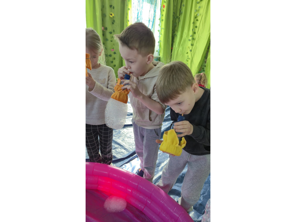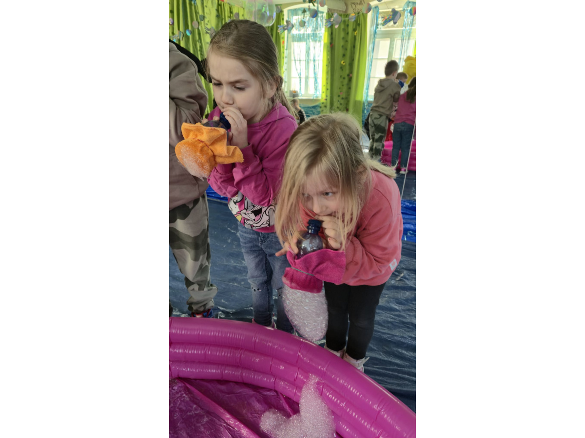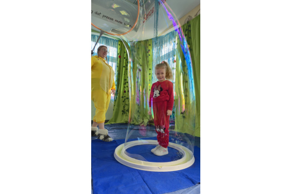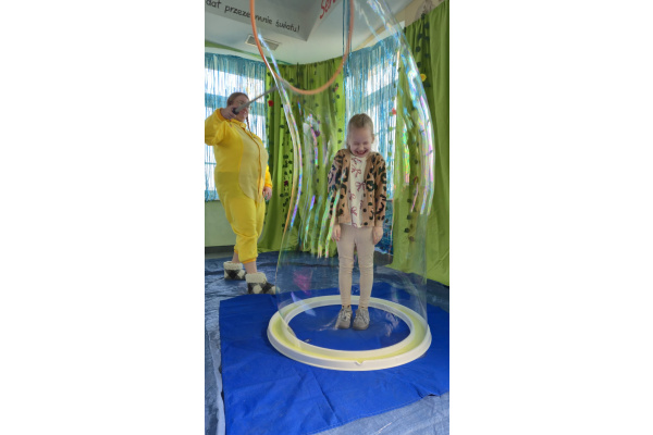 Następnie grupa udała się z wizytą do nory króliczka, gdzie mogła zajrzeć do zaczarowanego świata małych leśnych stworzeń. Dużo radości sprawiła również wizyta w bańkowym kurniku, który zachwycił dzieci kolorowymi bańkami, lekkimi jak piórko i unoszącymi się w rytmie wiosennego wiatru.