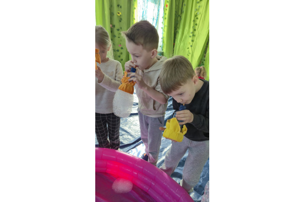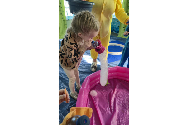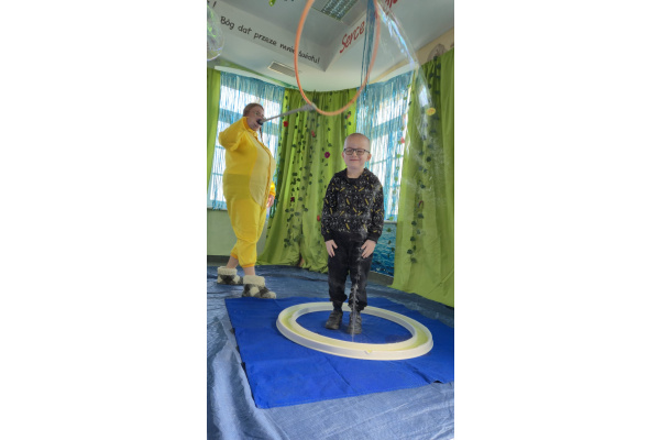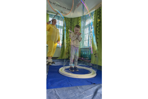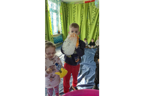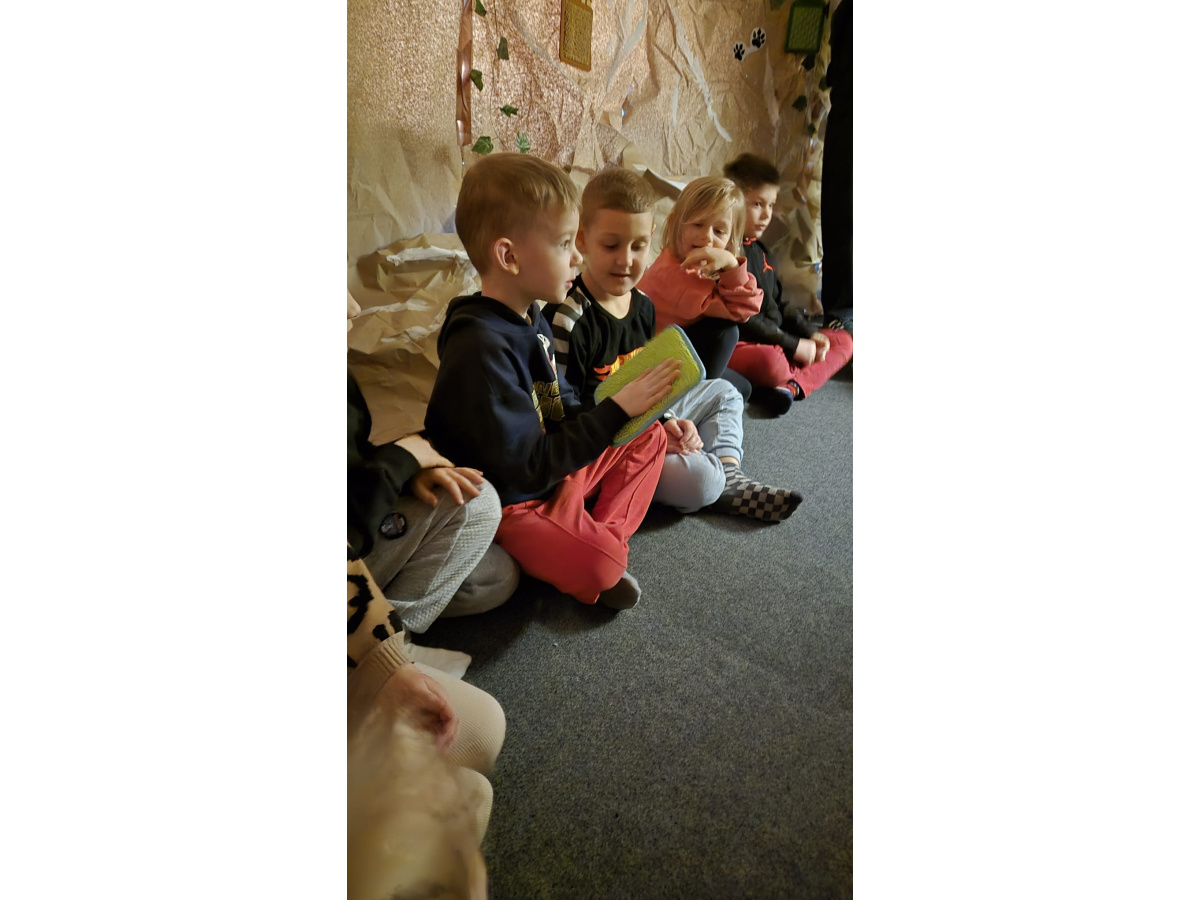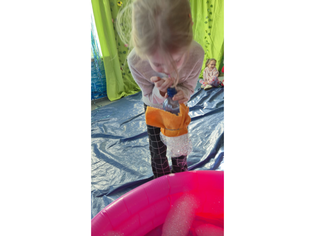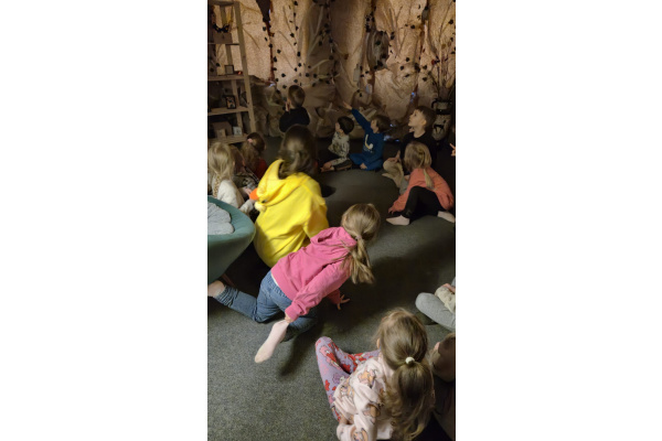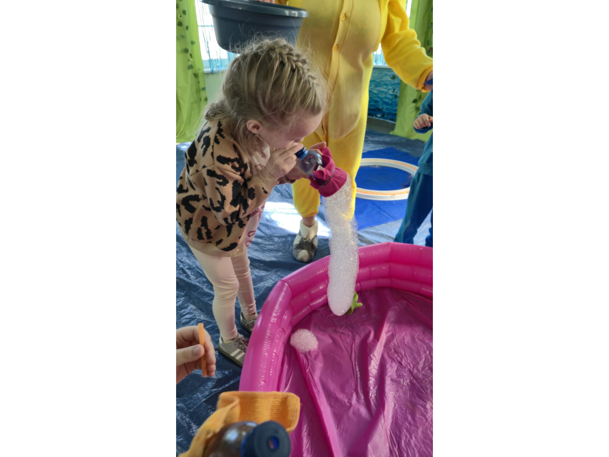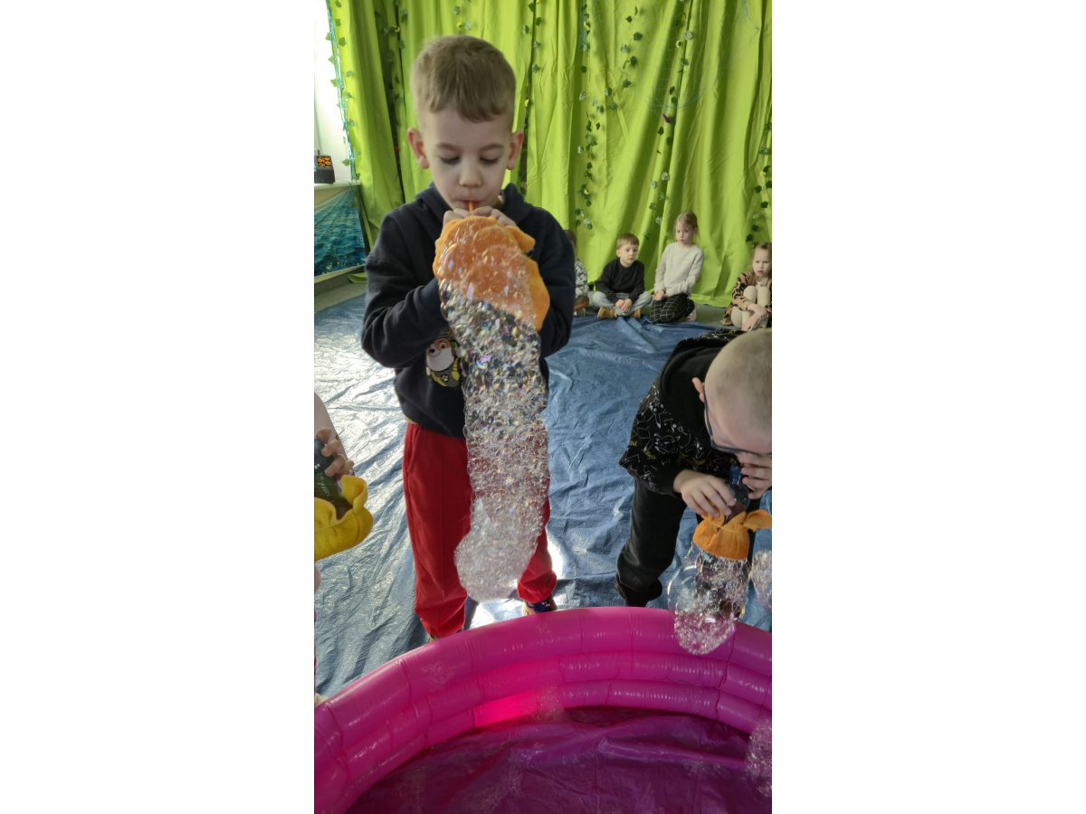 Następnie grupa udała się z wizytą do nory króliczka, gdzie mogła zajrzeć do zaczarowanego świata małych leśnych stworzeń. Dużo radości sprawiła również wizyta w bańkowym kurniku, który zachwycił dzieci kolorowymi bańkami, lekkimi jak piórko i unoszącymi się w rytmie wiosennego wiatru.