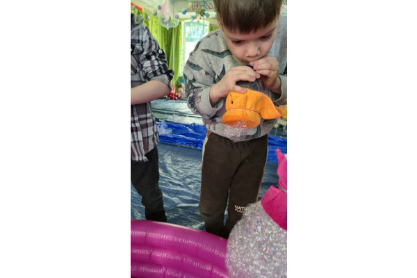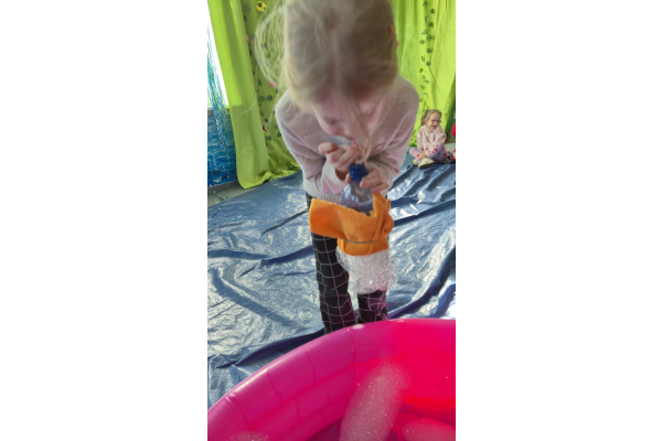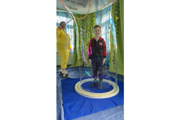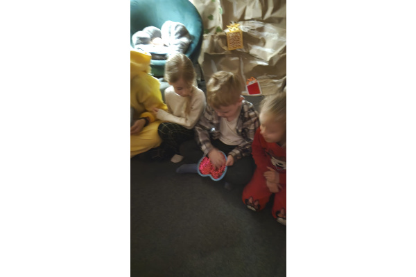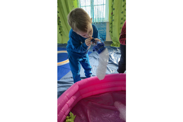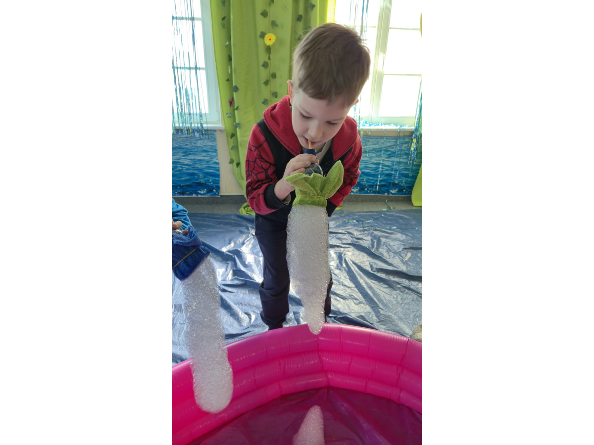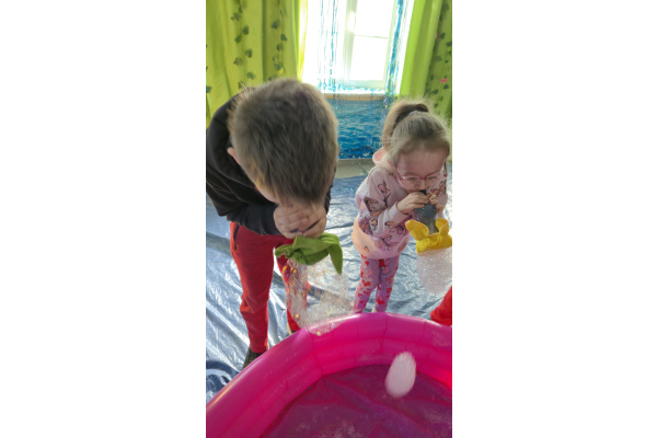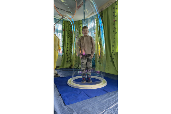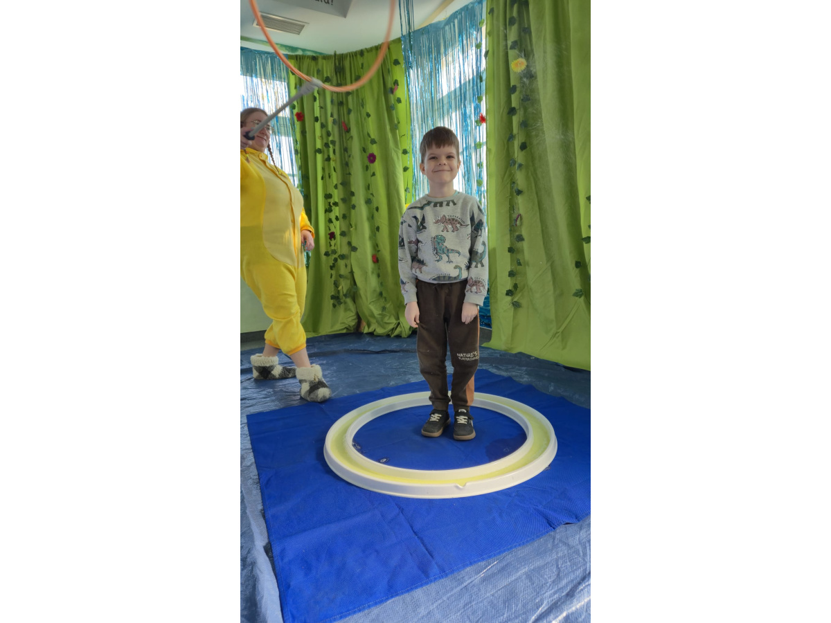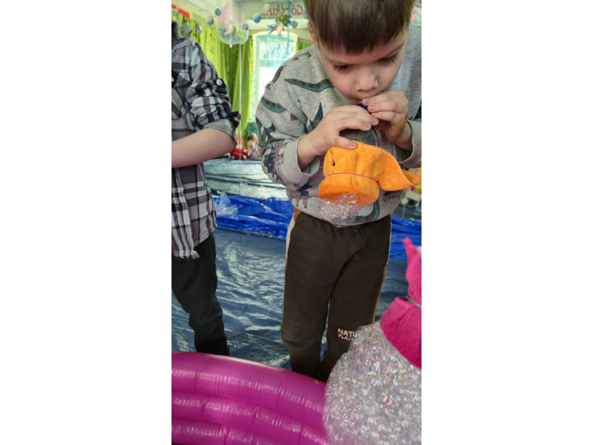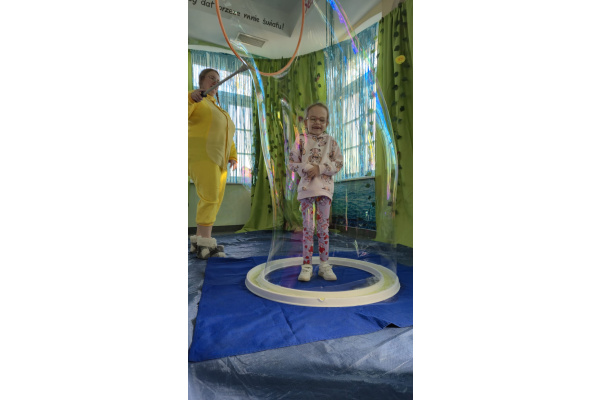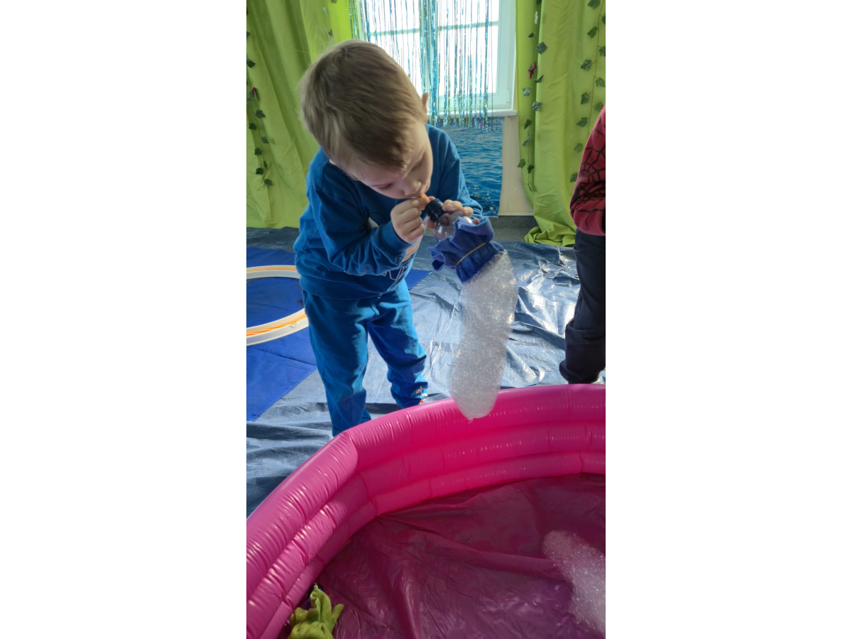 Następnie grupa udała się z wizytą do nory króliczka, gdzie mogła zajrzeć do zaczarowanego świata małych leśnych stworzeń. Dużo radości sprawiła również wizyta w bańkowym kurniku, który zachwycił dzieci kolorowymi bańkami, lekkimi jak piórko i unoszącymi się w rytmie wiosennego wiatru.