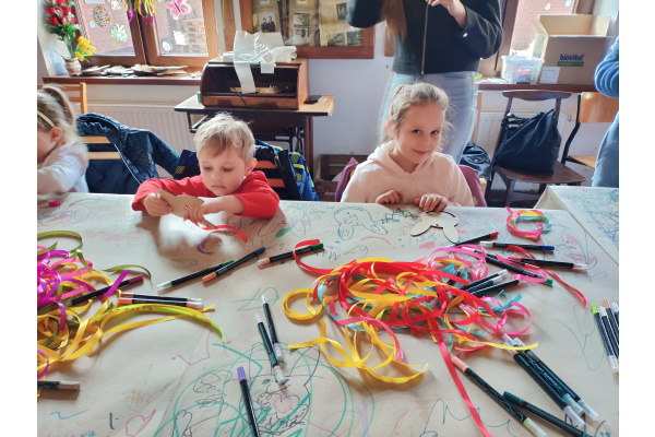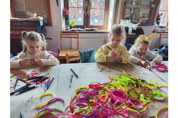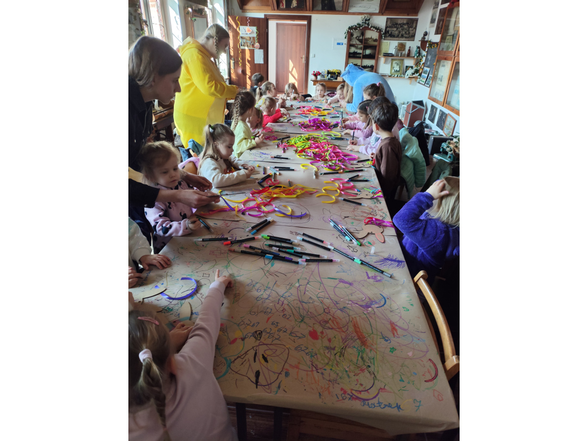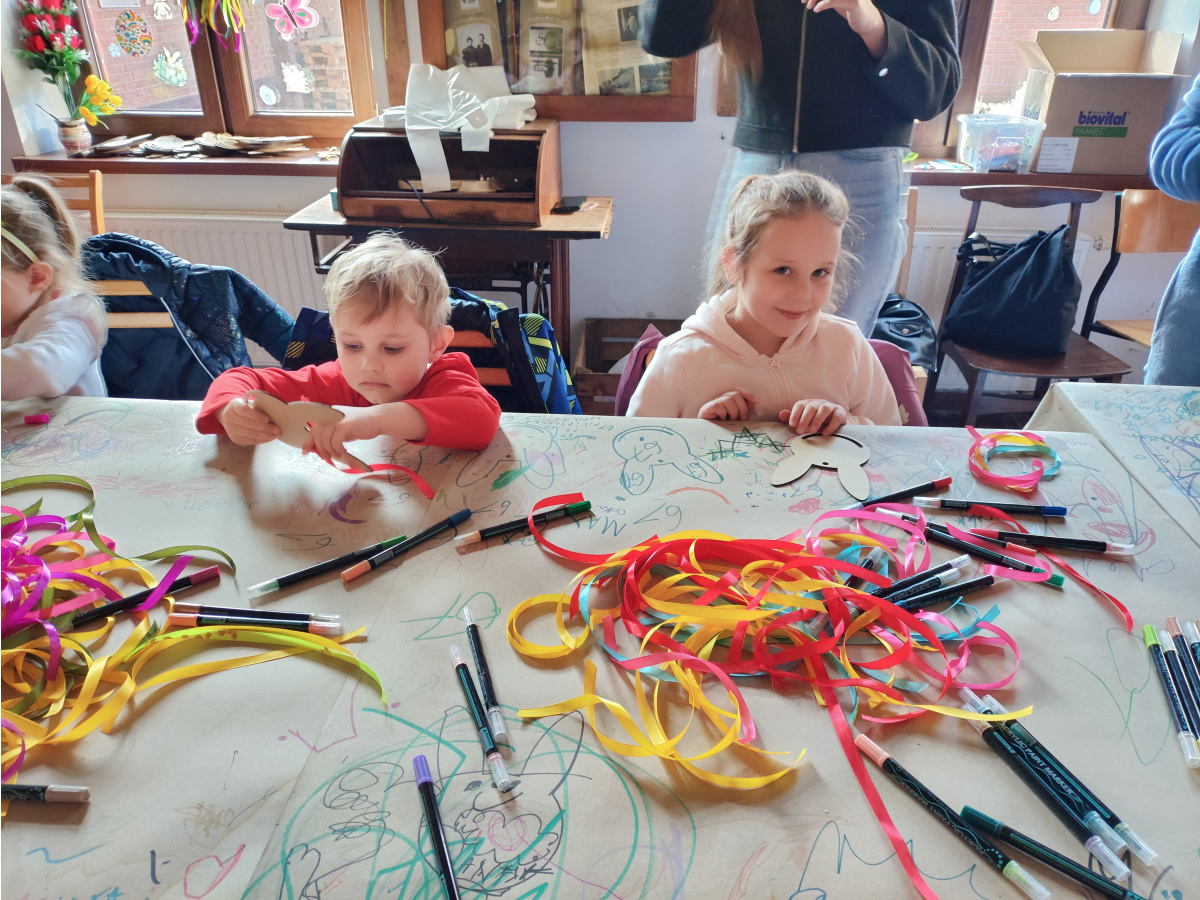 Jednym z pierwszych punktów programu były warsztaty plastyczne, podczas których przedszkolaki tworzyły swoje własne łapacze snów z motywem zajączka. Dzieci z zaangażowaniem ozdabiały swoje prace kolorowymi wstążkami i wielkanocnymi akcentami, a każdy łapacz stał się niepowtarzalnym, małym dziełem sztuki.