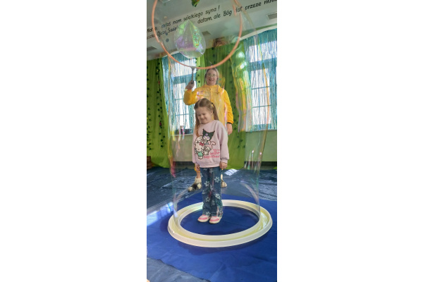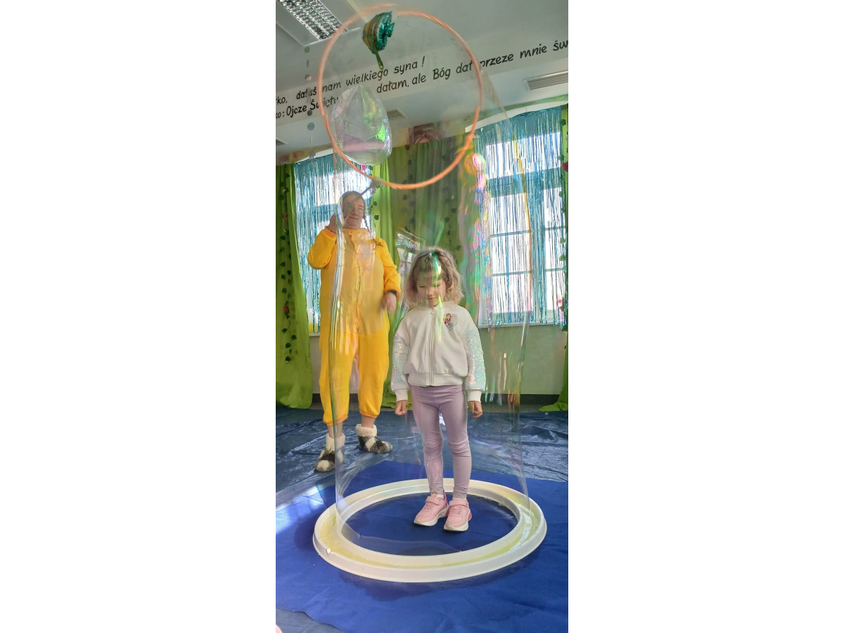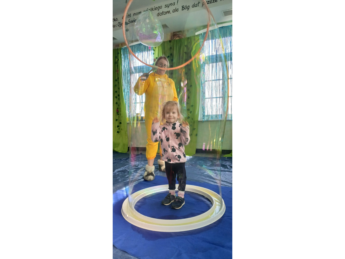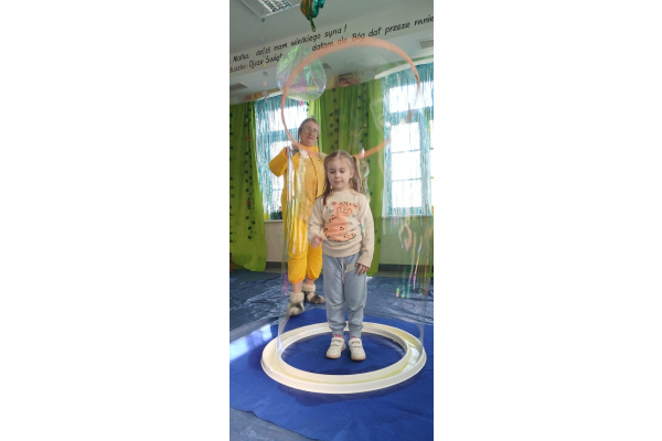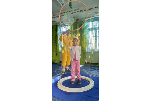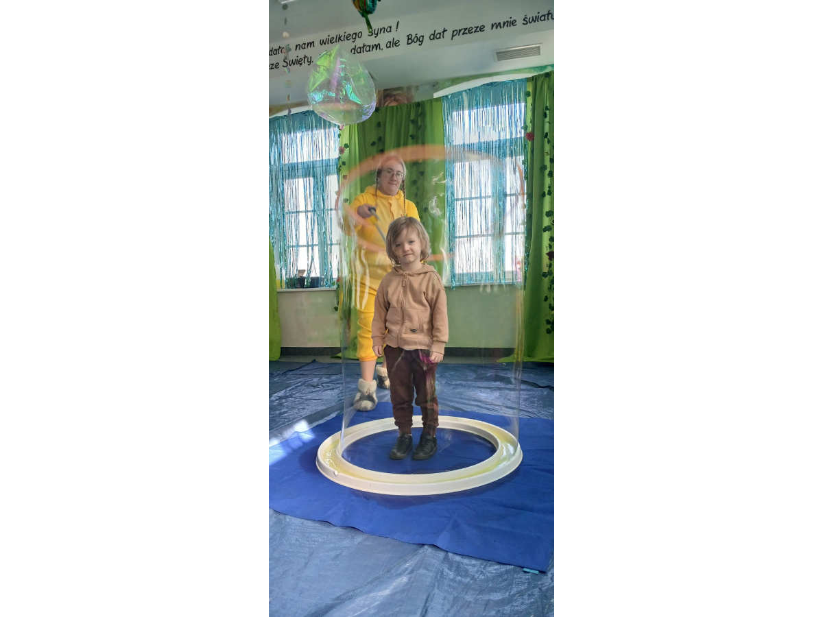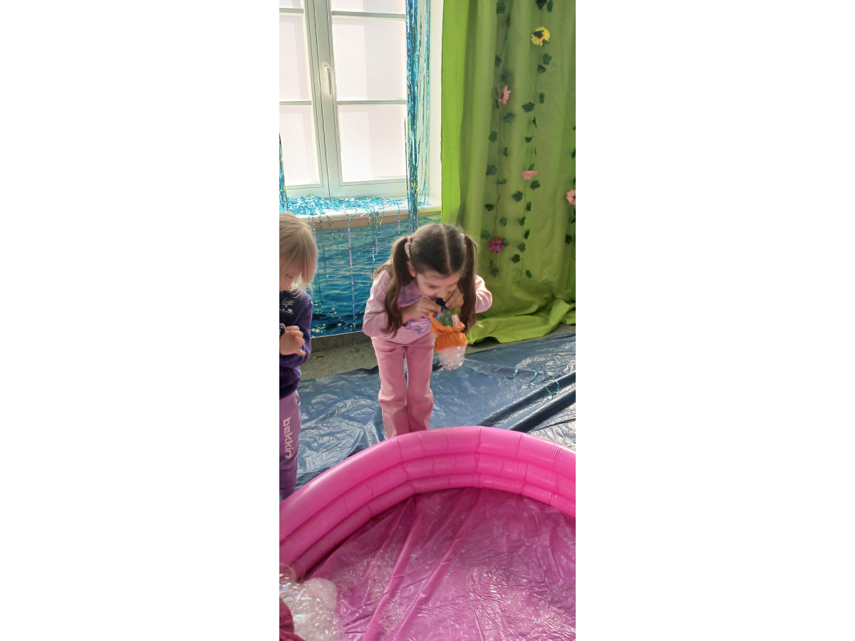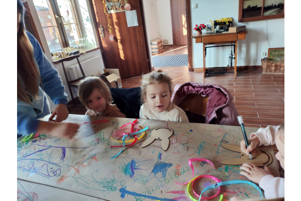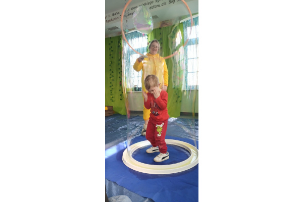 Następnie grupa udała się z wizytą do nory króliczka, gdzie mogła zajrzeć do zaczarowanego świata małych leśnych stworzeń. Dużo radości sprawiła również wizyta w bańkowym kurniku, który zachwycił dzieci kolorowymi bańkami, lekkimi jak piórko i unoszącymi się w rytmie wiosennego wiatru.