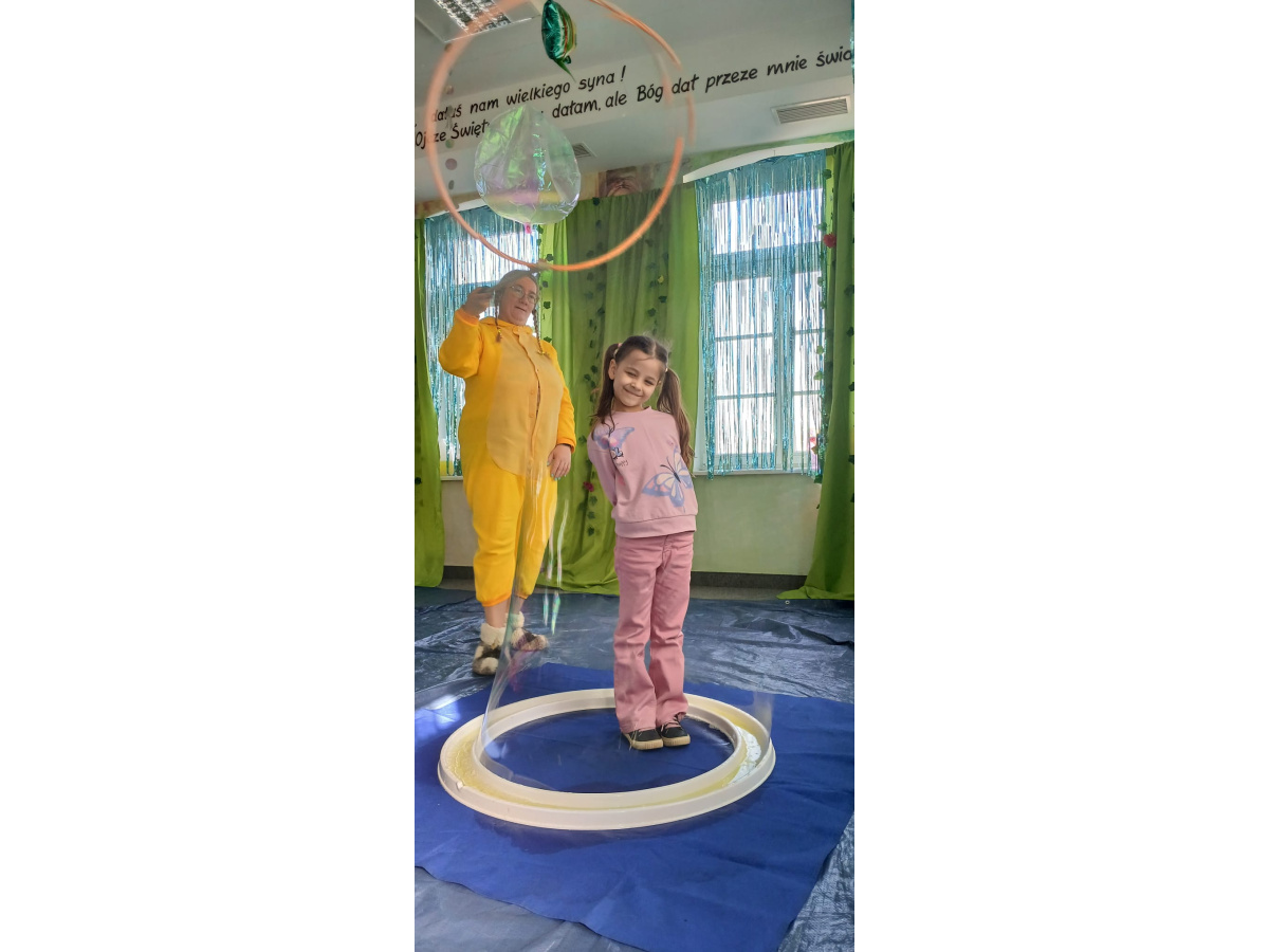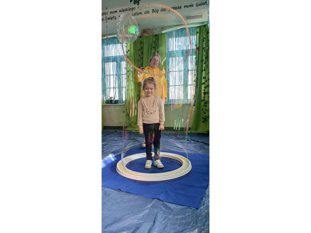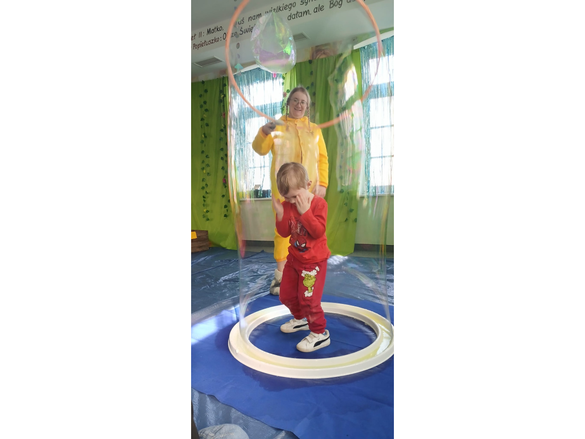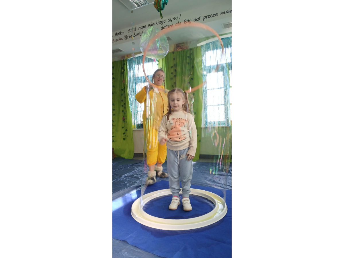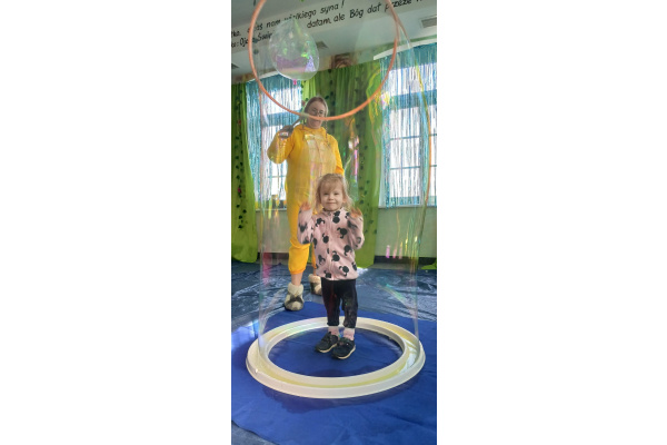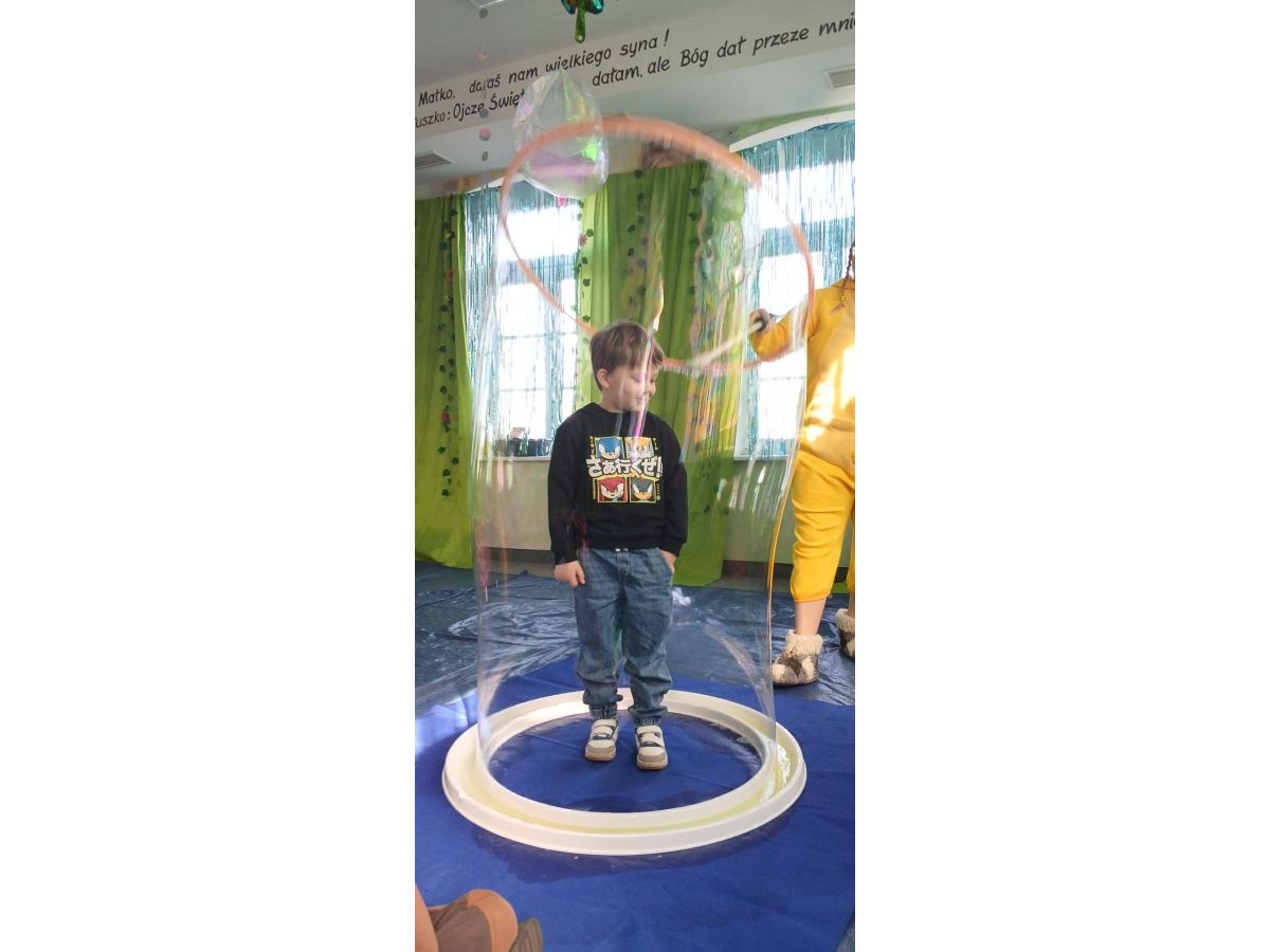Następnie grupa udała się z wizytą do nory króliczka, gdzie mogła zajrzeć do zaczarowanego świata małych leśnych stworzeń. Dużo radości sprawiła również wizyta w bańkowym kurniku, który zachwycił dzieci kolorowymi bańkami, lekkimi jak piórko i unoszącymi się w rytmie wiosennego wiatru.