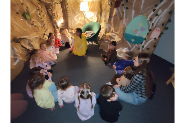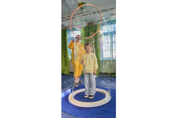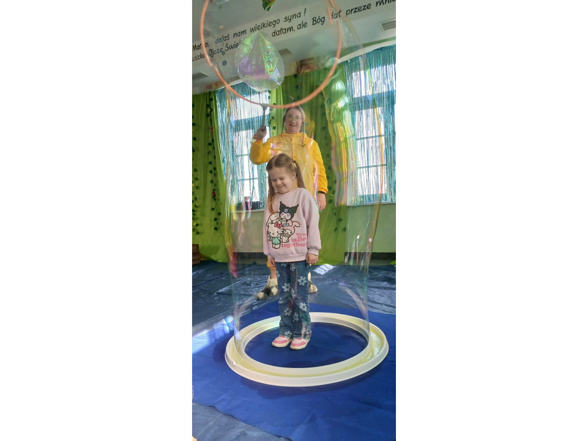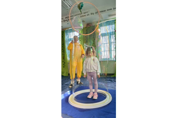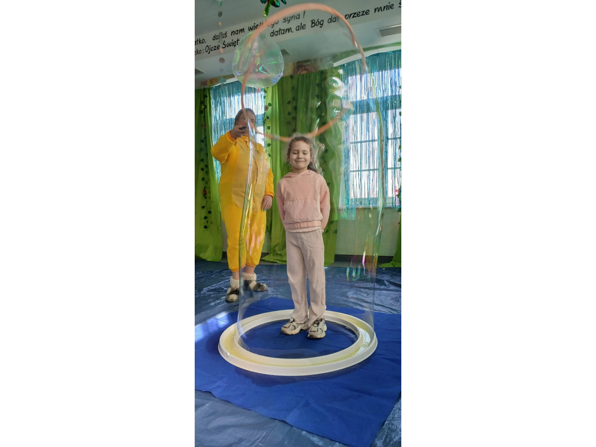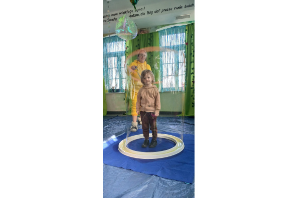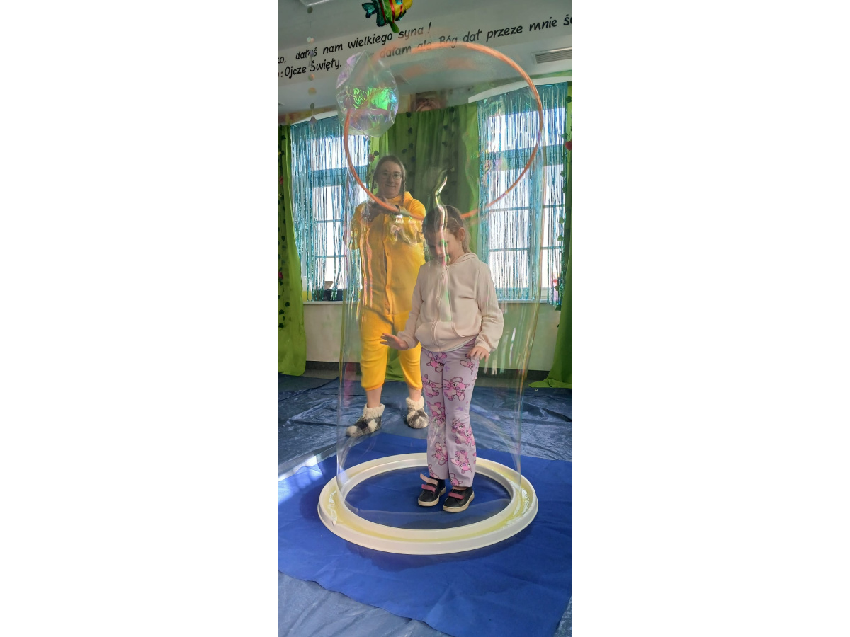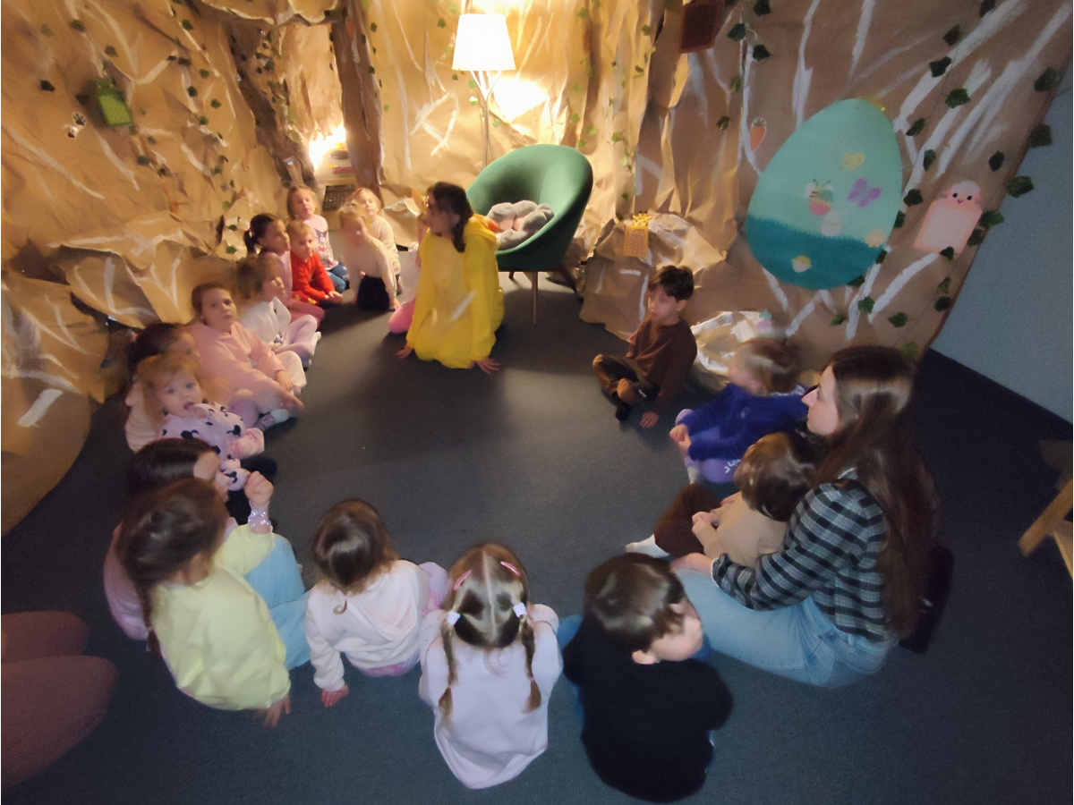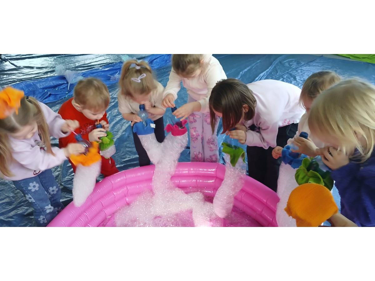 Następnie grupa udała się z wizytą do nory króliczka, gdzie mogła zajrzeć do zaczarowanego świata małych leśnych stworzeń. Dużo radości sprawiła również wizyta w bańkowym kurniku, który zachwycił dzieci kolorowymi bańkami, lekkimi jak piórko i unoszącymi się w rytmie wiosennego wiatru.