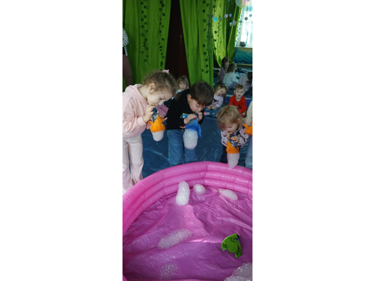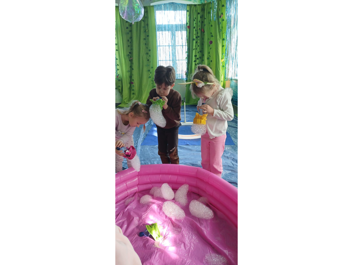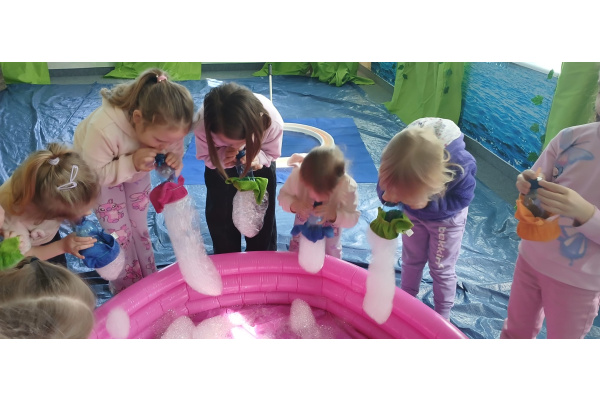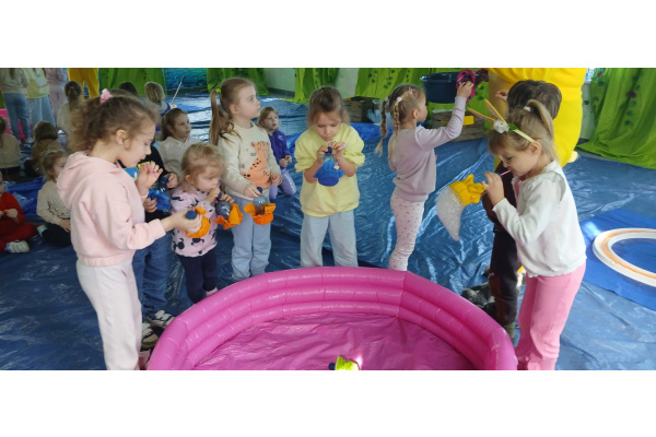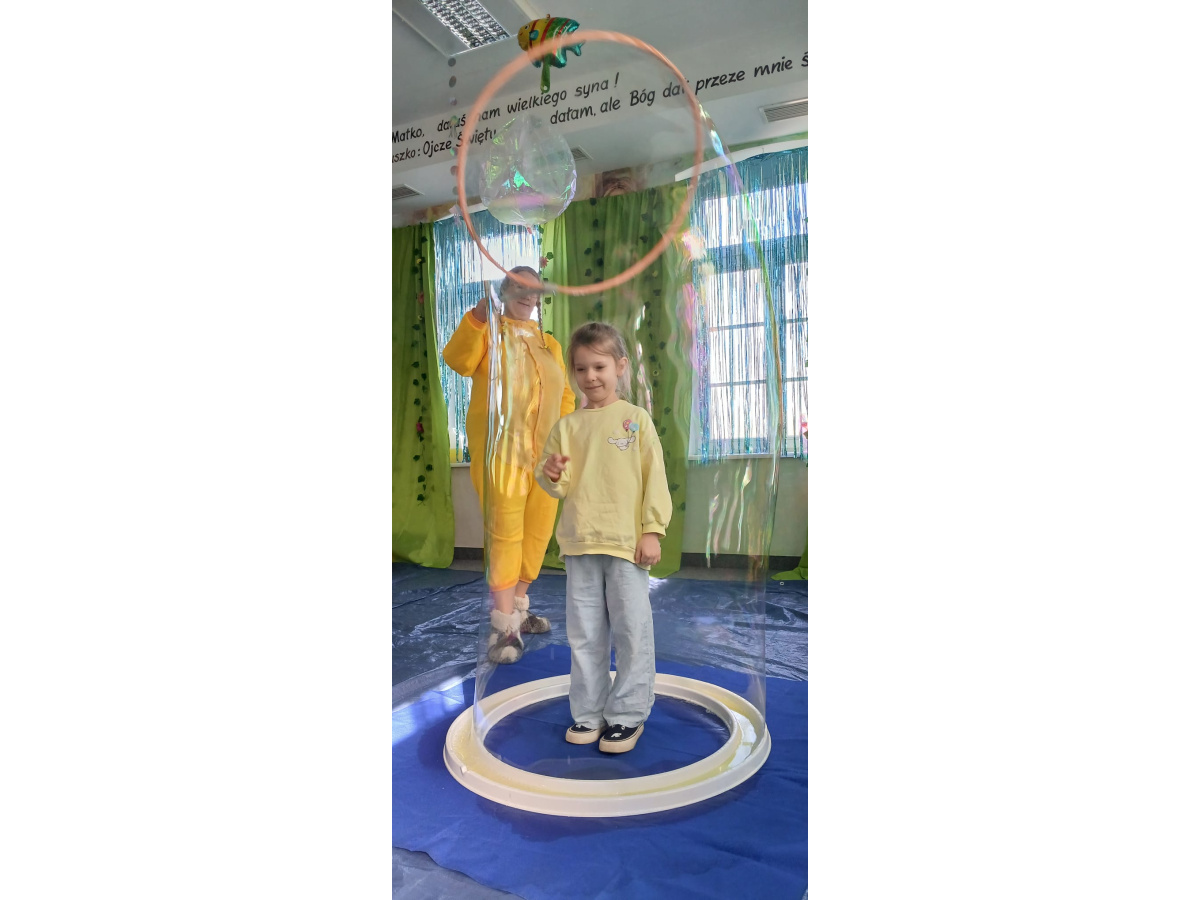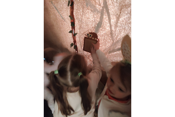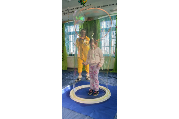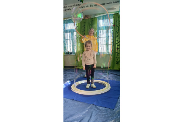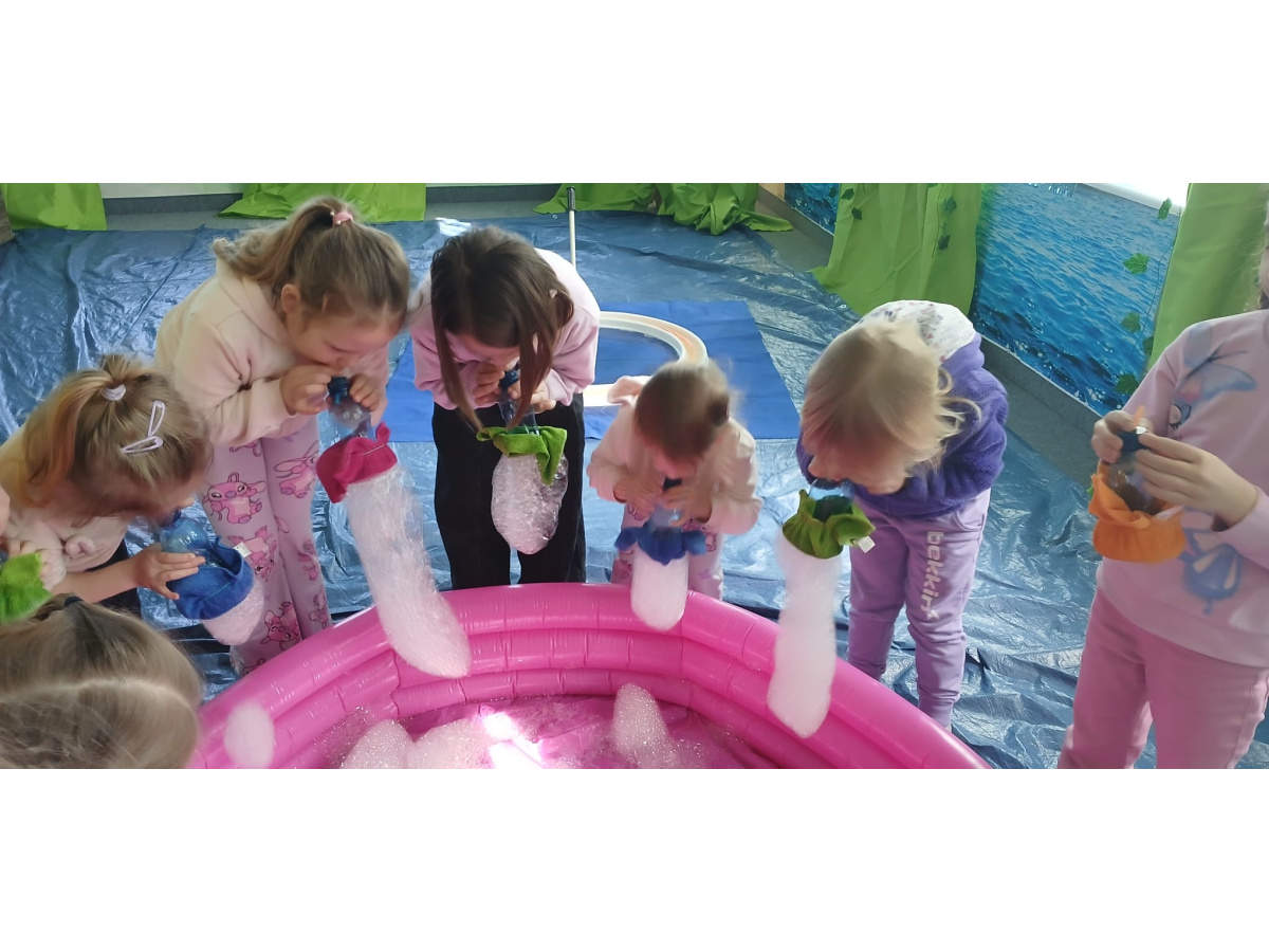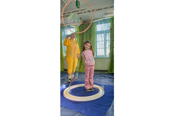 Następnie grupa udała się z wizytą do nory króliczka, gdzie mogła zajrzeć do zaczarowanego świata małych leśnych stworzeń. Dużo radości sprawiła również wizyta w bańkowym kurniku, który zachwycił dzieci kolorowymi bańkami, lekkimi jak piórko i unoszącymi się w rytmie wiosennego wiatru.