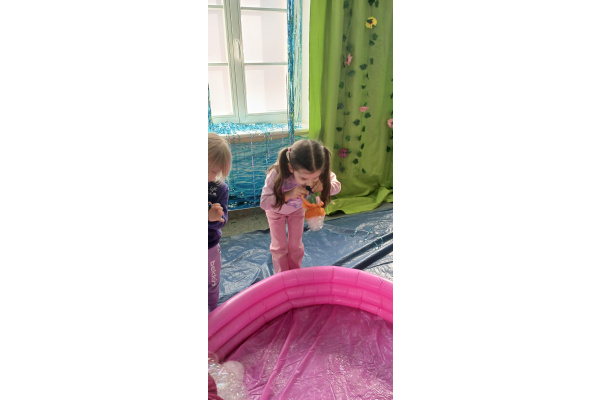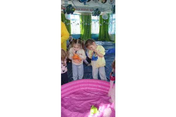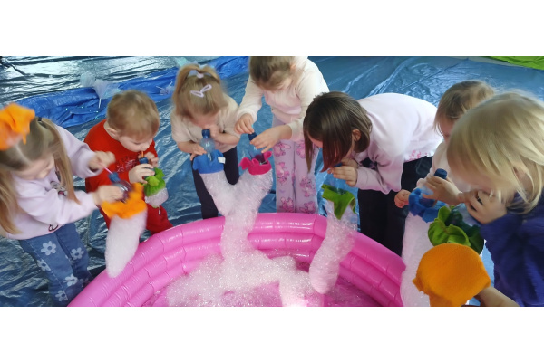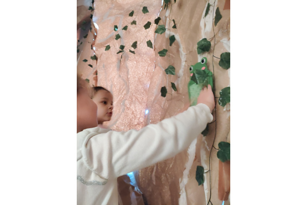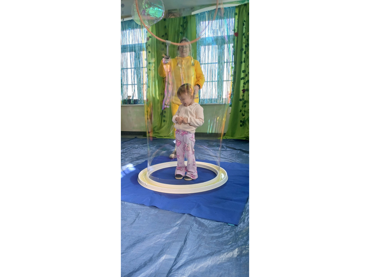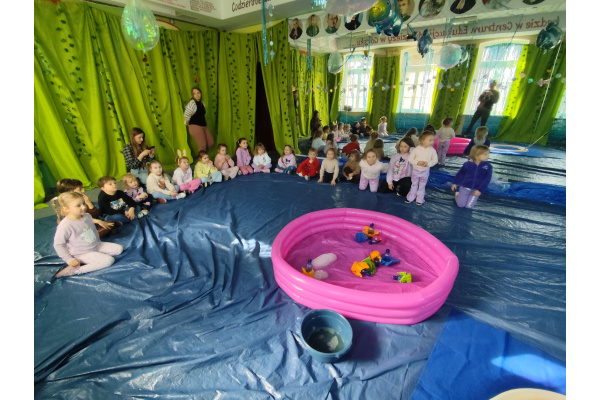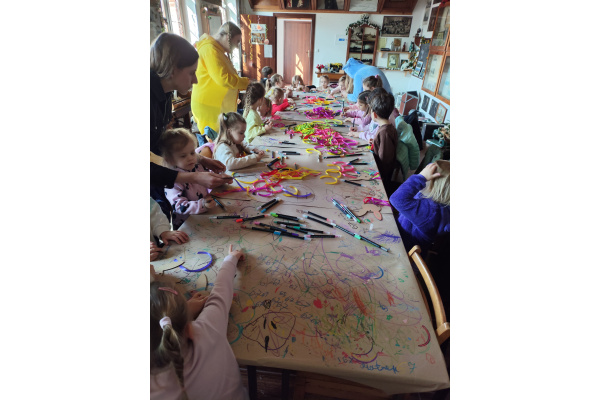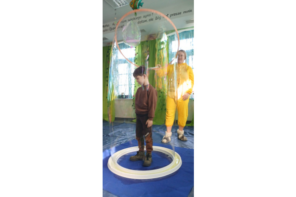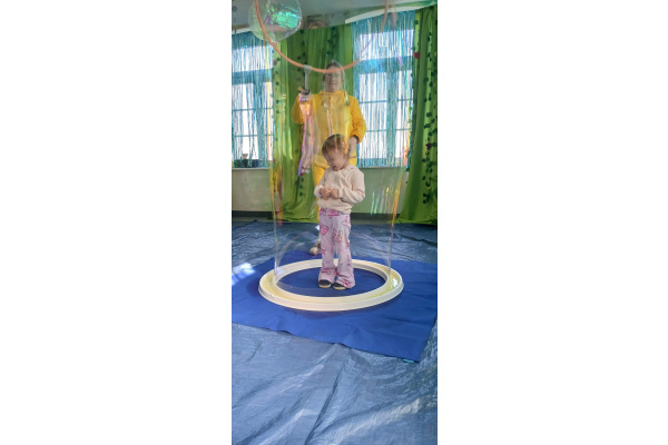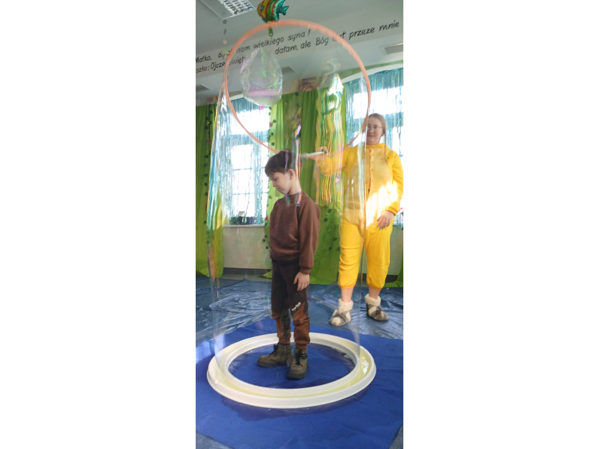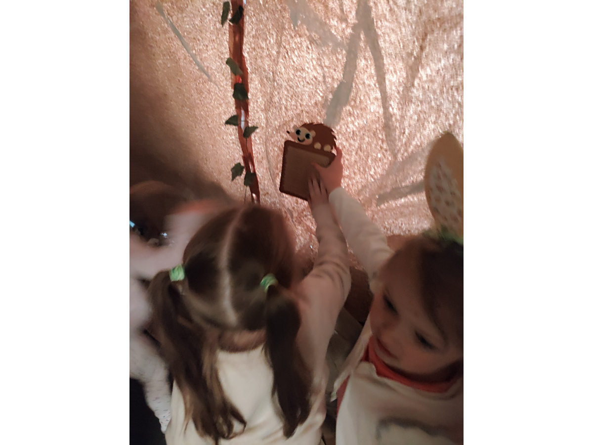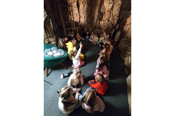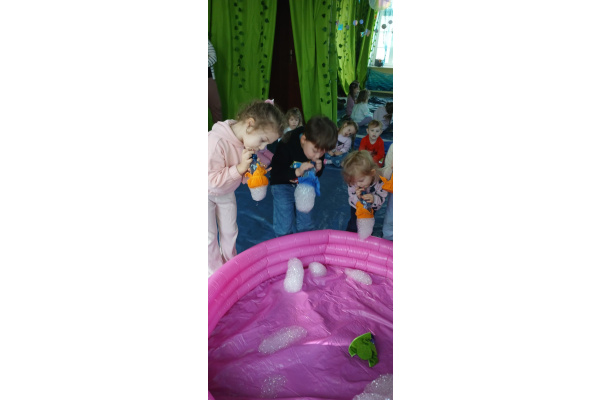 Następnie grupa udała się z wizytą do nory króliczka, gdzie mogła zajrzeć do zaczarowanego świata małych leśnych stworzeń. Dużo radości sprawiła również wizyta w bańkowym kurniku, który zachwycił dzieci kolorowymi bańkami, lekkimi jak piórko i unoszącymi się w rytmie wiosennego wiatru.