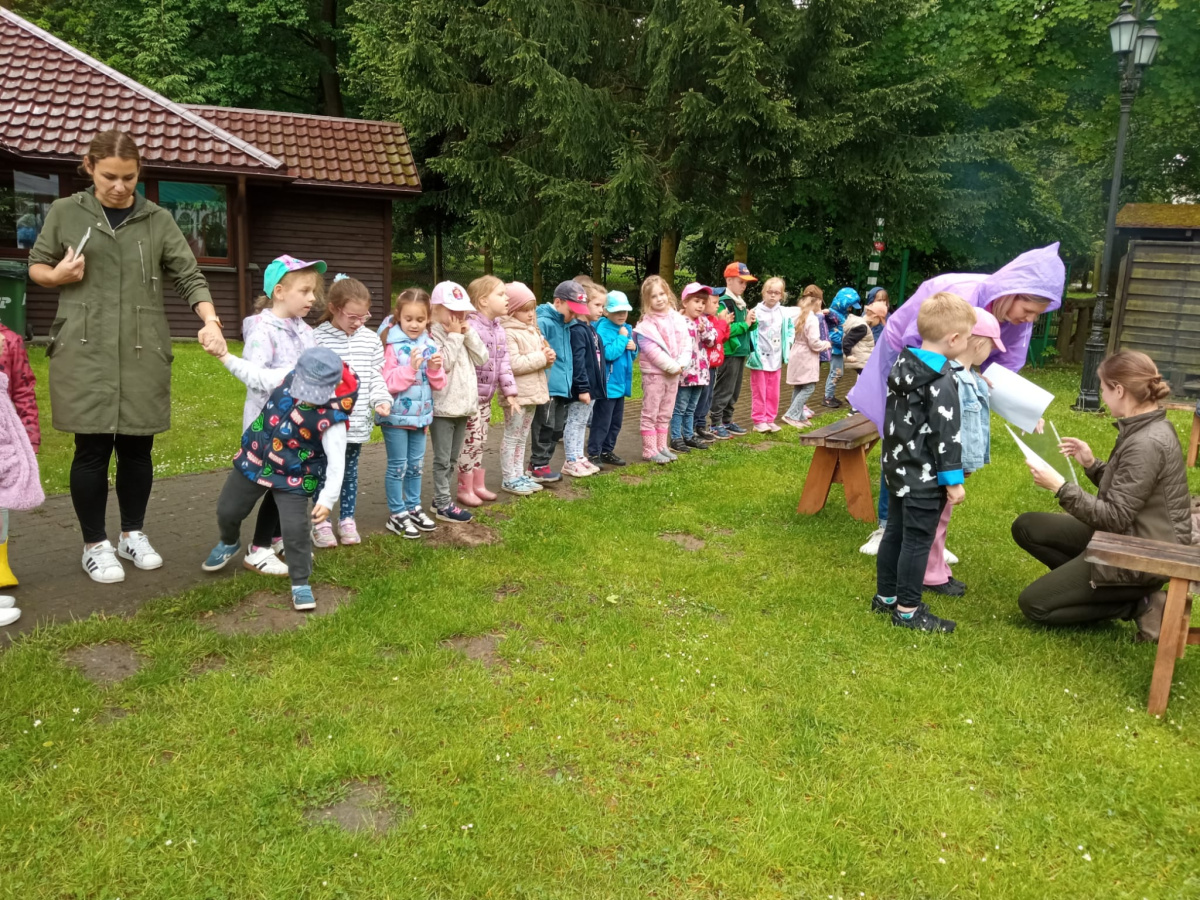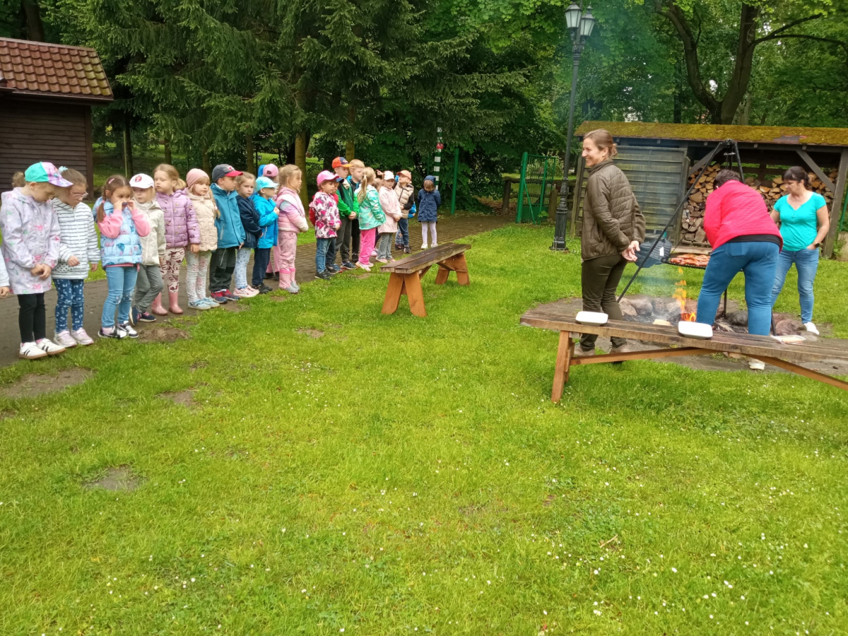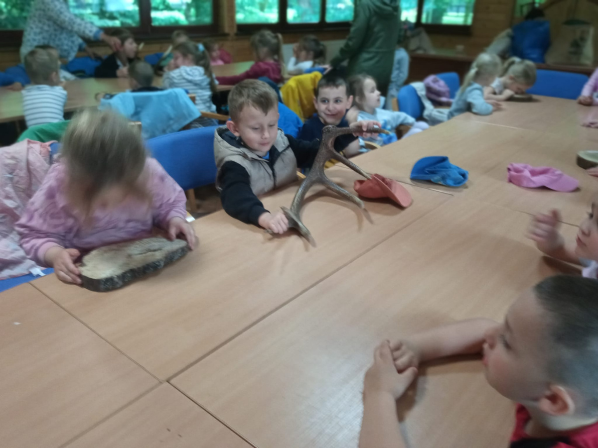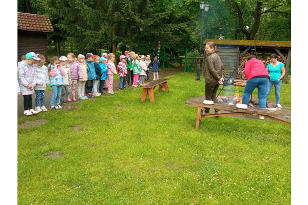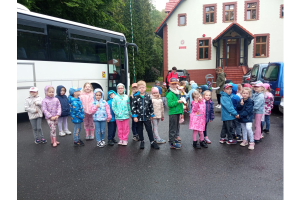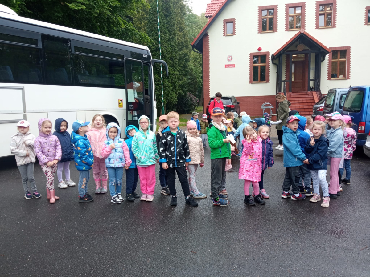 Mimo niesprzyjającej pogody ,dzieci były bardzo podekscytowane. Celem wycieczki było rozbudzenie zainteresowań pięknem i bogactwem środowiska przyrodniczego. Dzieci uczestniczyły w zajęciach edukacyjnych podczas których zdobywały informacje na temat lasu,jego mieszkańców i roślinności. Warsztaty z Panią Leśnik zakończyły się ogniskiem i pieczeniem kiełbasek.