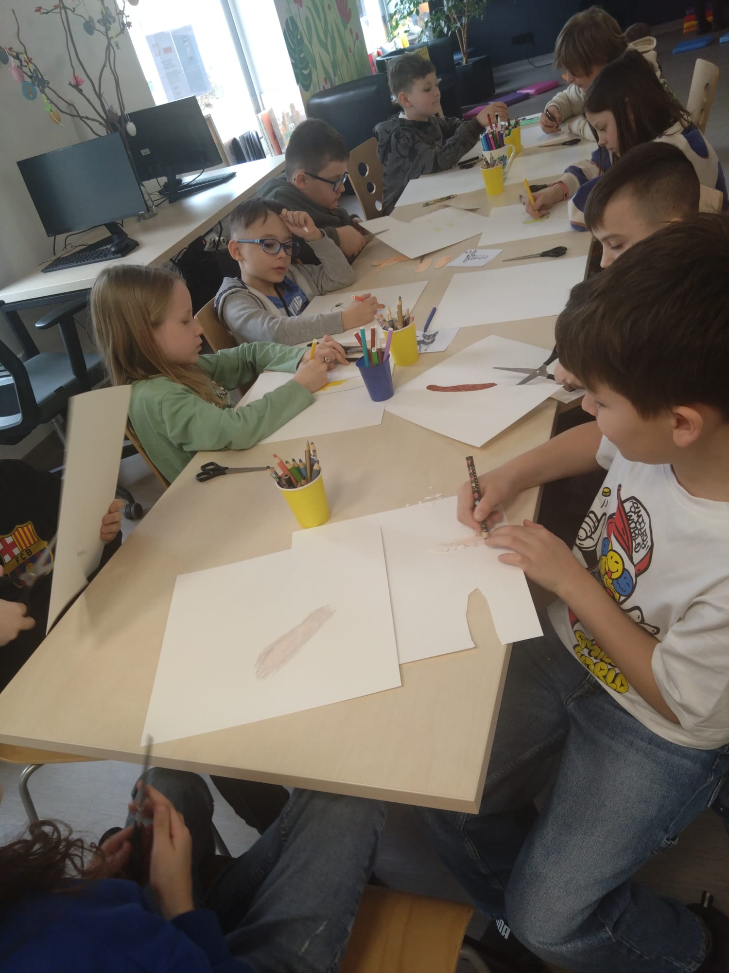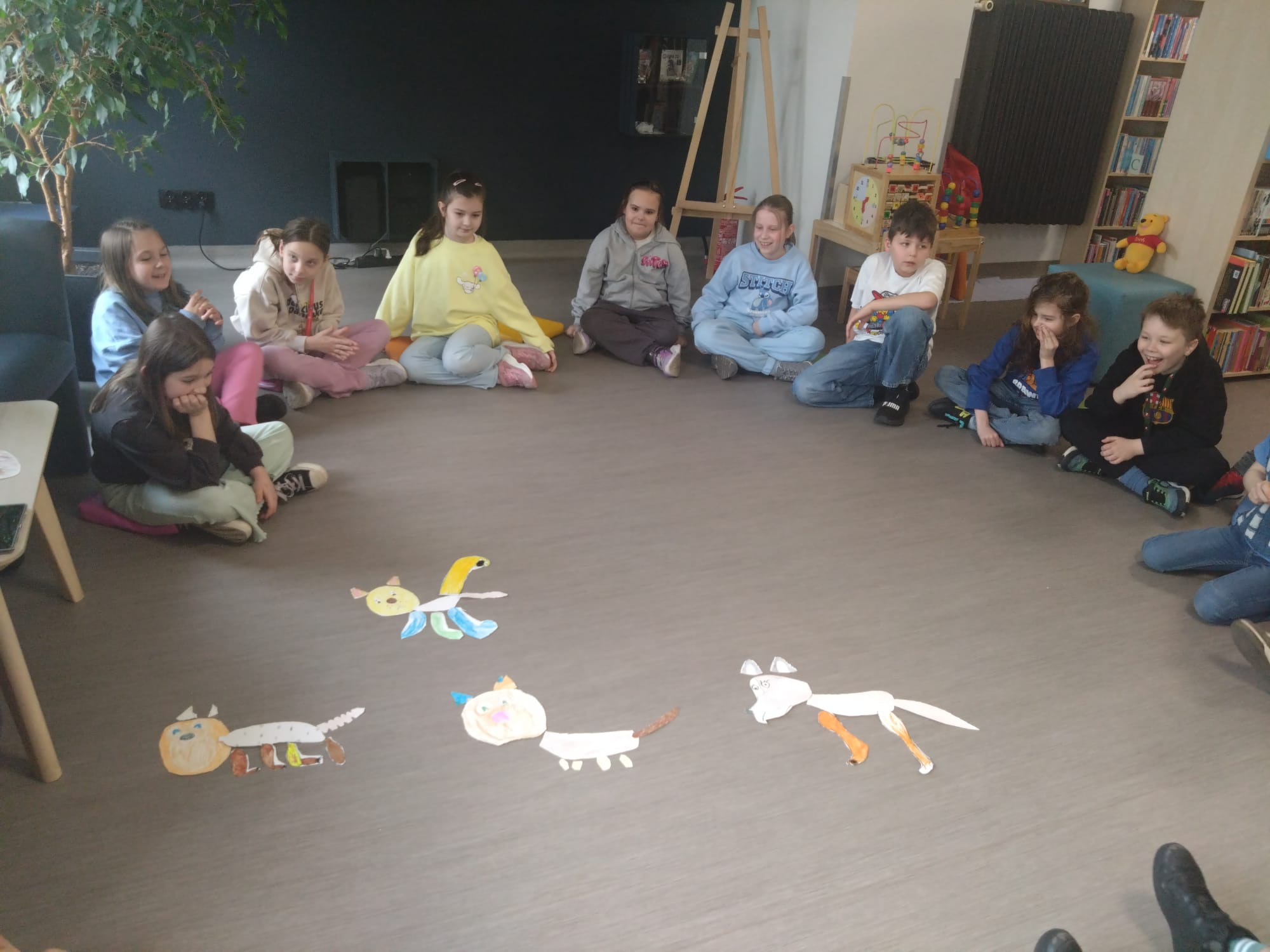 Na zakończenie zajęć uczniowie zostali podzieleni na grupy i każda z nich miała za zadanie przygotować inną część ciała psa. Powstały więc uszy, łapy, ogon, tułów i pyszczek – a następnie cała klasa wspólnie złożyła je w jedną dużą, kolorową sylwetkę psa. Efekt końcowy wywołał ogromną radość i dumę.