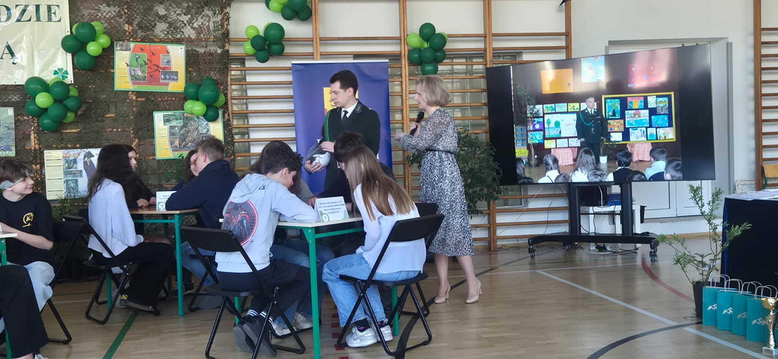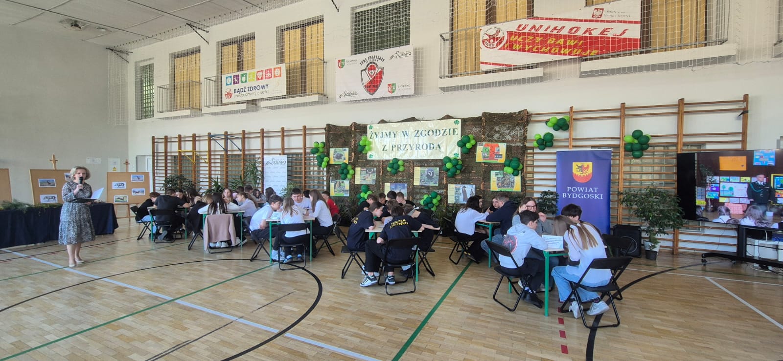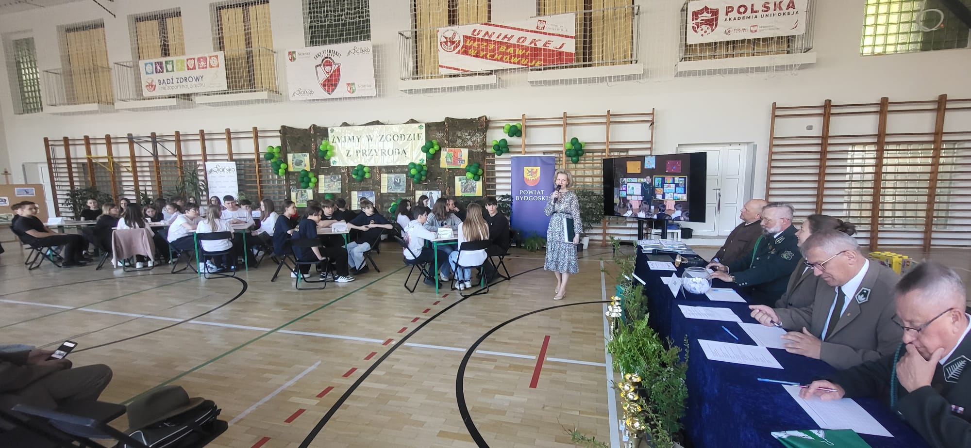 Z okazji Światowego Dnia Ziemi 2026, nasza szkoła wzięła udział w Jubileuszowej X edycji Powiatowego Konkurs Wiedzy Ekologicznej „Żyjmy w zgodzie z przyrodą”, którego celem jest uświadomienie dzieciom i młodzieży roli ochrony przyrody, stworzenie możliwości zdobywania wiedzy w praktyce, kształtowanie właściwych postaw, wartości i przekonań. Wśród zaproszonych gości znaleźli się: p. Benedykt Sadowski - inżynier nadzoru Nadleśnictwa Bydgoszcz, p. Beata Piesik - leśniczy Nadleśnictwa Żołędowo, p. Przemysław Suchomski – leśniczy Leśnictwa Osowa, p. Paweł Toczko - przewodniczący ORŁ w Bydgoszczy, p. Jan Pawlak i p. Mariusz Trudnowski - członkowie Komisji Współpracy z Młodzieżą Szkolną ORŁ w Bydgoszczy, p. Tomasz Pinkowski – członek zespołu sygnalistów „Złoty Róg” w Bydgoszczy. Finaliści konkursu zmagali się z różnorodnymi zadaniami z zakresu szeroko pojętej wiedzy przyrodniczej i podstawowych zagadnień dotyczących ochrony środowiska i ochrony przyrody.