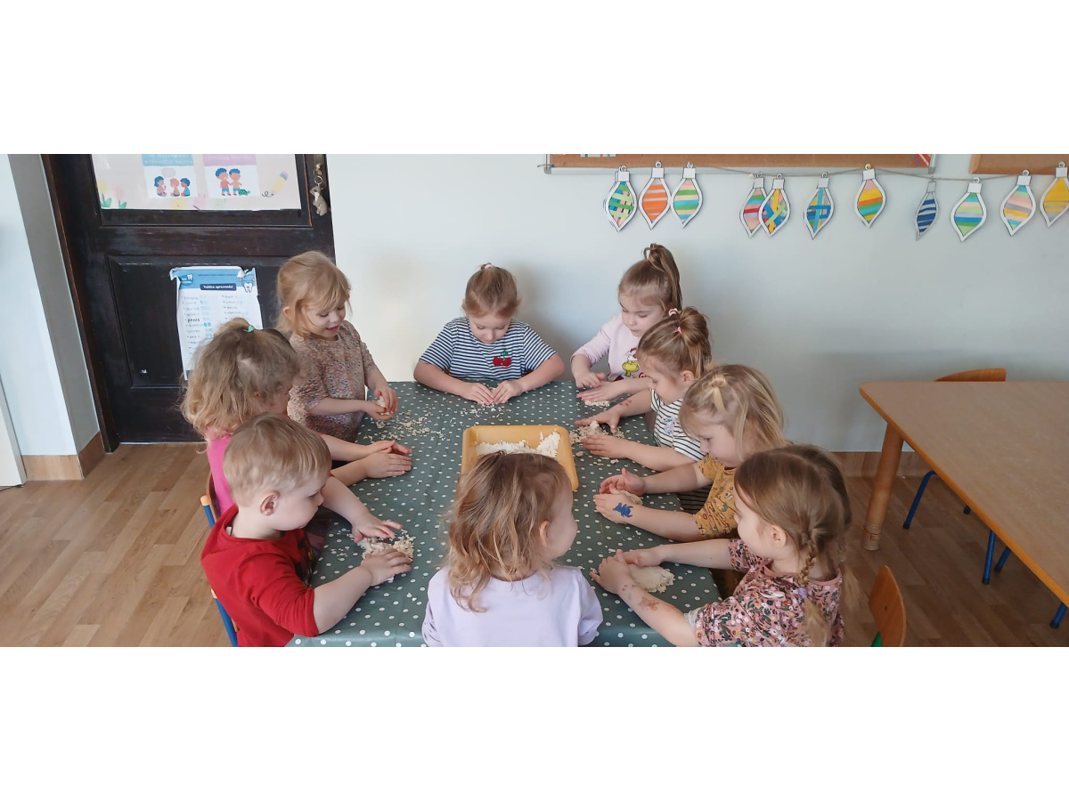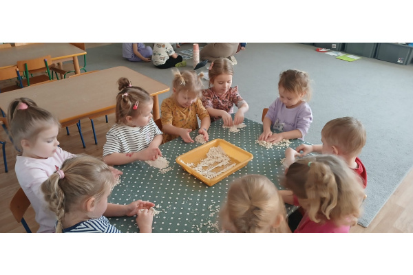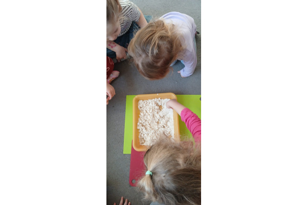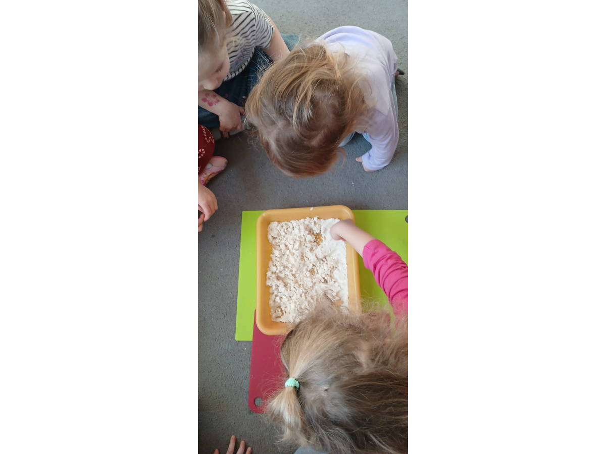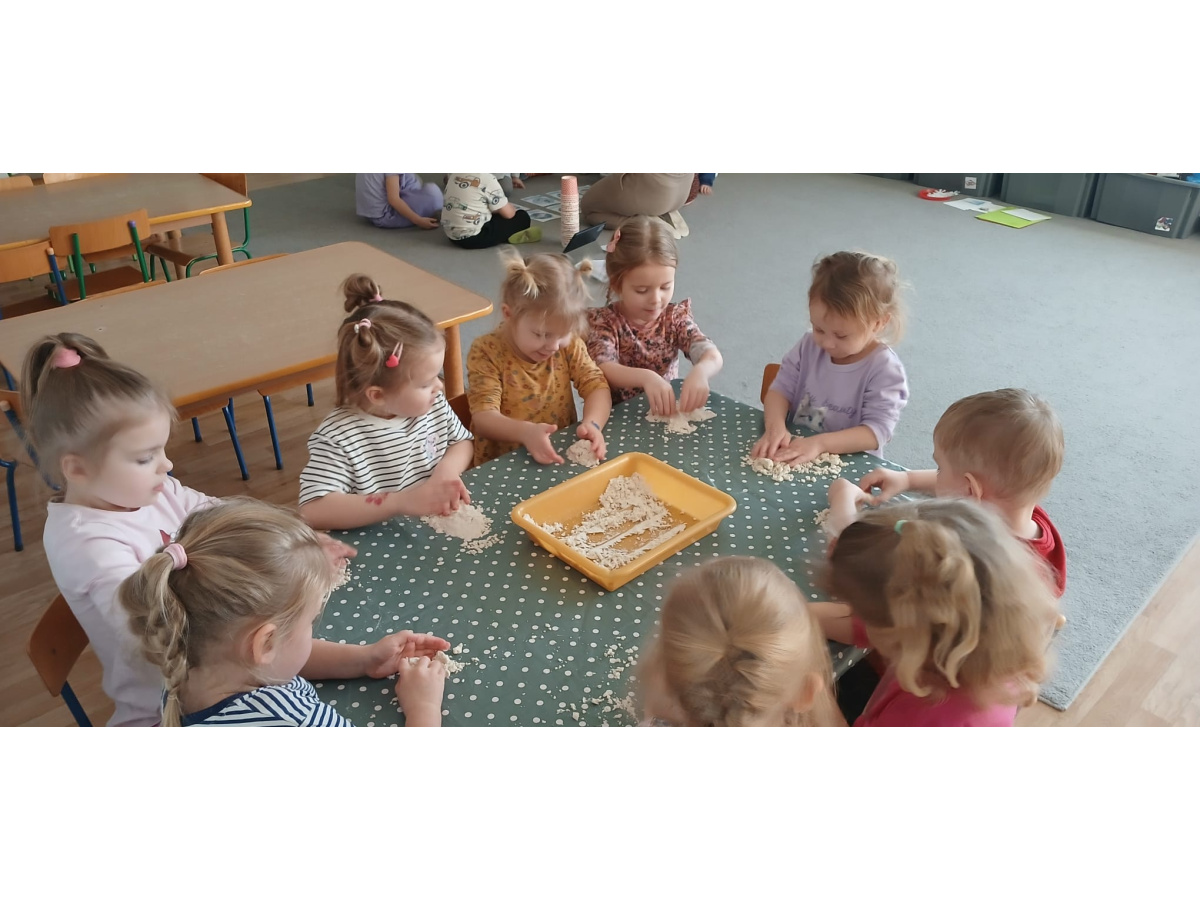 Na zakończenie zajęć przyszedł czas na swobodną zabawę masą sensoryczną, podczas której dzieci mogły rozwijać wyobraźnię, kreatywność oraz zmysł dotyku.
