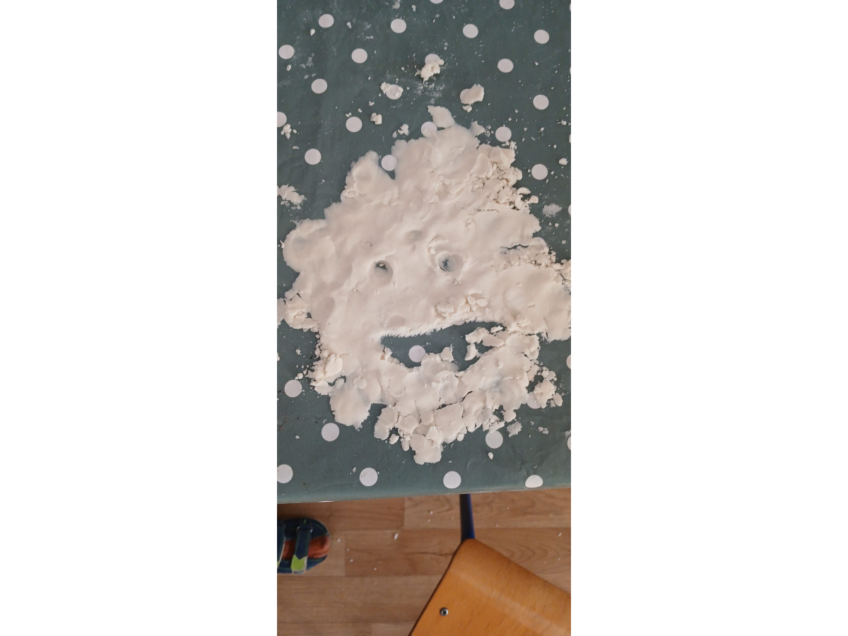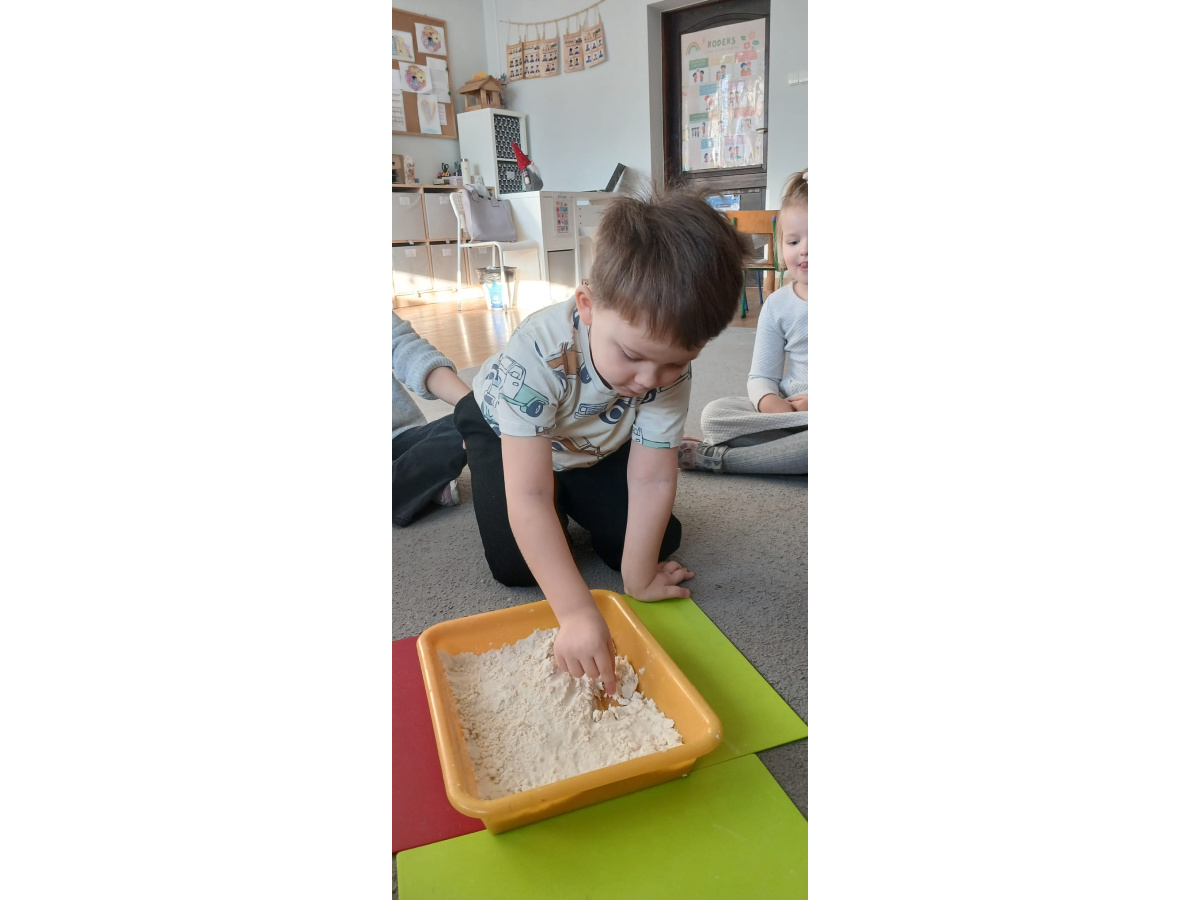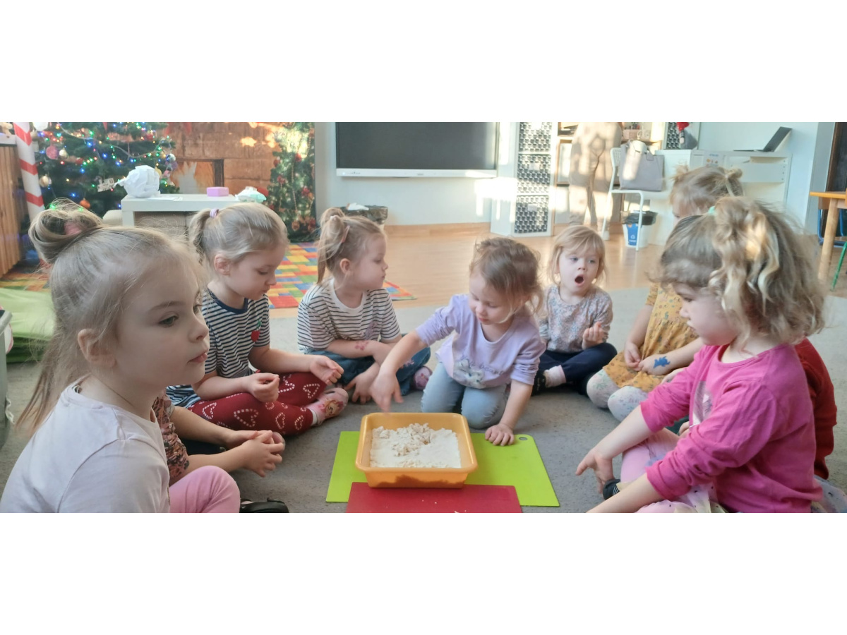 Na zakończenie zajęć przyszedł czas na swobodną zabawę masą sensoryczną, podczas której dzieci mogły rozwijać wyobraźnię, kreatywność oraz zmysł dotyku.