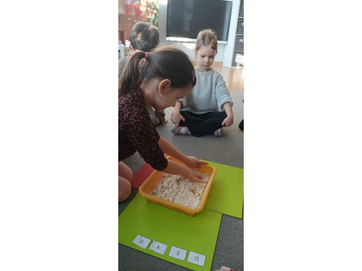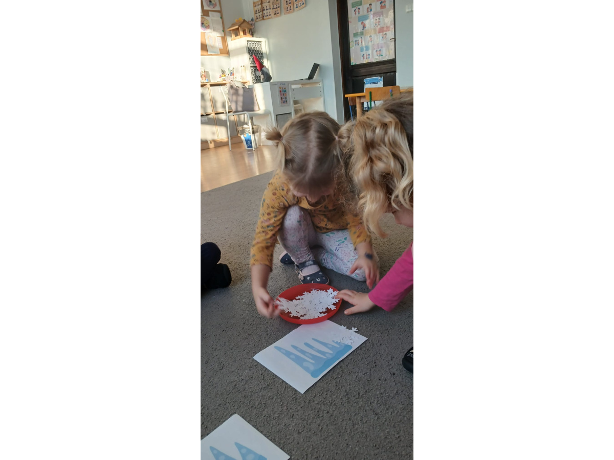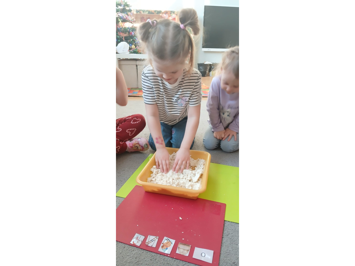 W „śniegu” dzieci szukały ukrytych obrazków, nazywały je i dzieliły ich nazwy na sylaby. Starsze przedszkolaki dodatkowo wyszukiwały literki, doskonaląc swoje umiejętności językowe i spostrzegawczość.