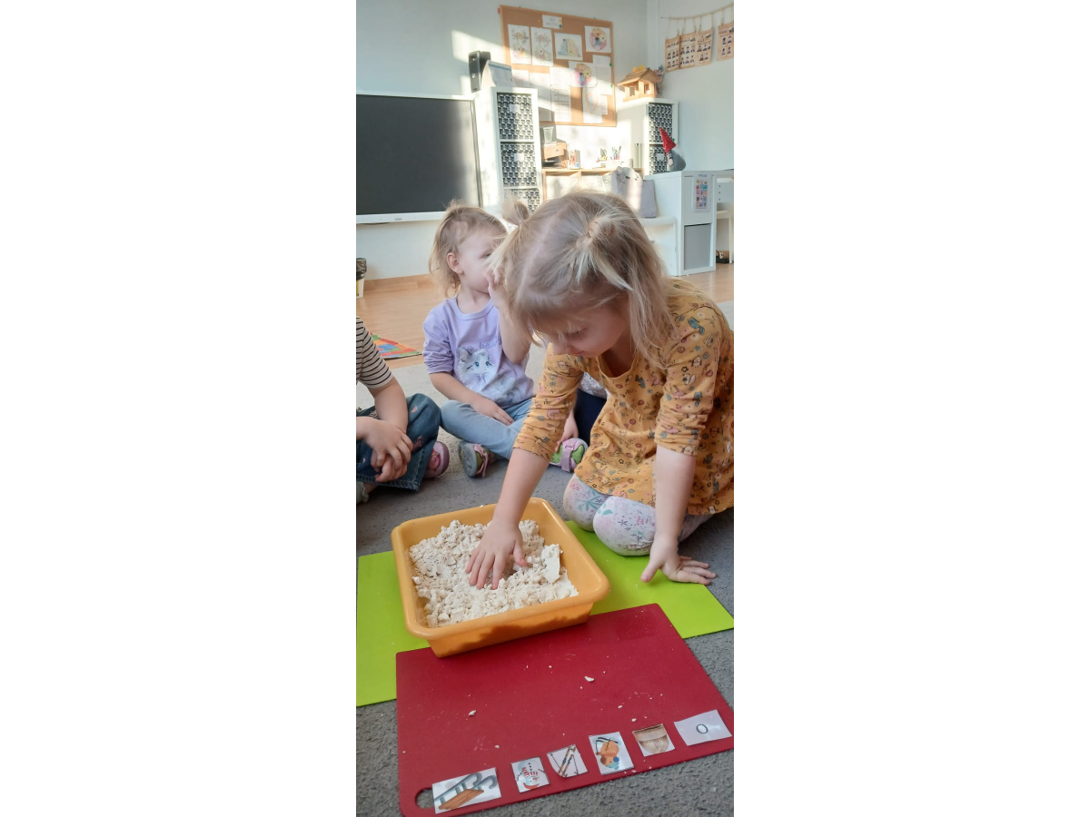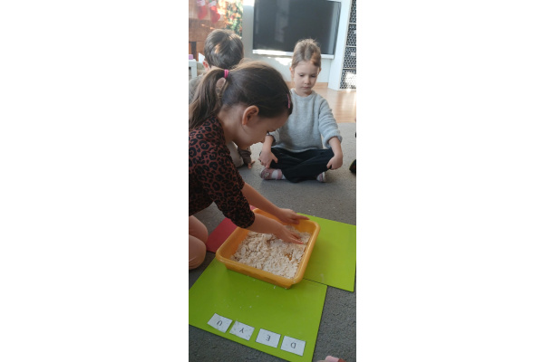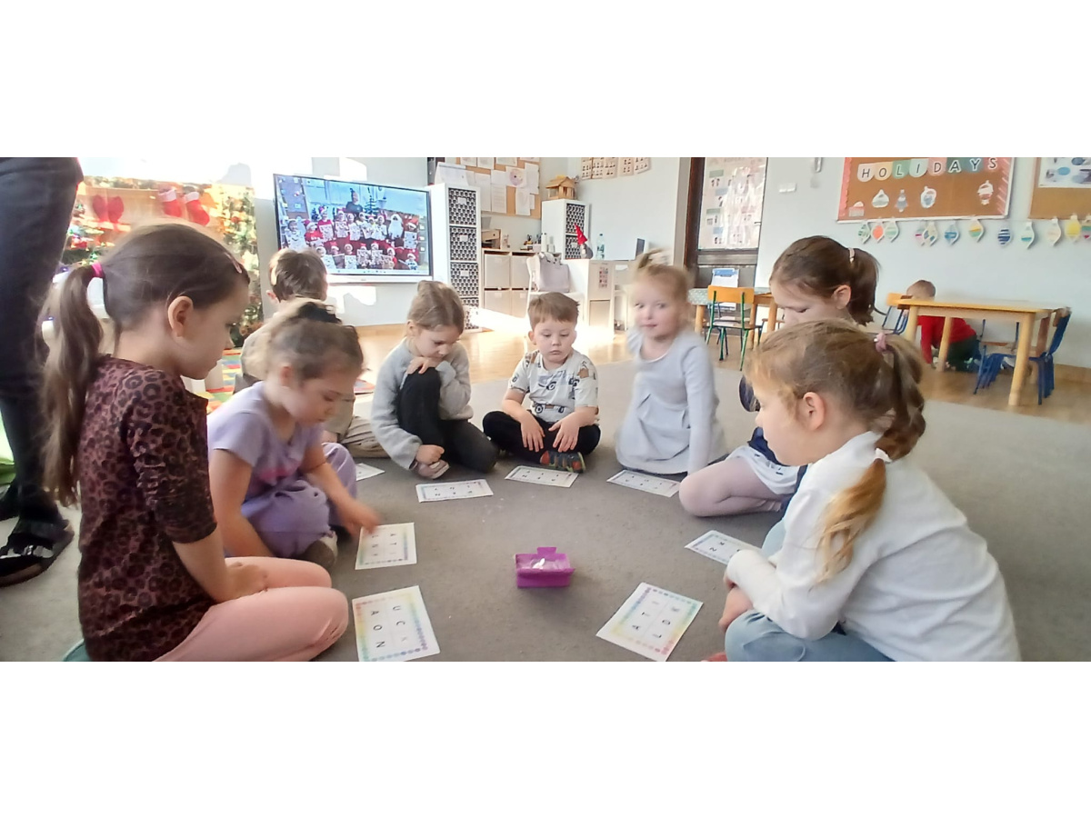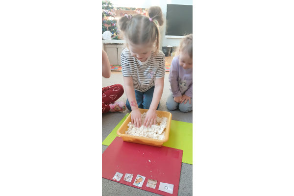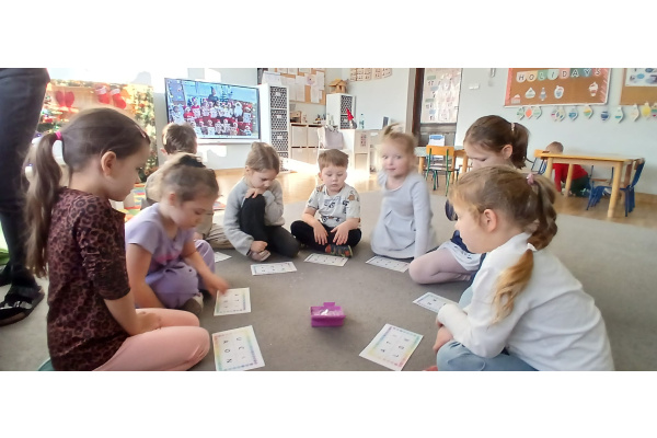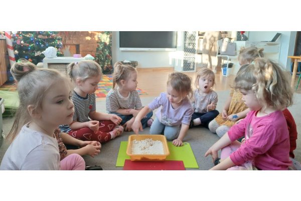 W „śniegu” dzieci szukały ukrytych obrazków, nazywały je i dzieliły ich nazwy na sylaby. Starsze przedszkolaki dodatkowo wyszukiwały literki, doskonaląc swoje umiejętności językowe i spostrzegawczość.